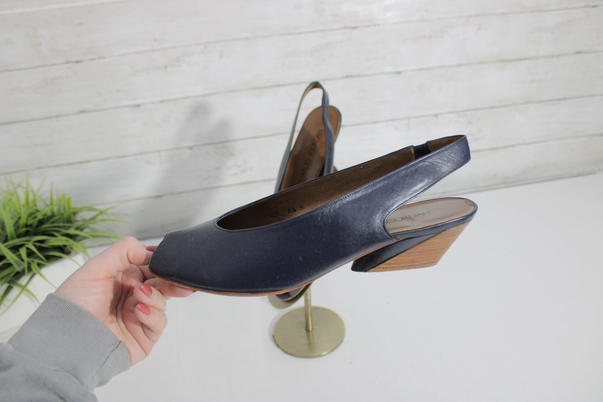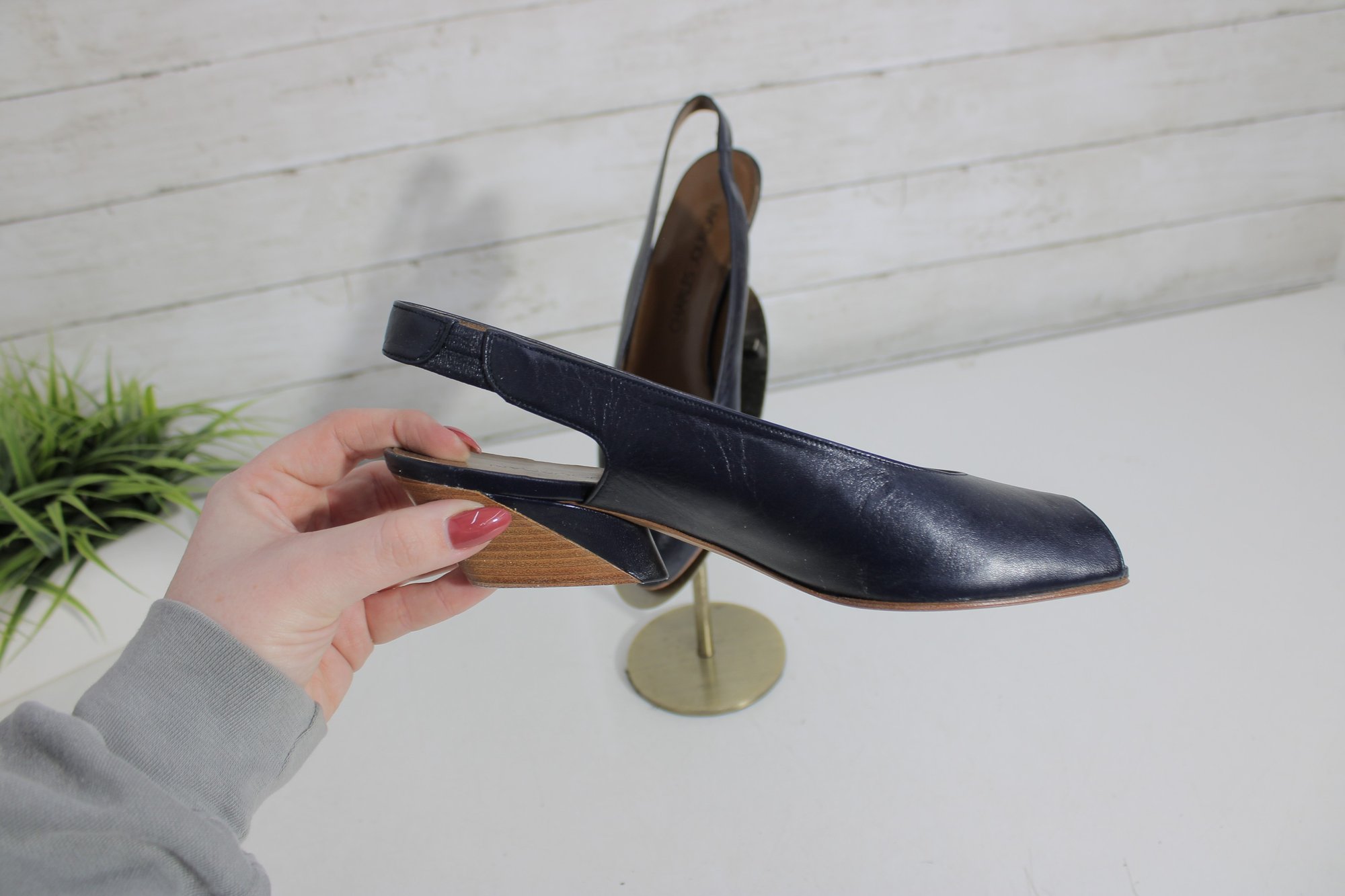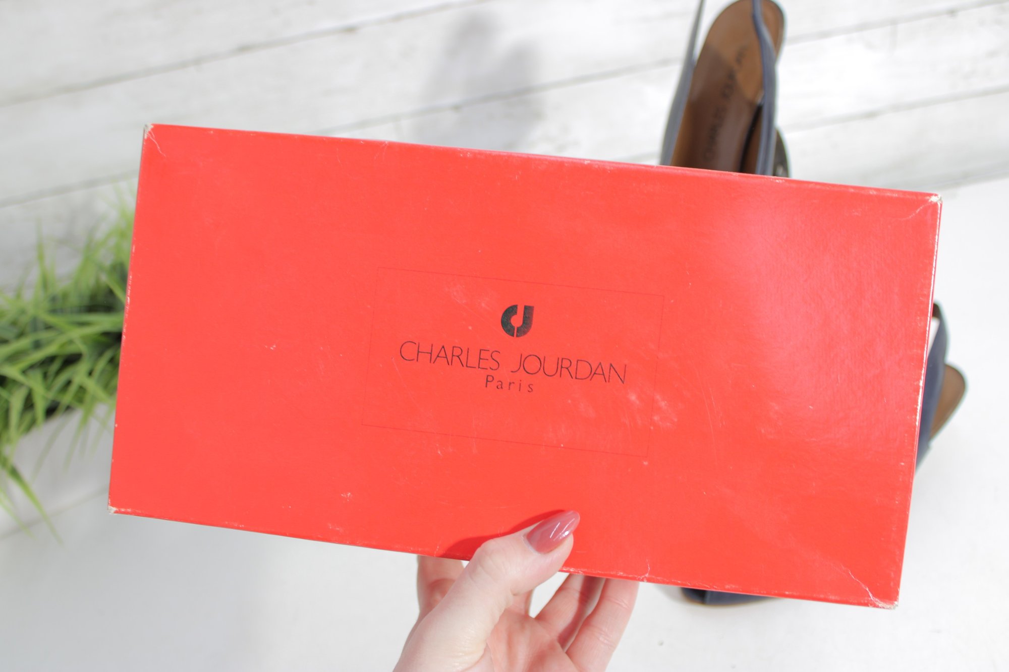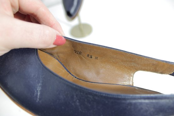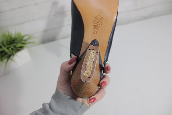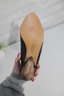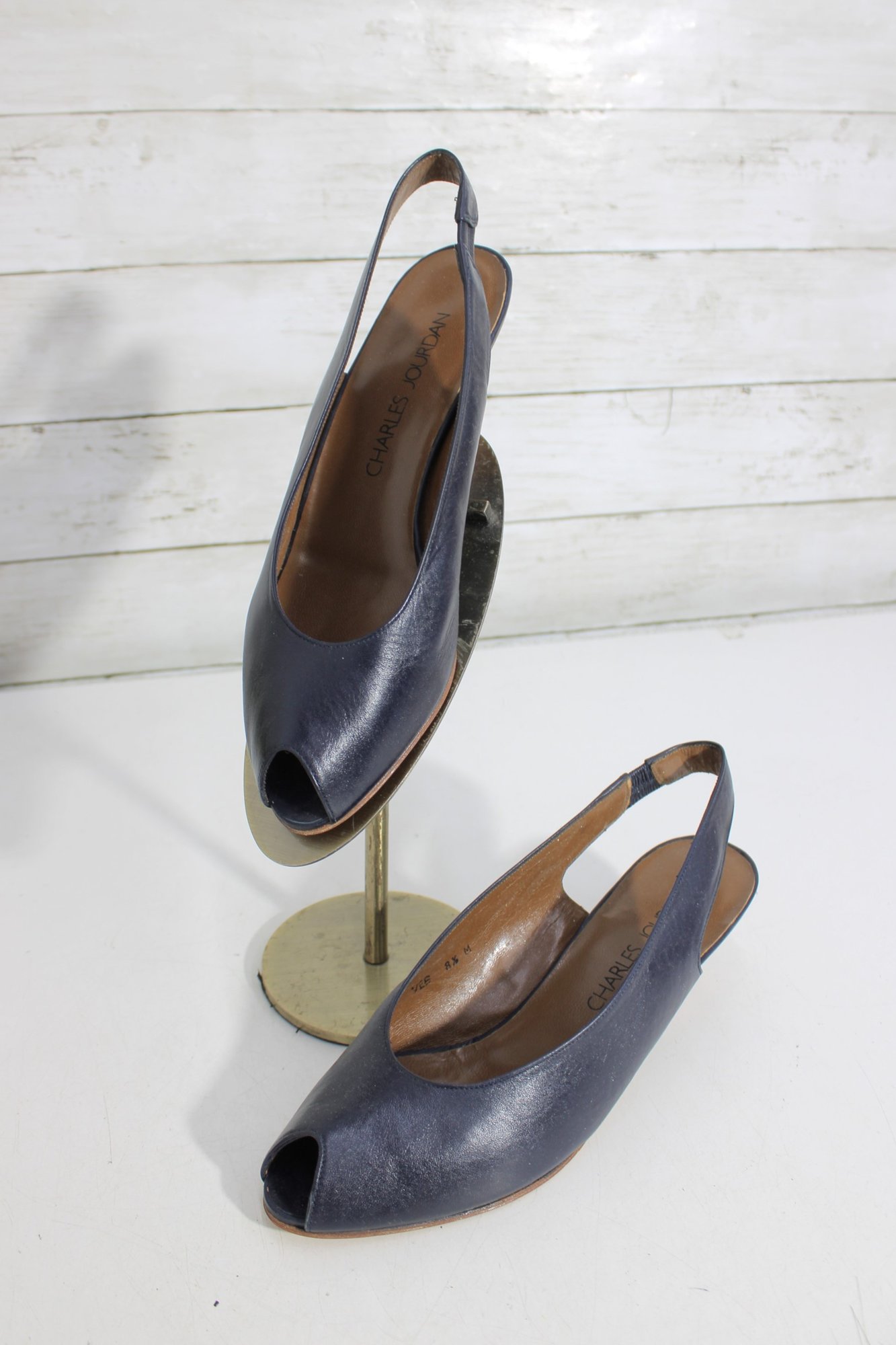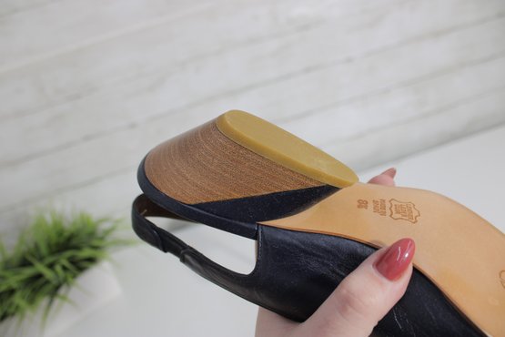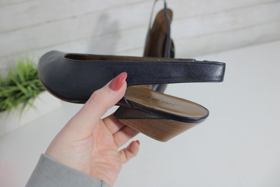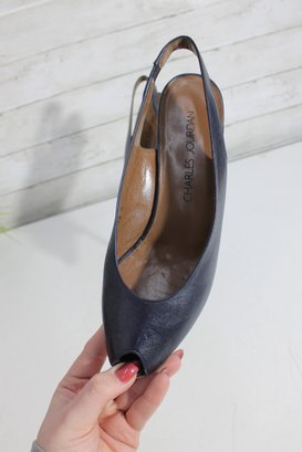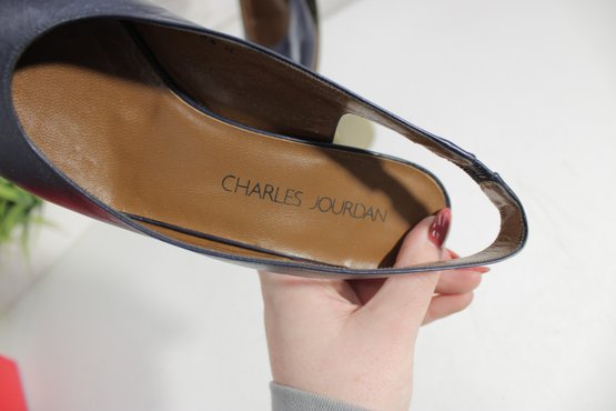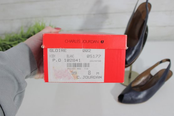 these Charles Jourdan slingback heels feature a sleek navy blue leather upper with a refined, minimalist silhouette. A versatile design that transitions easily from office wear to evening or special occasions.
