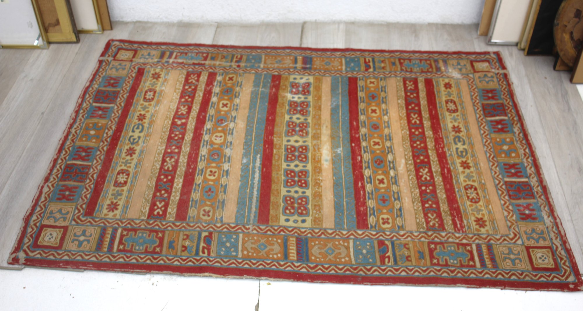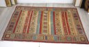handwoven area rug featuring a rich tapestry of geometric patterns and a harmonious color palette. The rug showcases a variety of symmetrical motifs, bordered by intricate guard bands that frame the central design, creating a vibrant and eye-catching aesthetic. The lively interplay of reds, blues, and golds is indicative of the rug's heritage and brings a sense of warmth and history to any room.