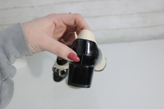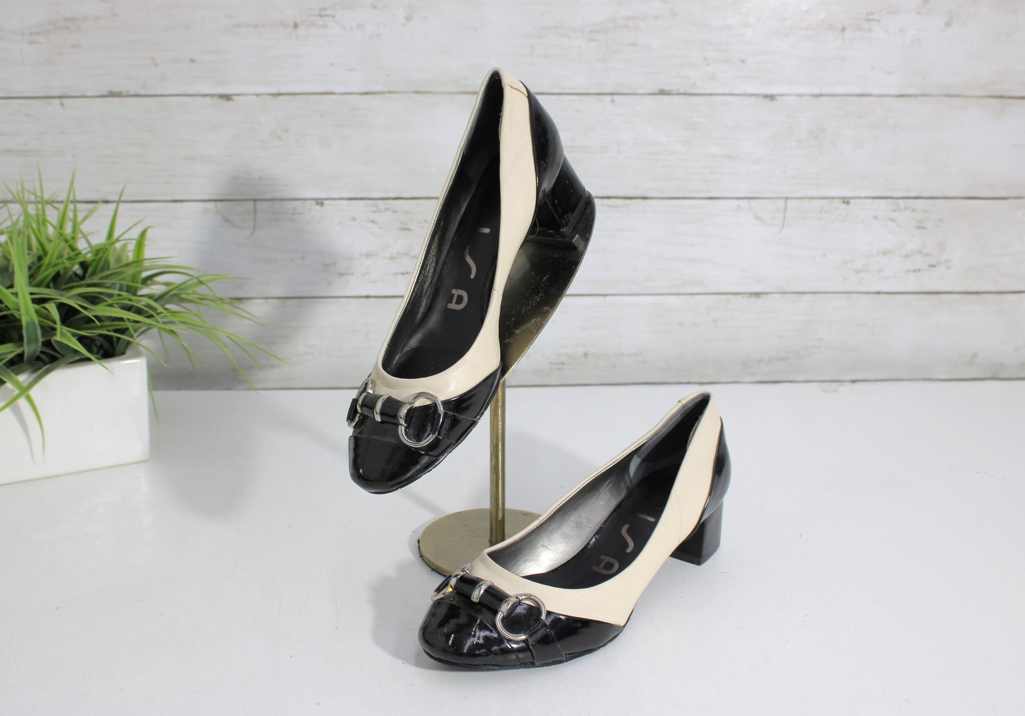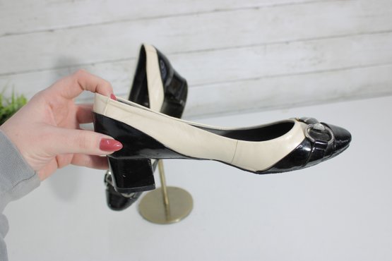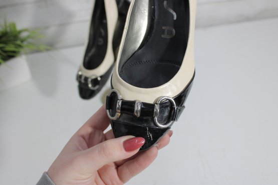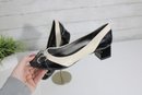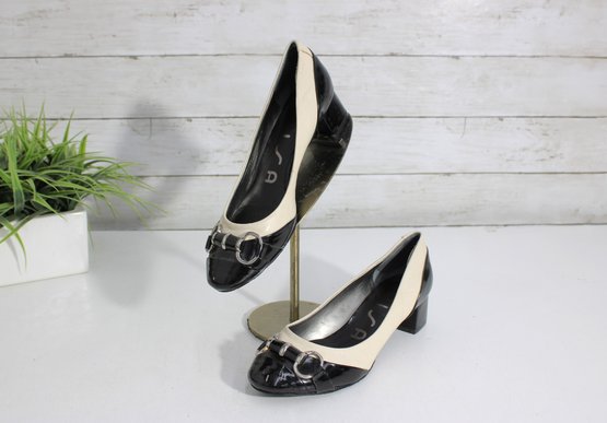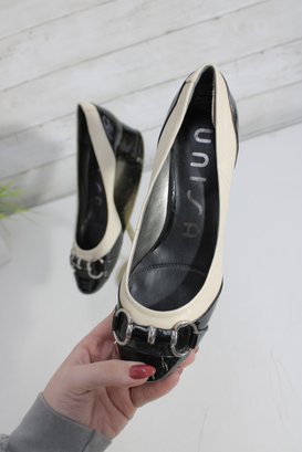 Chic and sophisticated, these Unisa pumps feature a striking black and ivory color-block design in glossy patent leather. The rounded toe is accented with a stylish buckle detail, while the comfortable block heel makes them perfect for all-day wear without sacrificing elegance.