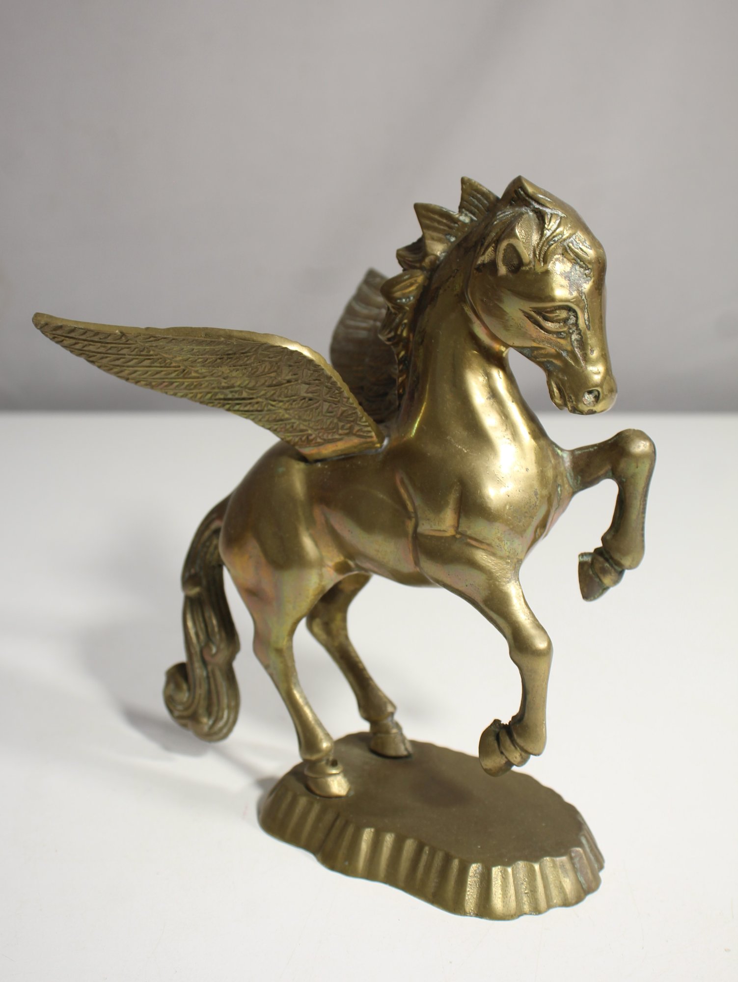 This stunning vintage brass winged Pegasus statue stands at 7.5 inches tall. Crafted with intricate details, the figure captures the majestic pose of the mythical winged horse, Pegasus, rearing up with wings spread wide. The solid brass construction gives it a weighty, substantial feel, making it a striking decorative piece for any space. There is some natural patina on the tail, adding to its vintage charm. A unique collectible for lovers of mythology and elegant brass sculptures.