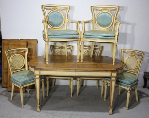 Accompanying the table are six chairs, each flaunting the same distressed finish. The chairs boast cane backrests encased in ornate wooden frames, with plush upholstered seats in a serene shade of aqua. The chairs, two of which are armchairs for the table's ends, offer both comfort and style, making them perfect for long, leisurely meals with family and friends.