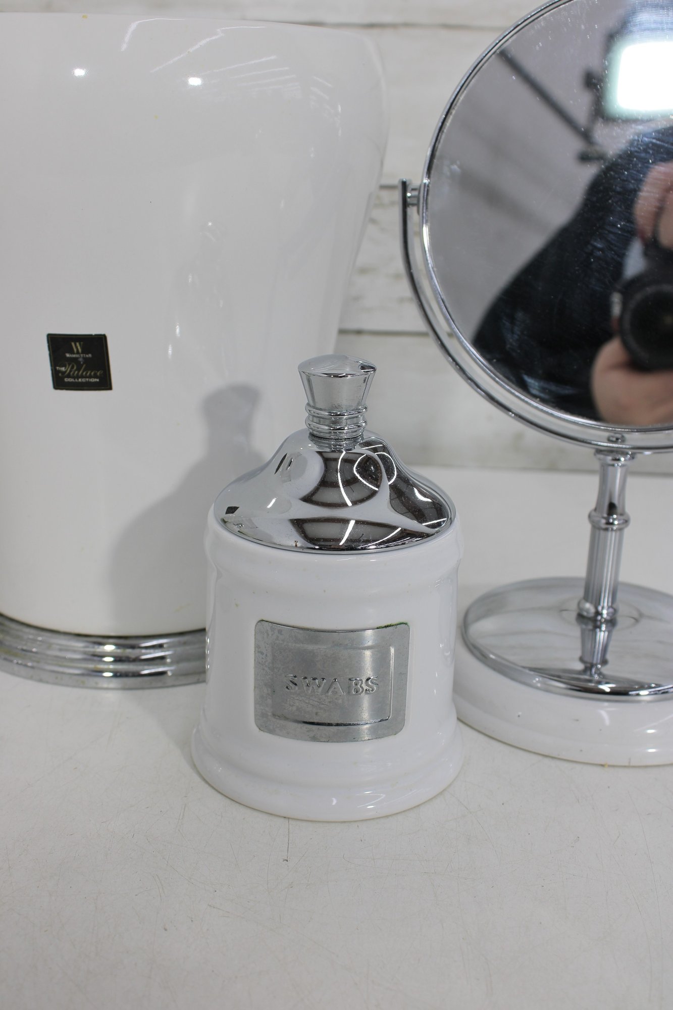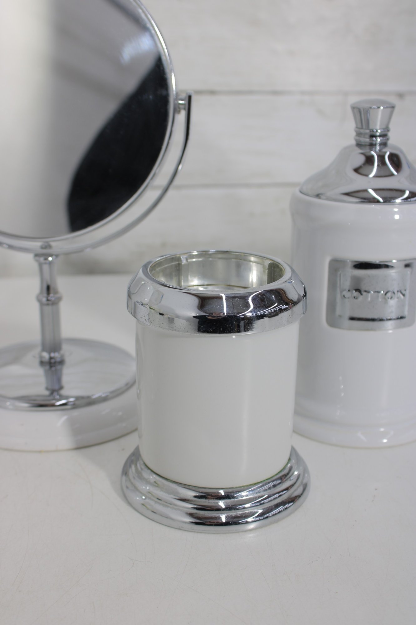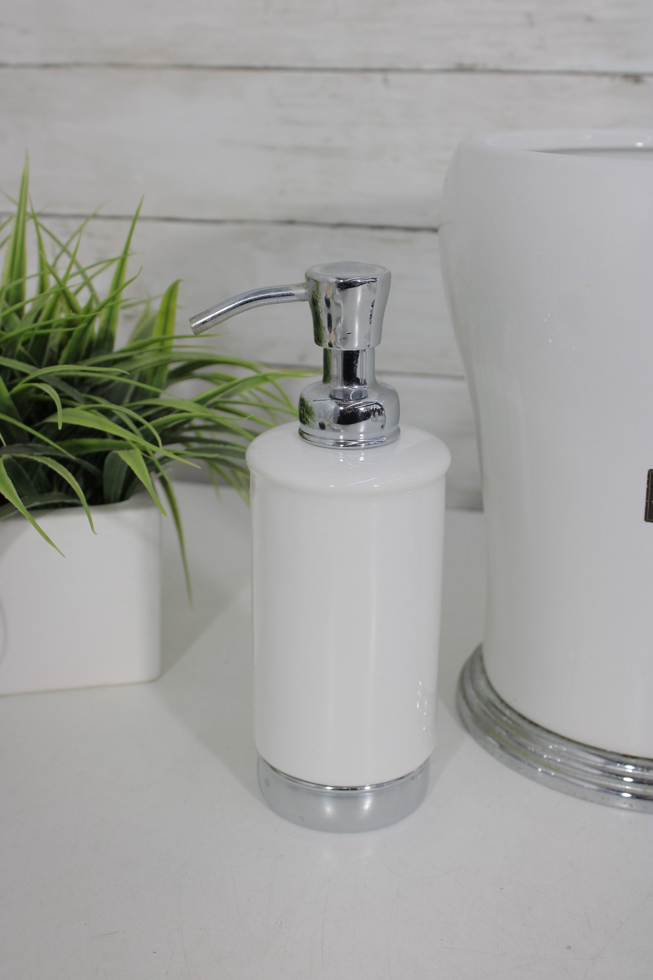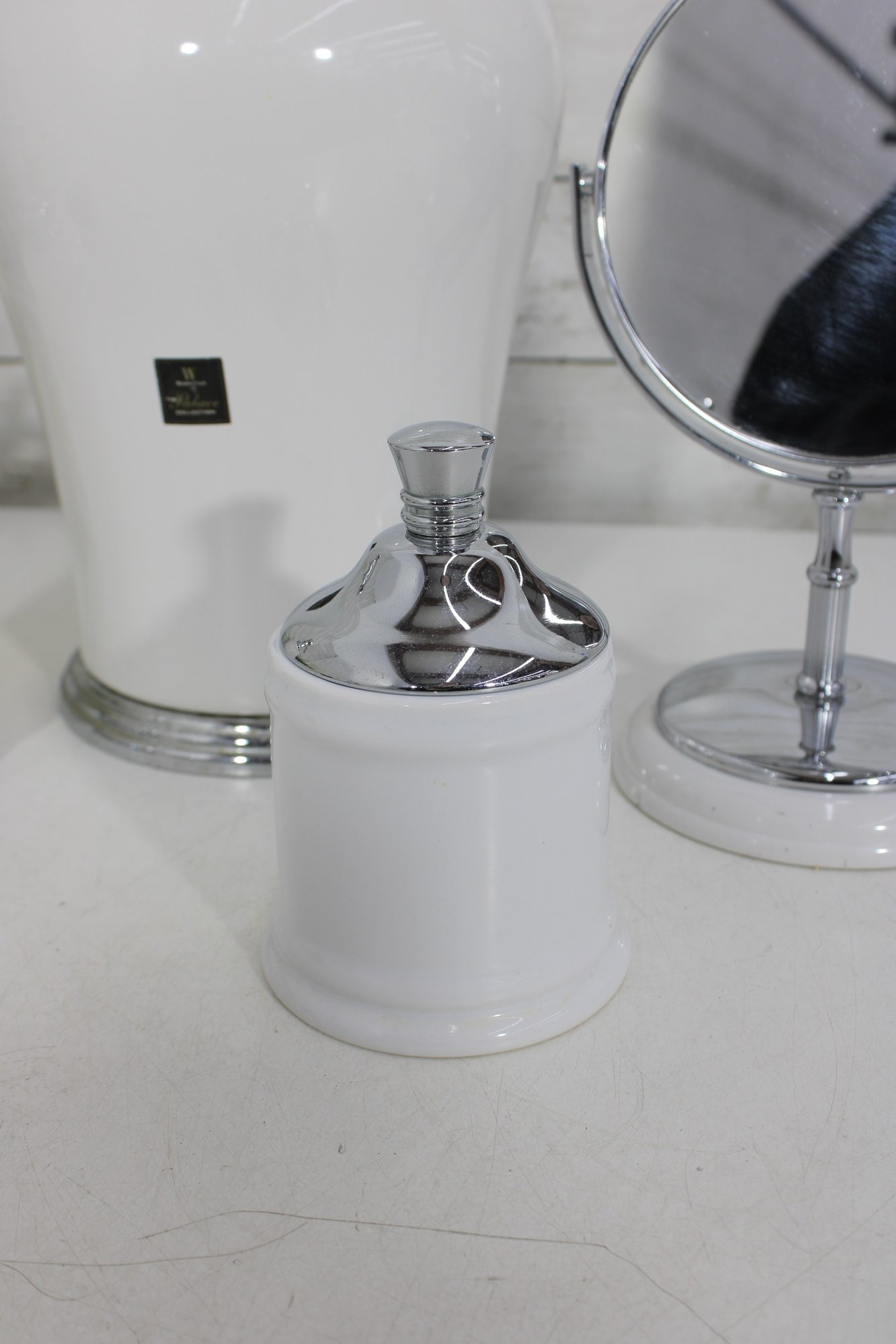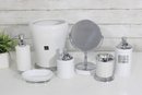 this coordinated 7-piece white and chrome bathroom accessory set. With its crisp white finish and sleek metallic accents, this collection brings a fresh, hotel-inspired feel to any bath or vanity space.