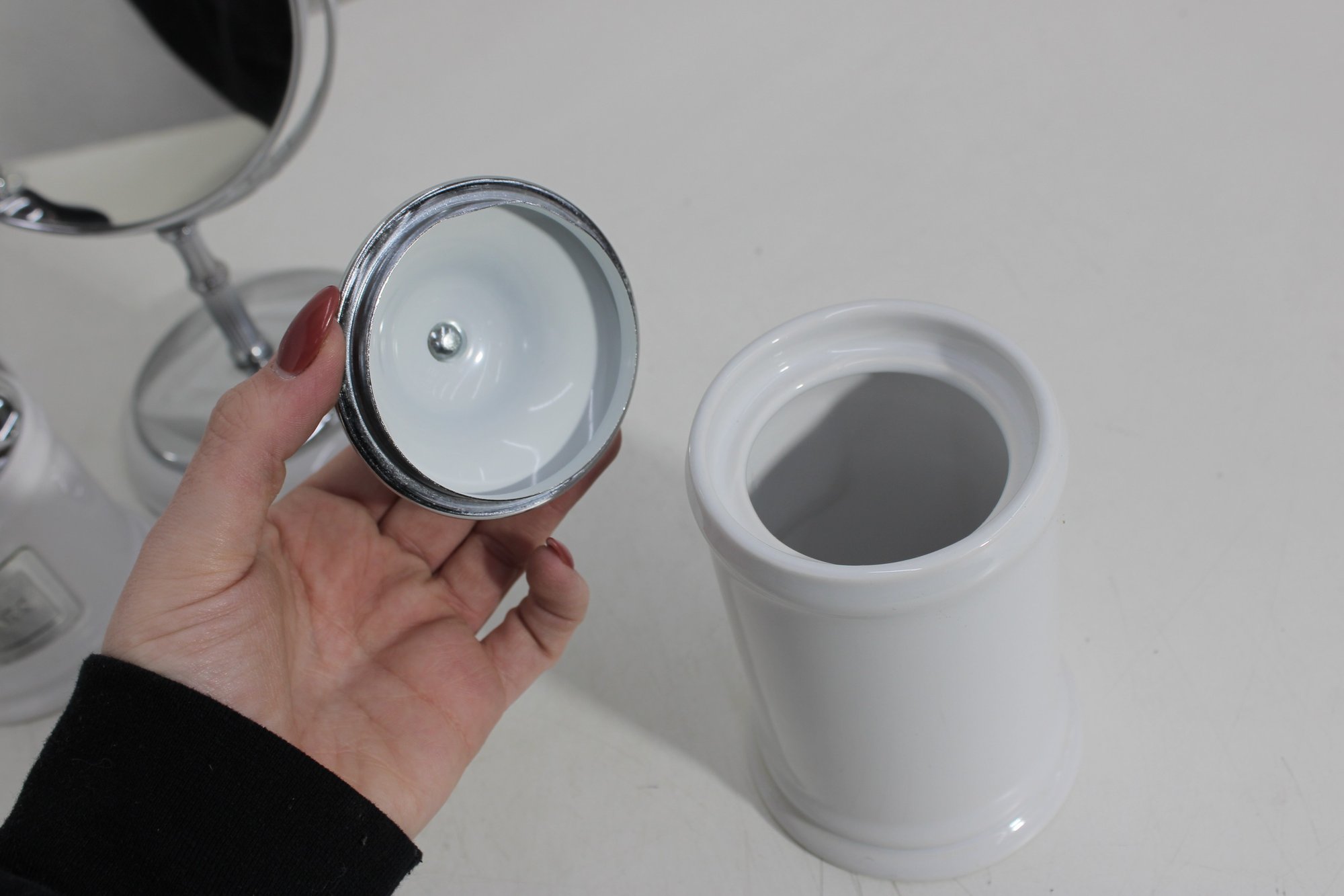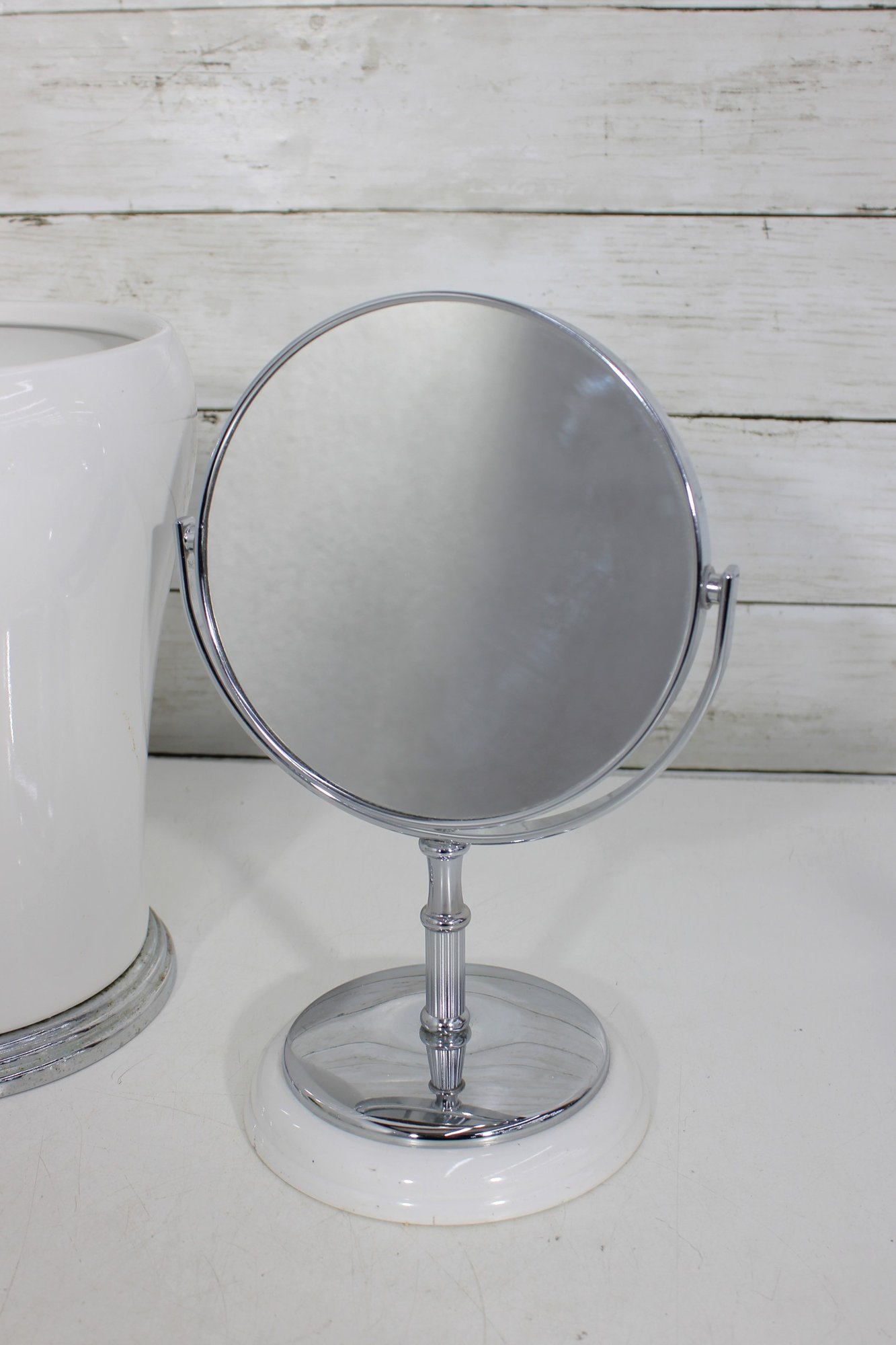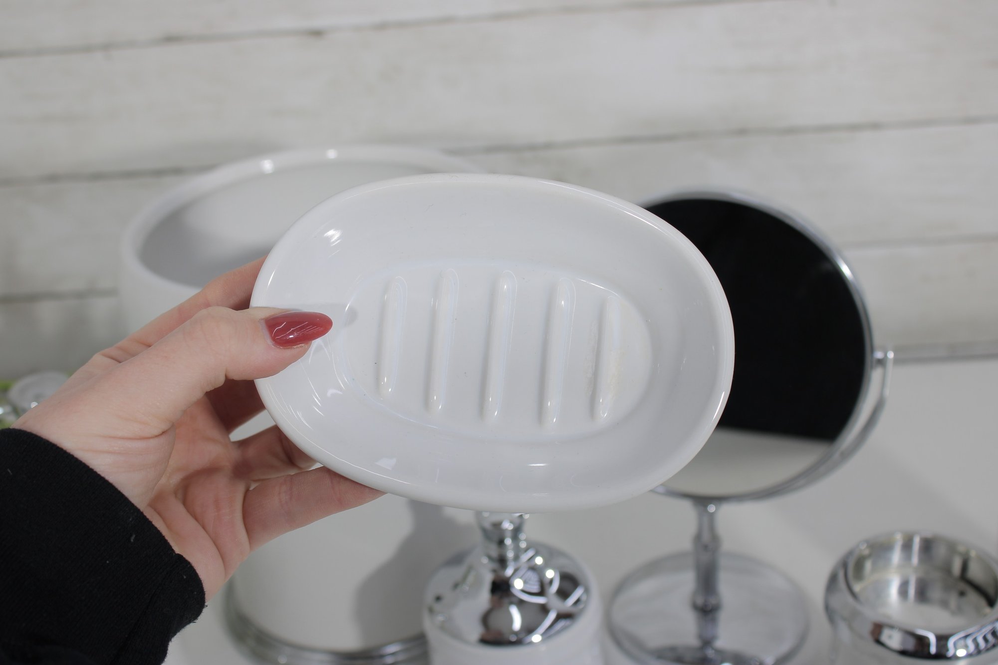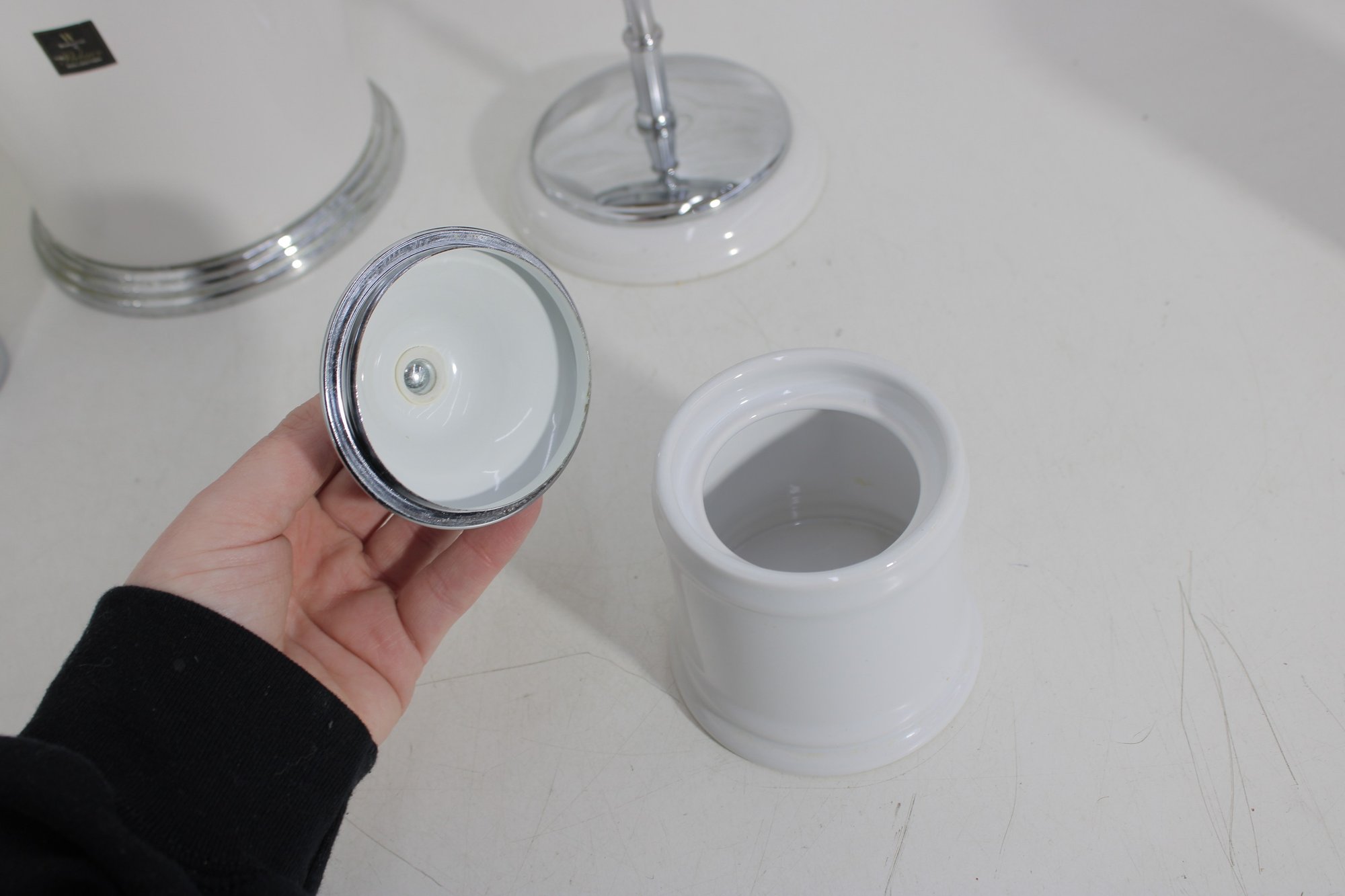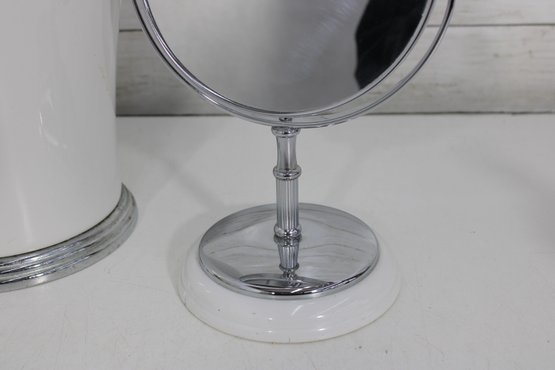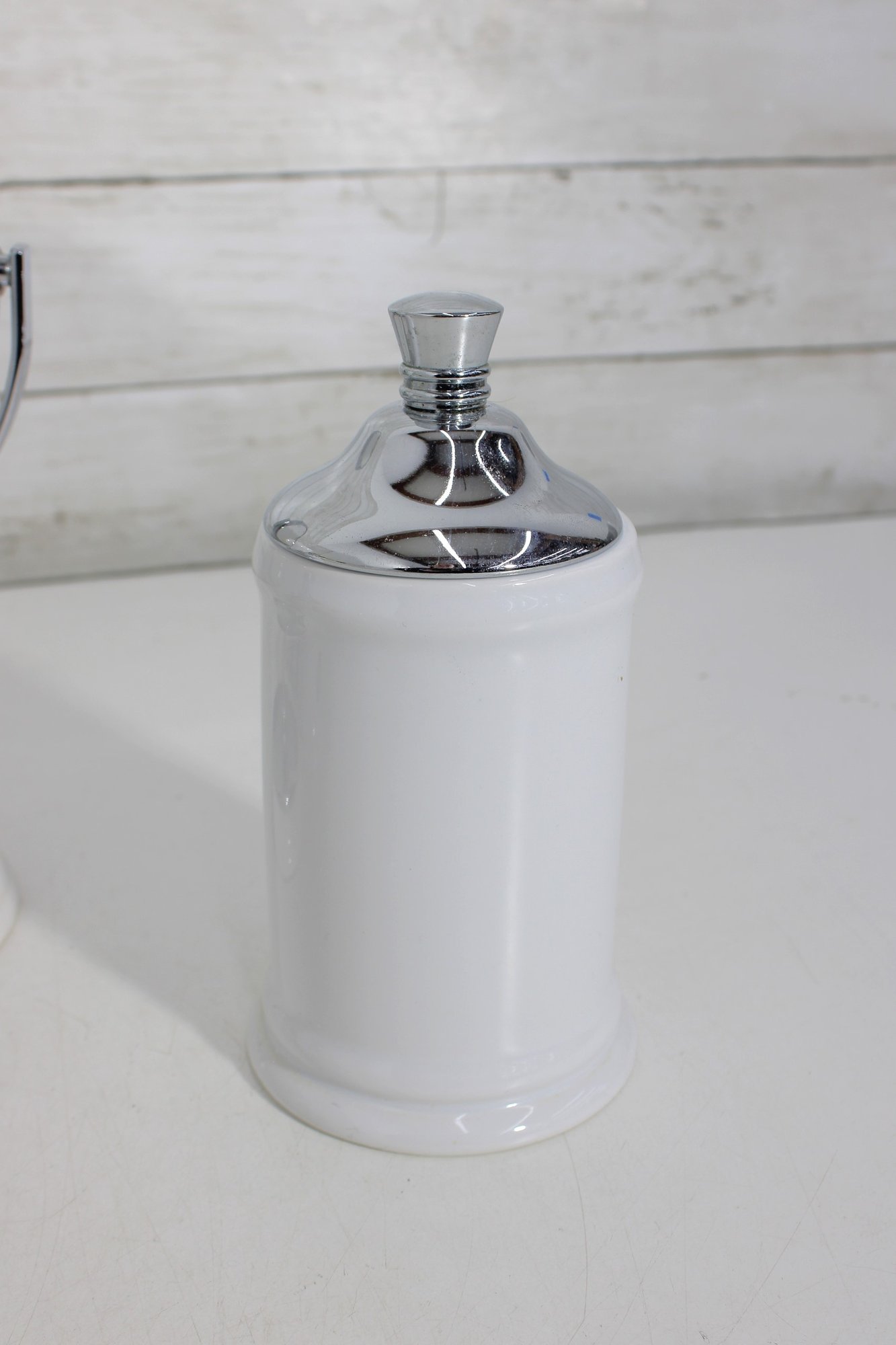 this coordinated 7-piece white and chrome bathroom accessory set. With its crisp white finish and sleek metallic accents, this collection brings a fresh, hotel-inspired feel to any bath or vanity space.