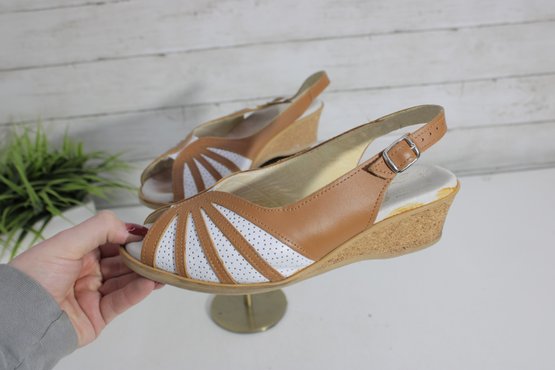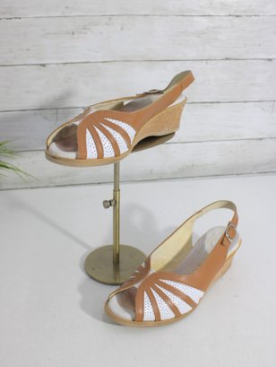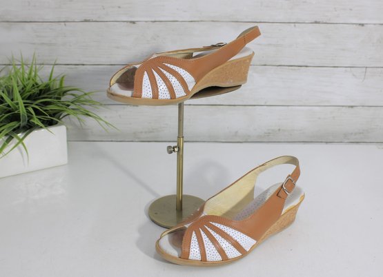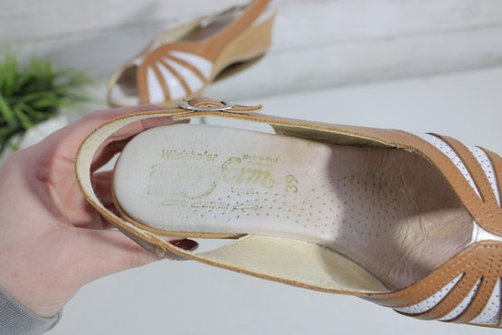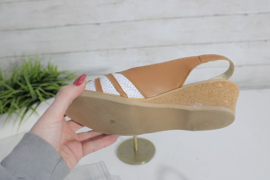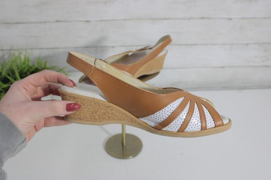 Bright, cheerful, and comfortable, these Wörishofer slingback sandals are a perfect blend of style and everyday wearability. Crafted in tan leather with white cutout accents, they feature a peep-toe front and a supportive cork-style wedge that offers height without sacrificing comfort.