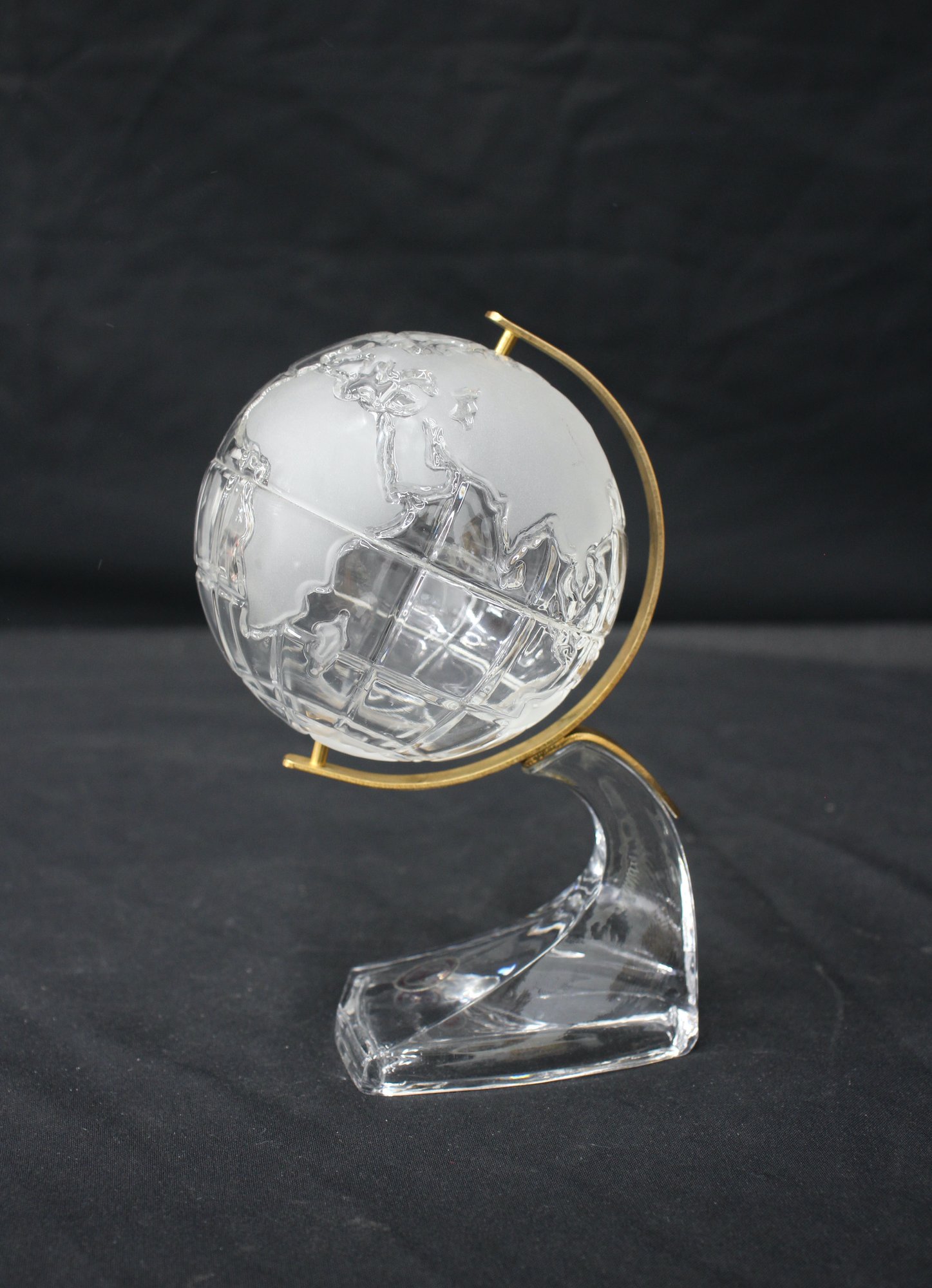 This elegant 8-inch decorative crystal globe features intricate etched details of continents, beautifully frosted to highlight its craftsmanship. The globe is supported by a sleek gold-tone axis and rests on a sturdy, clear crystal base, creating a sophisticated and timeless design.