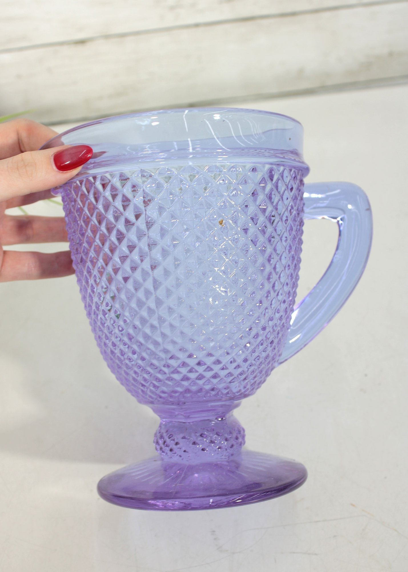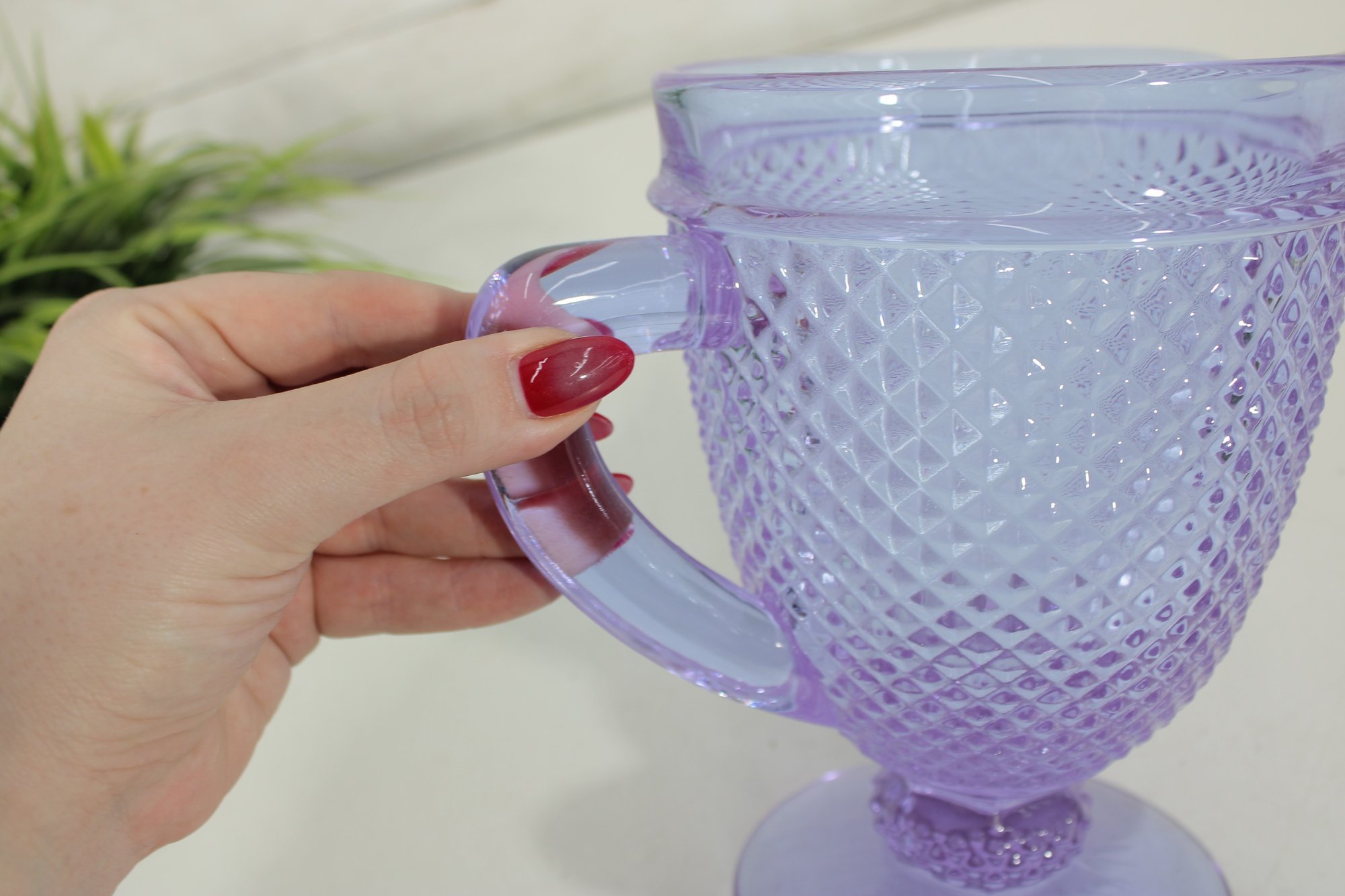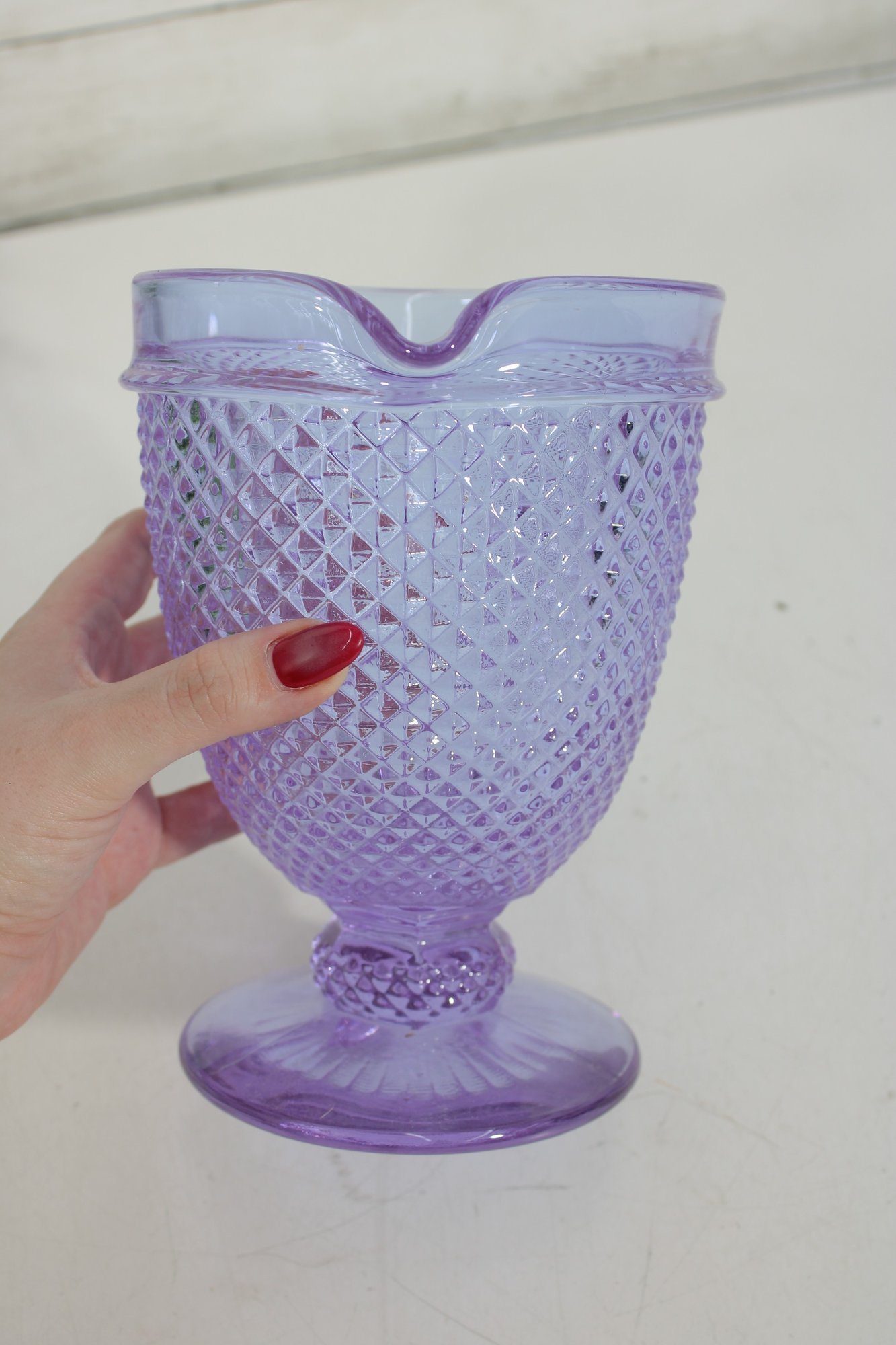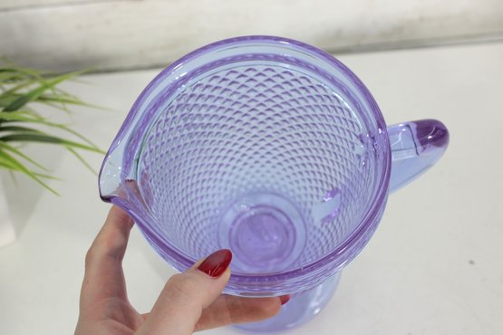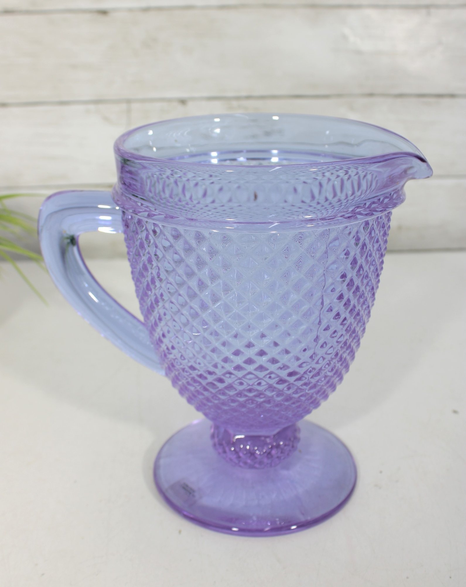 Vista Alegre Bicos Portugal Diamond Footed Amethyst Glass Pitcher combines artisanal heritage with striking design, showcasing the brand’s renowned “diamond tip” pattern for a timeless, elegant look. Its hand‑finished amethyst hue and footed base make it a collectible centerpiece that enhances any dining or bar setting.