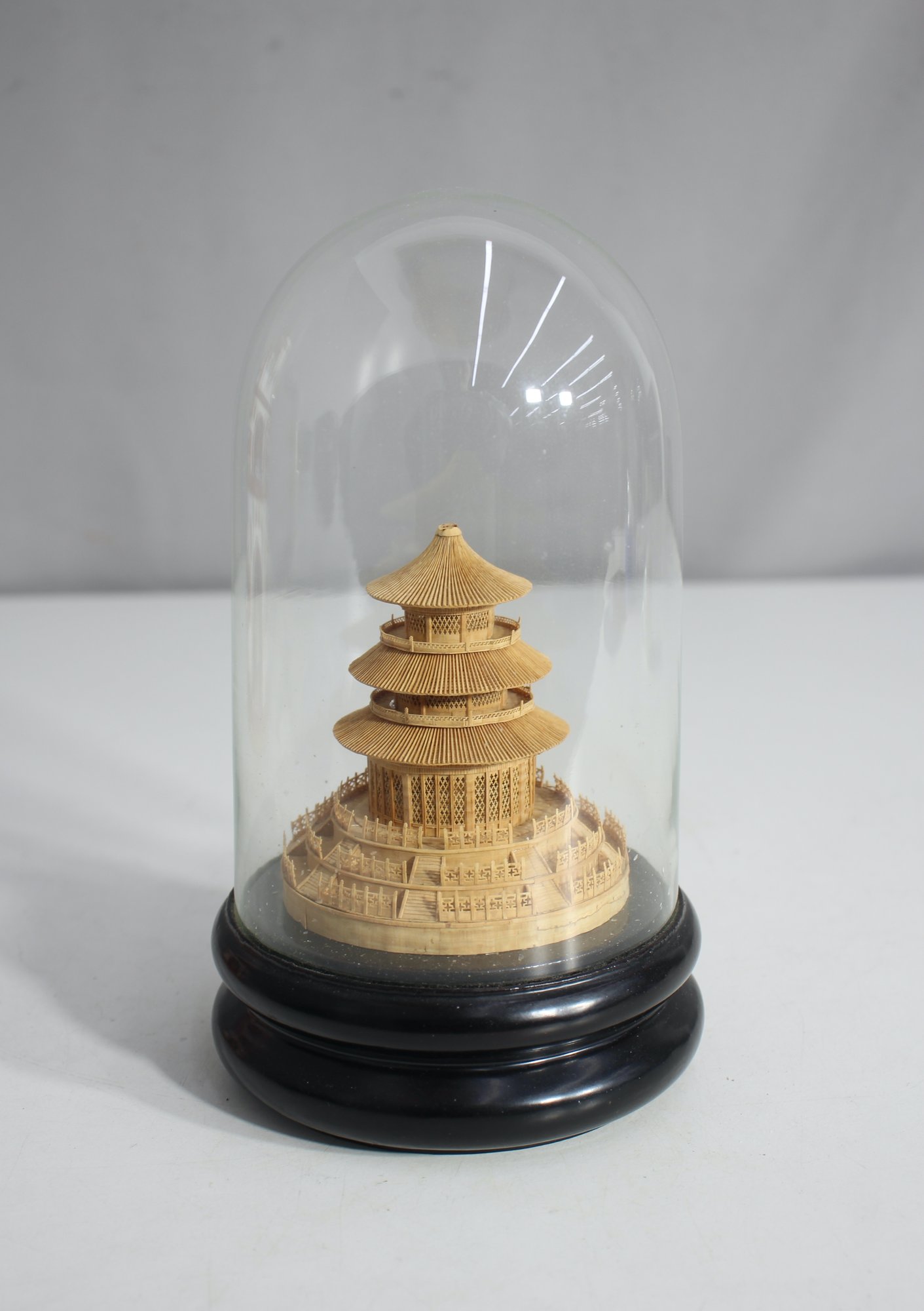 This exquisite 8-inch wooden pagoda model is a fine example of expert craftsmanship. The detailed miniature features a multi-tiered pagoda design, showcasing delicate latticework and precise architectural elements. Encased in a protective glass dome with a black lacquered wooden base, this piece combines artistry with elegance.