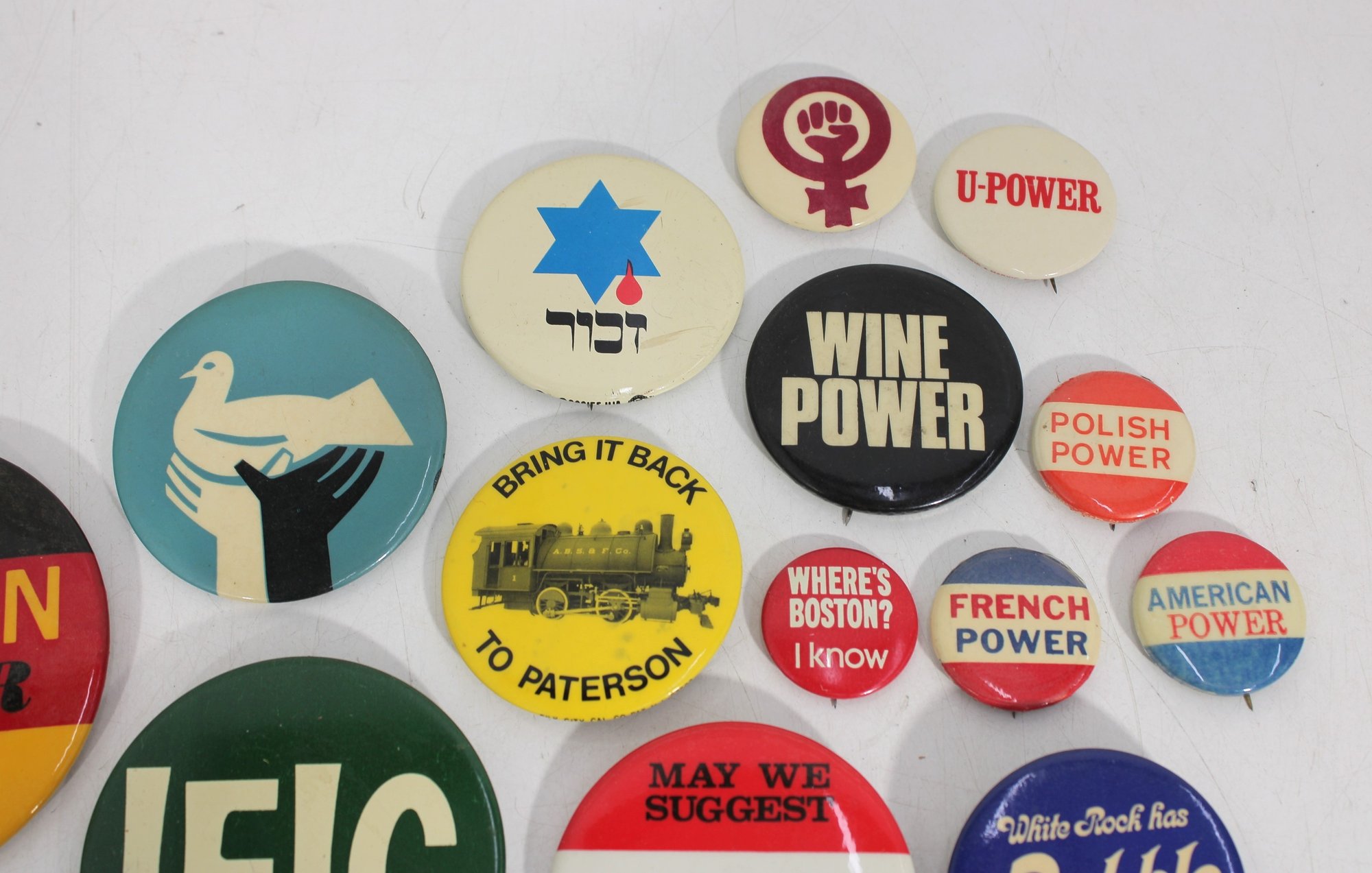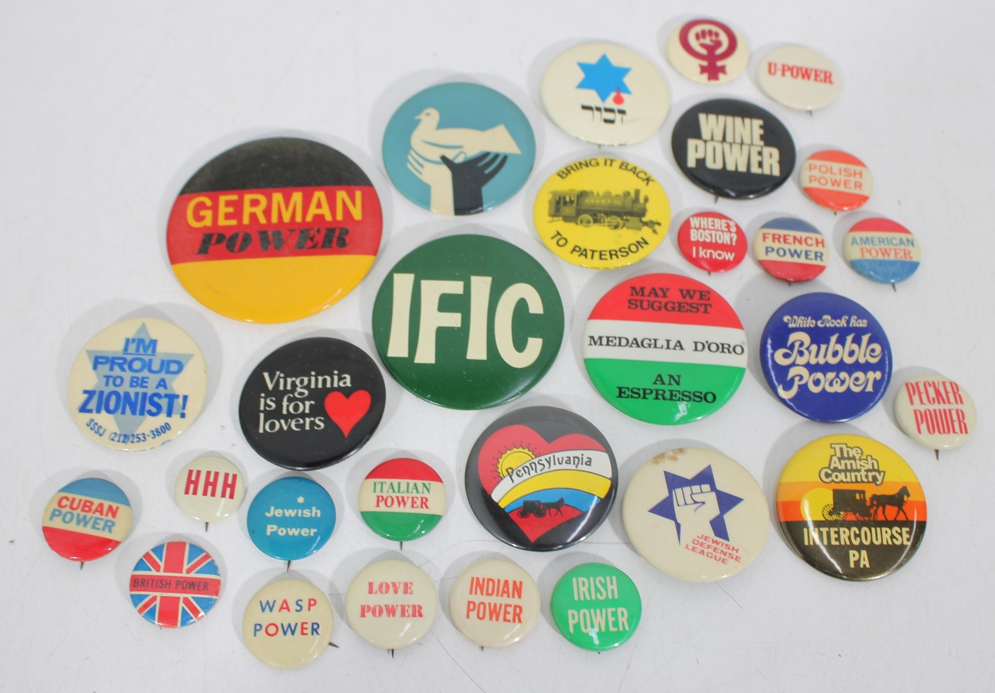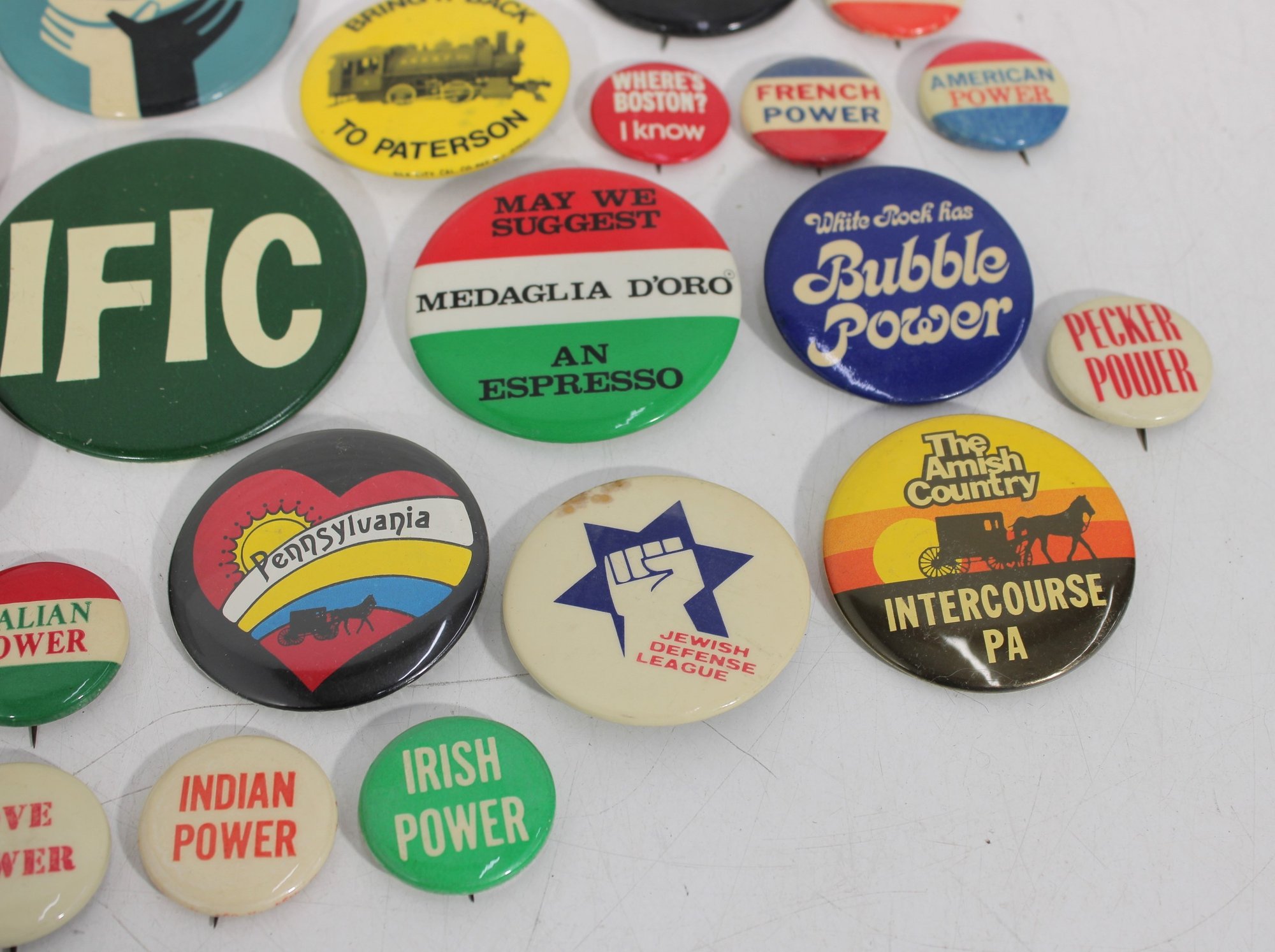 Many of the buttons in this lot feature ethnic pride slogans, including examples such as Irish Power, Italian Power, German Power, French Power, Polish Power, Indian Power, and American Power, along with other novelty and promotional designs.