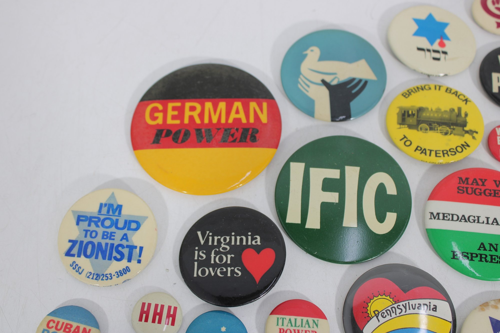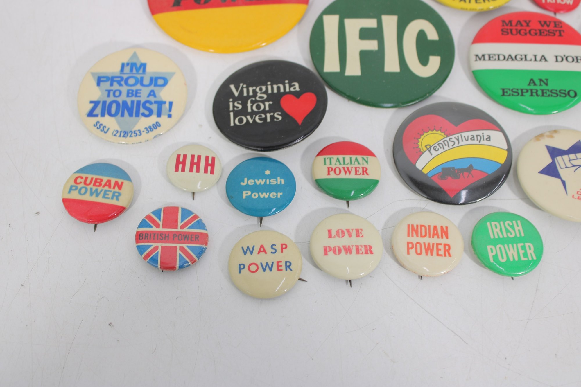 Interesting lot of vintage pinback buttons featuring a mix of ethnic pride, novelty slogans, and promotional designs. These colorful mid-to-late 20th century pins showcase bold graphics and messages that reflect social trends and cultural identity themes of the era.