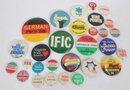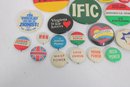 Additional buttons include a variety of graphics and messages such as “IFIC,” “Virginia Is For Lovers,” “Wine Power,” “Bring It Back to Paterson,” “Pennsylvania,” “Intercourse PA – The Amish Country,” and other unique novelty pins.