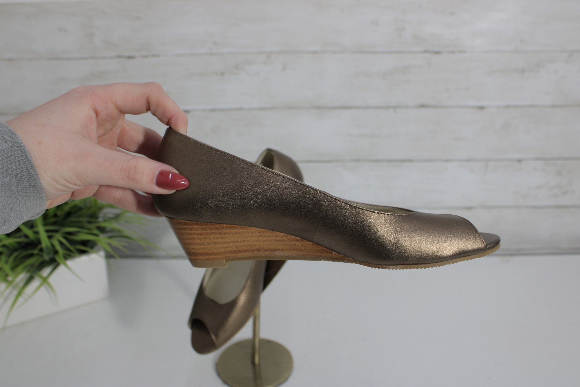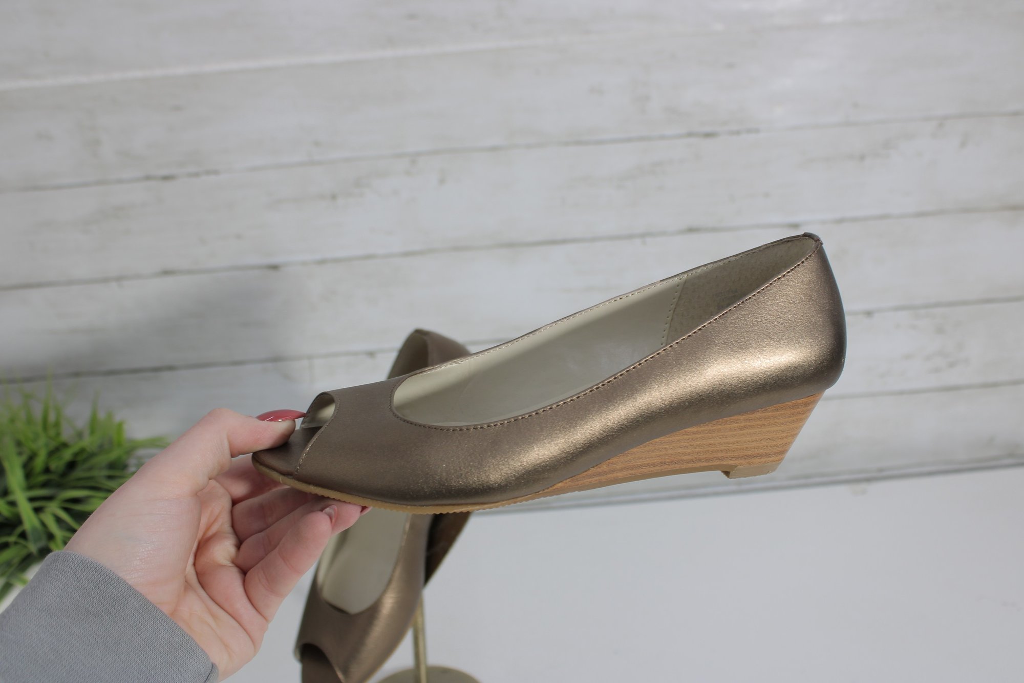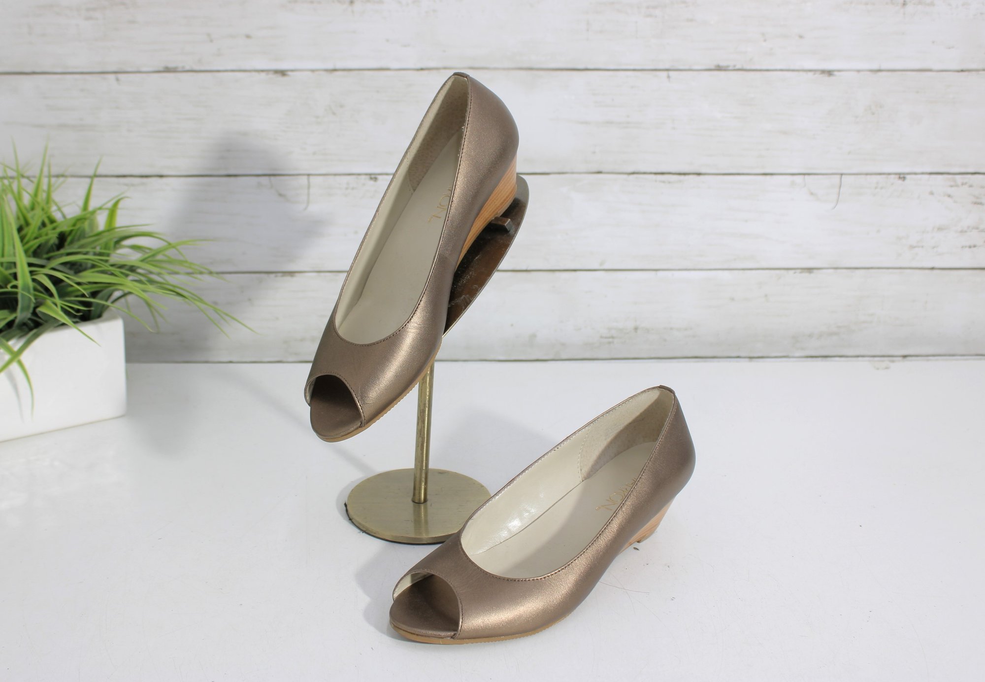 Stylish and versatile Markon bronze metallic peep-toe wedges designed for both comfort and elegance. These shoes feature a sleek metallic finish paired with a stable wedge heel, making them perfect for all-day wear—whether for work, casual outings, or dressier occasions.
