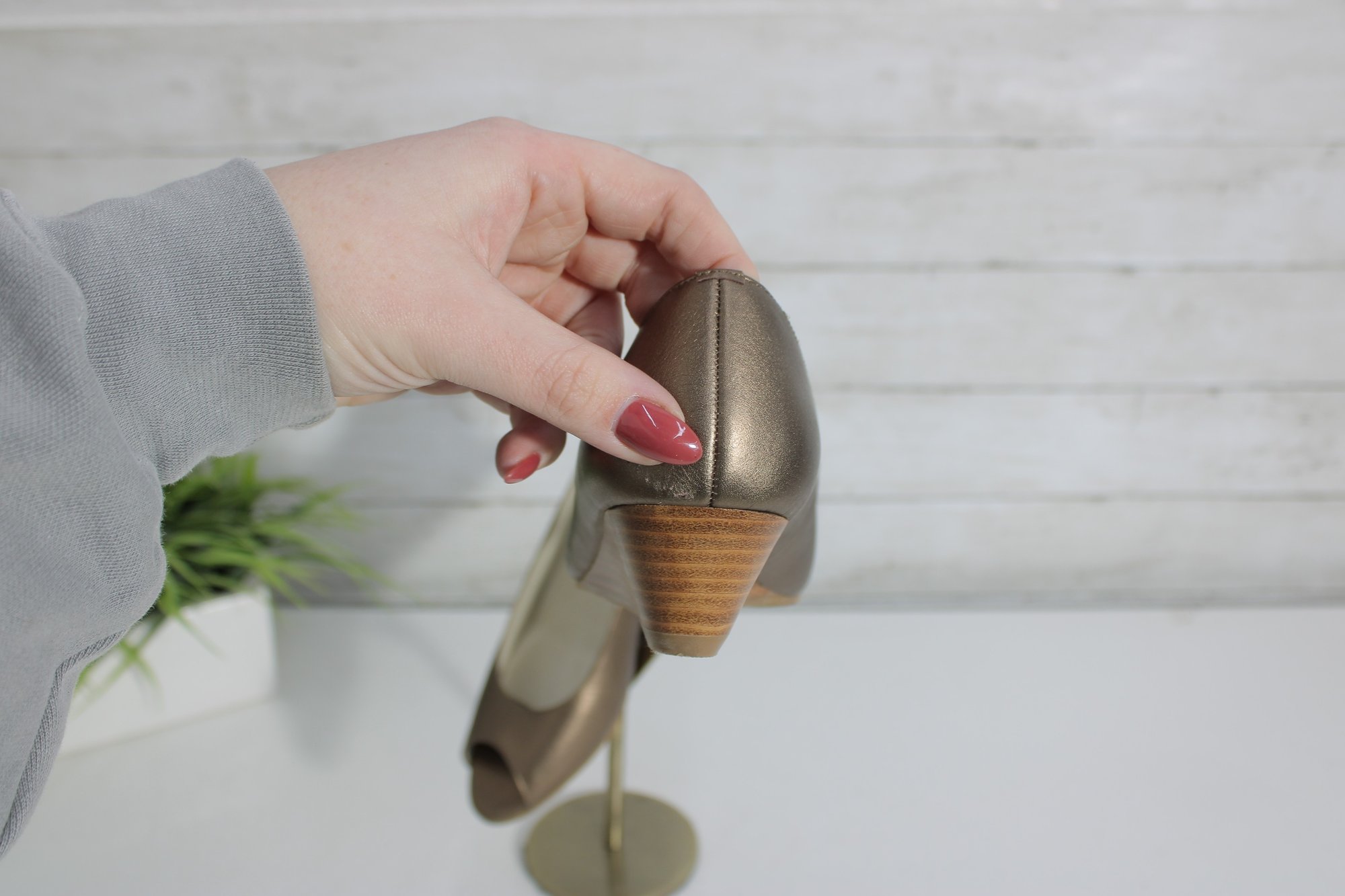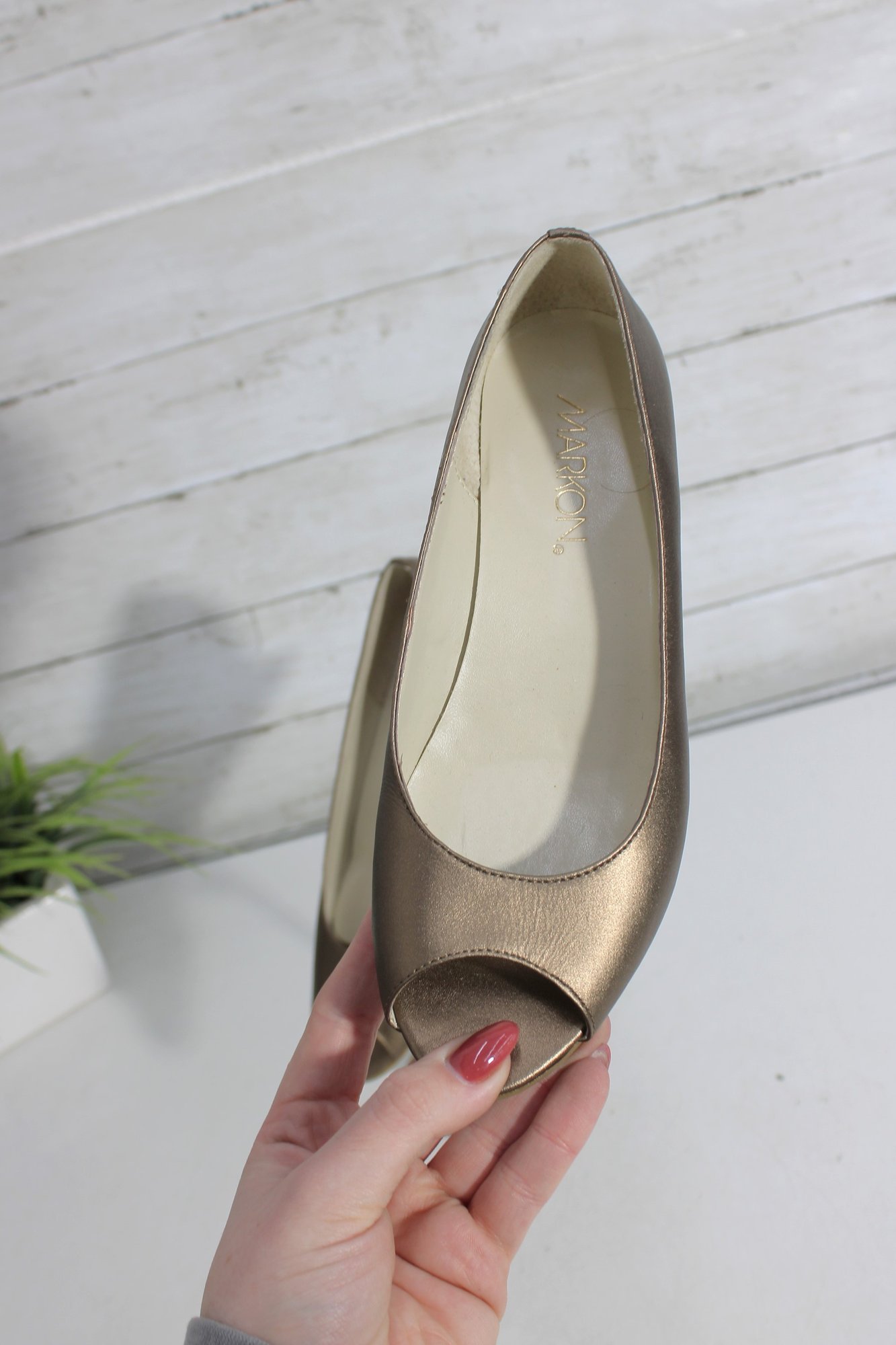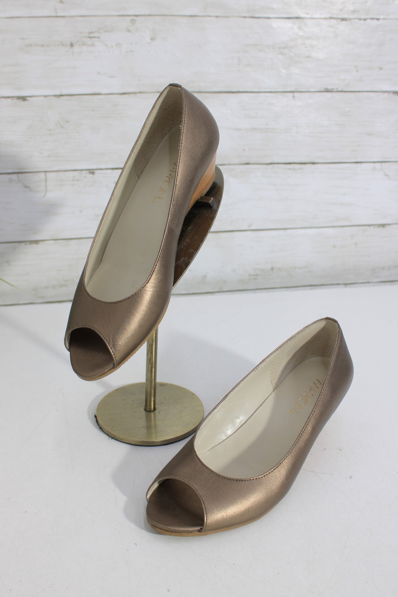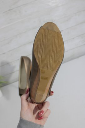 Stylish and versatile Markon bronze metallic peep-toe wedges designed for both comfort and elegance. These shoes feature a sleek metallic finish paired with a stable wedge heel, making them perfect for all-day wear—whether for work, casual outings, or dressier occasions.
