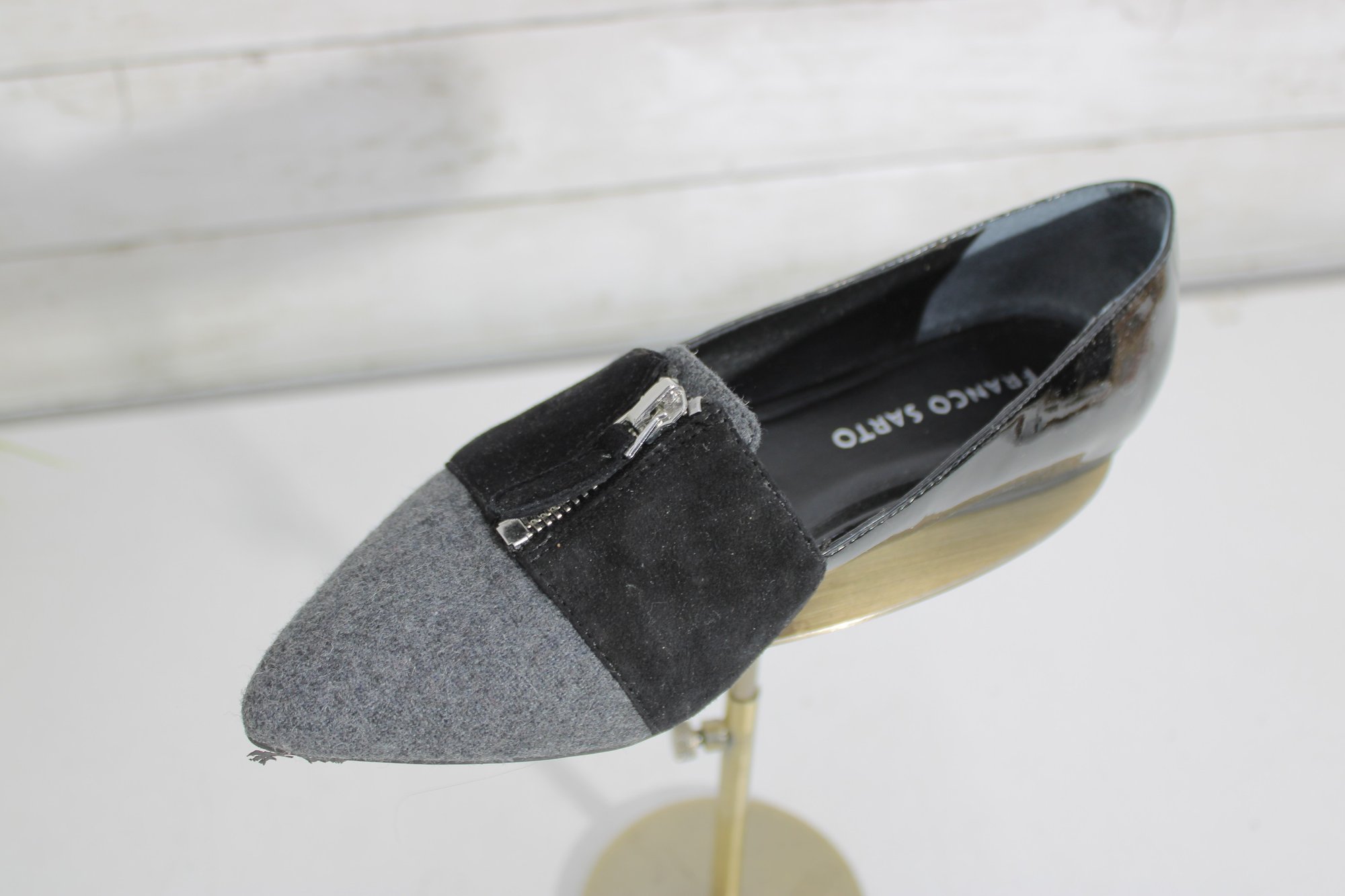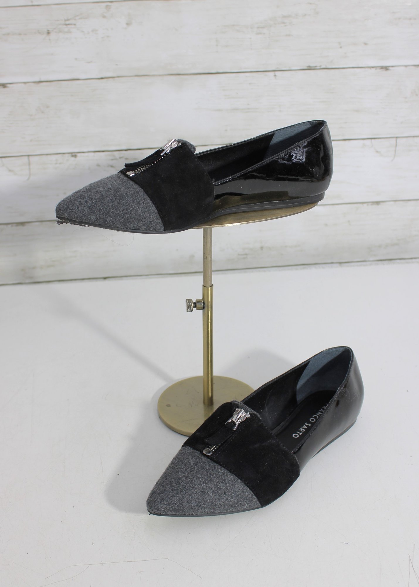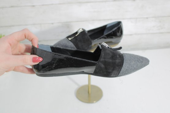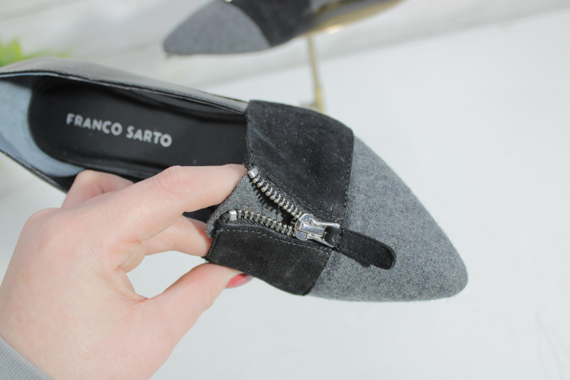 Modern and sophisticated Franco Sarto loafers featuring a sleek pointed toe and stylish mixed-material design. These flats combine black patent-style panels with soft gray fabric and a chic front zipper detail, creating a polished look that transitions easily from work to weekend wear.