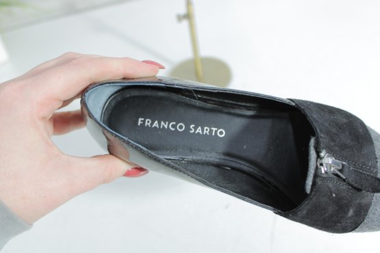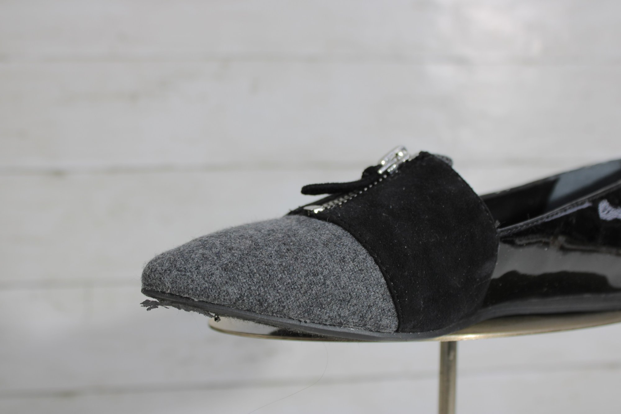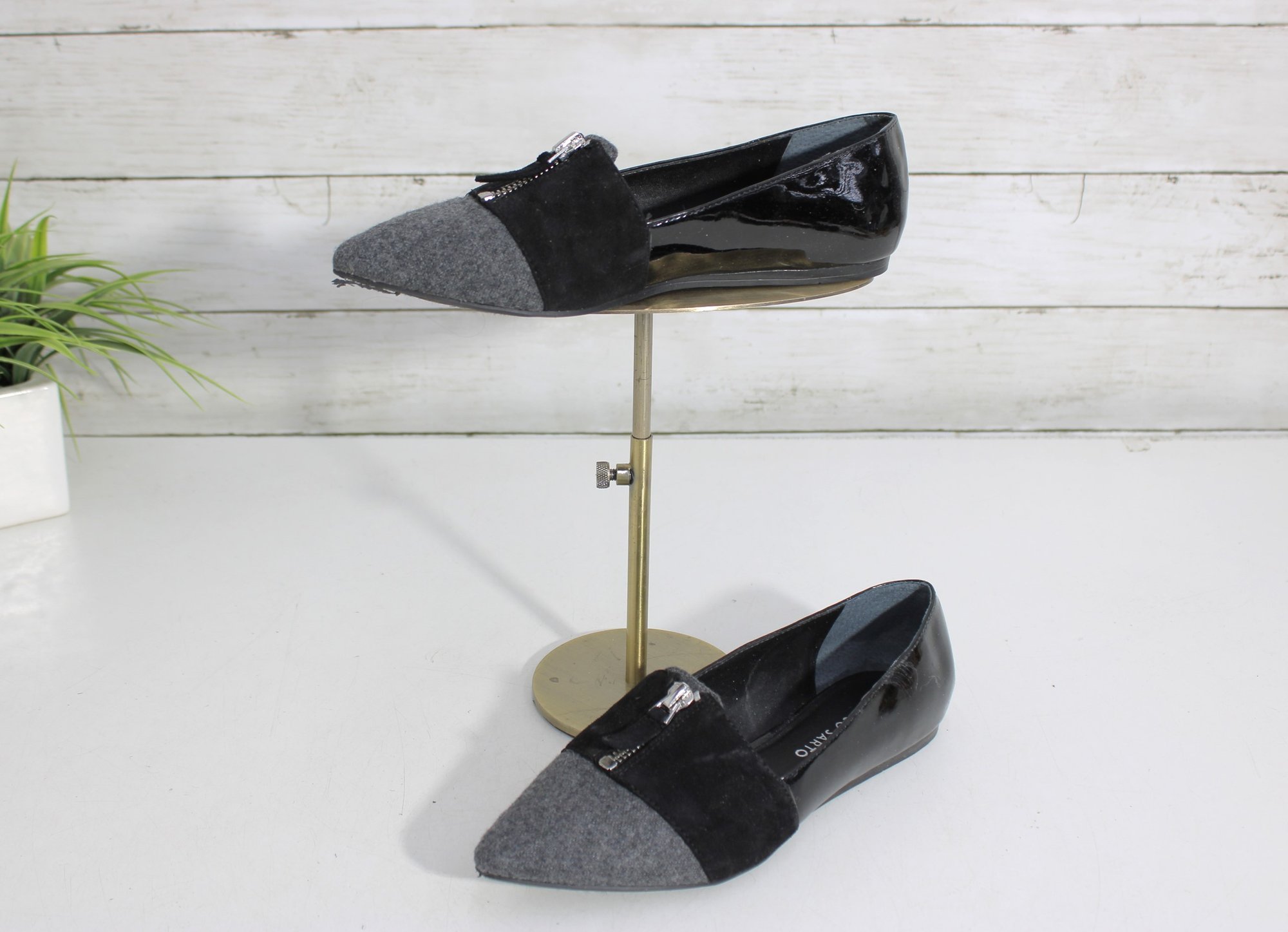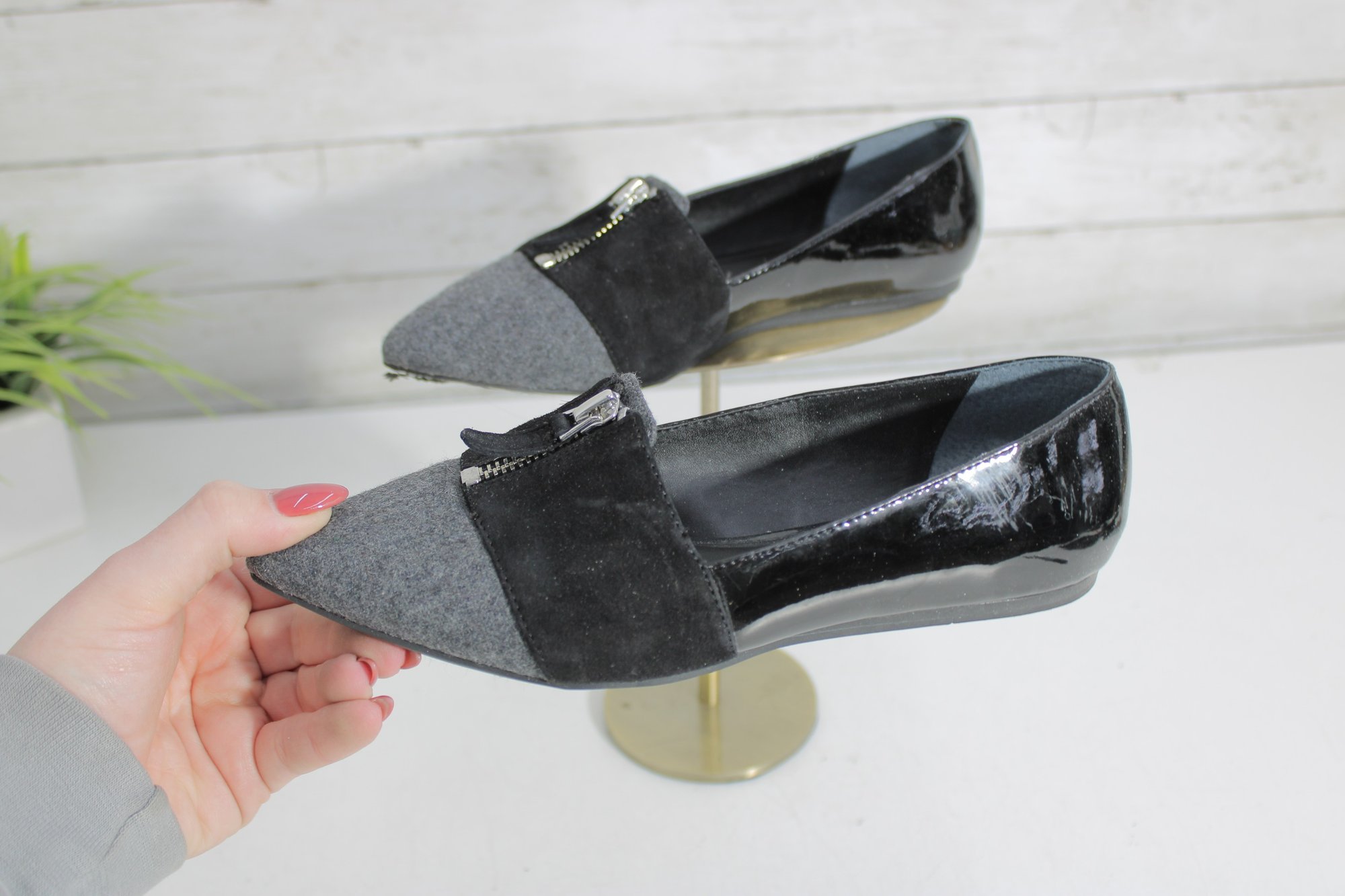Modern and sophisticated Franco Sarto loafers featuring a sleek pointed toe and stylish mixed-material design. These flats combine black patent-style panels with soft gray fabric and a chic front zipper detail, creating a polished look that transitions easily from work to weekend wear.