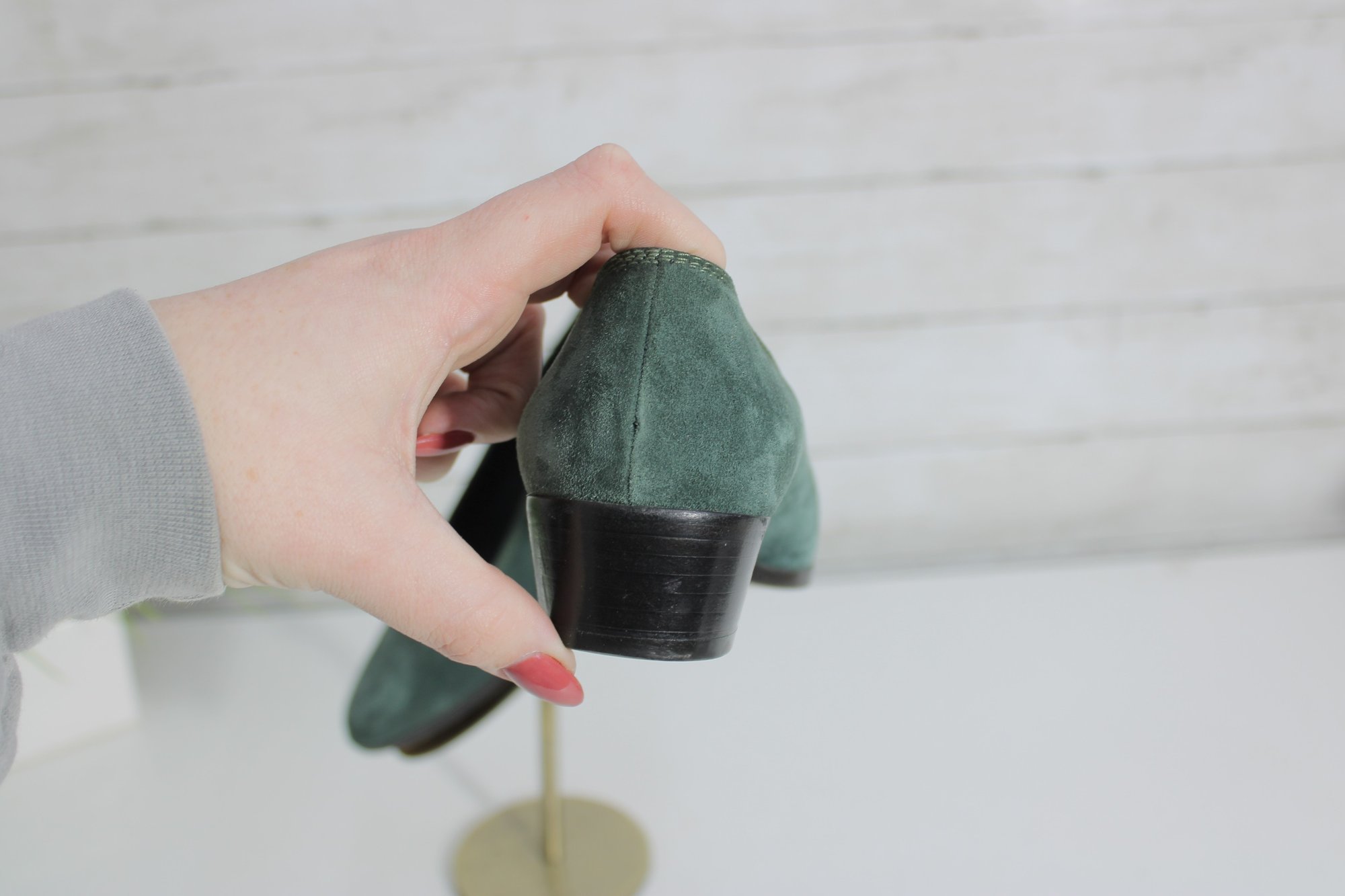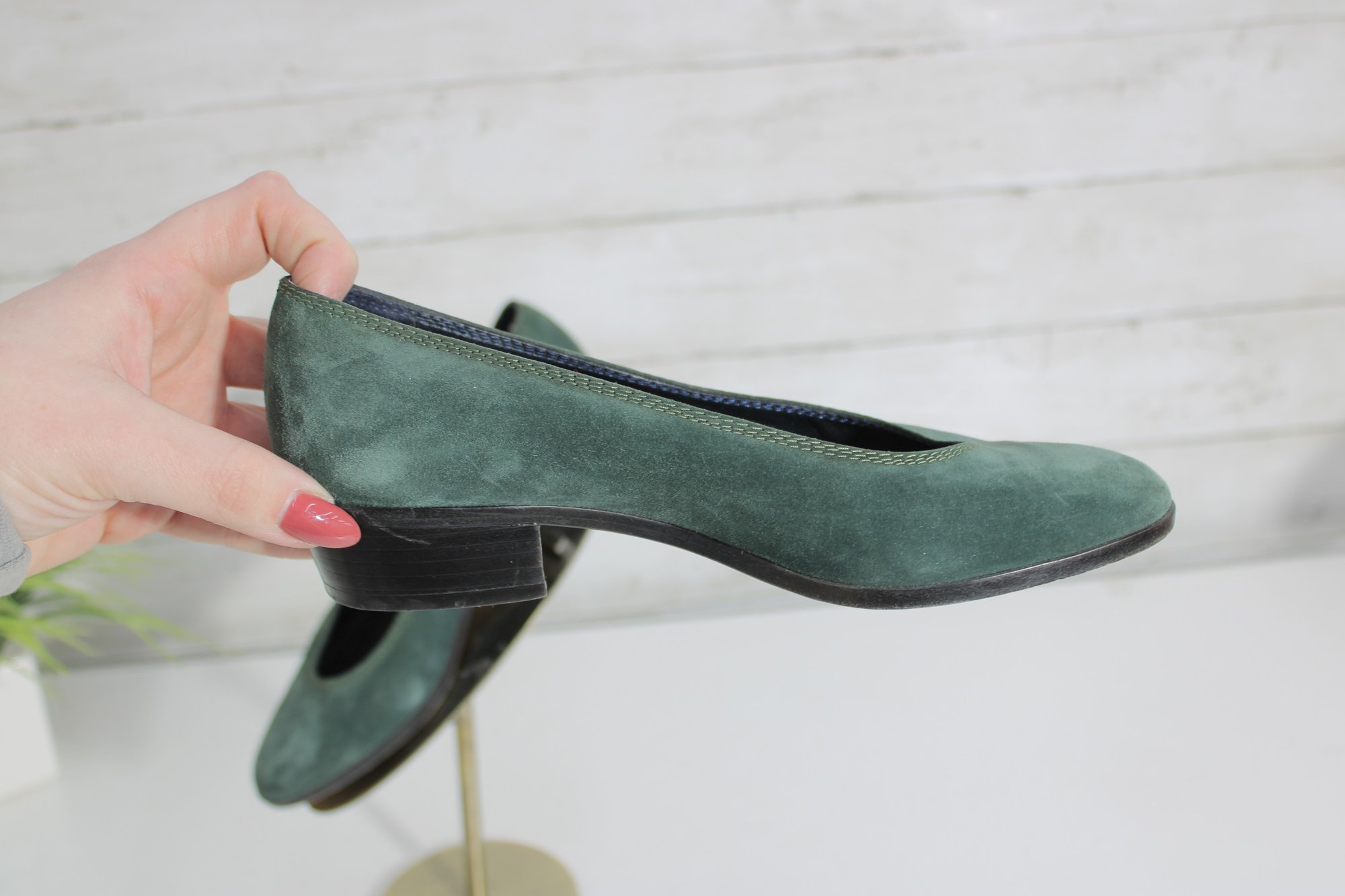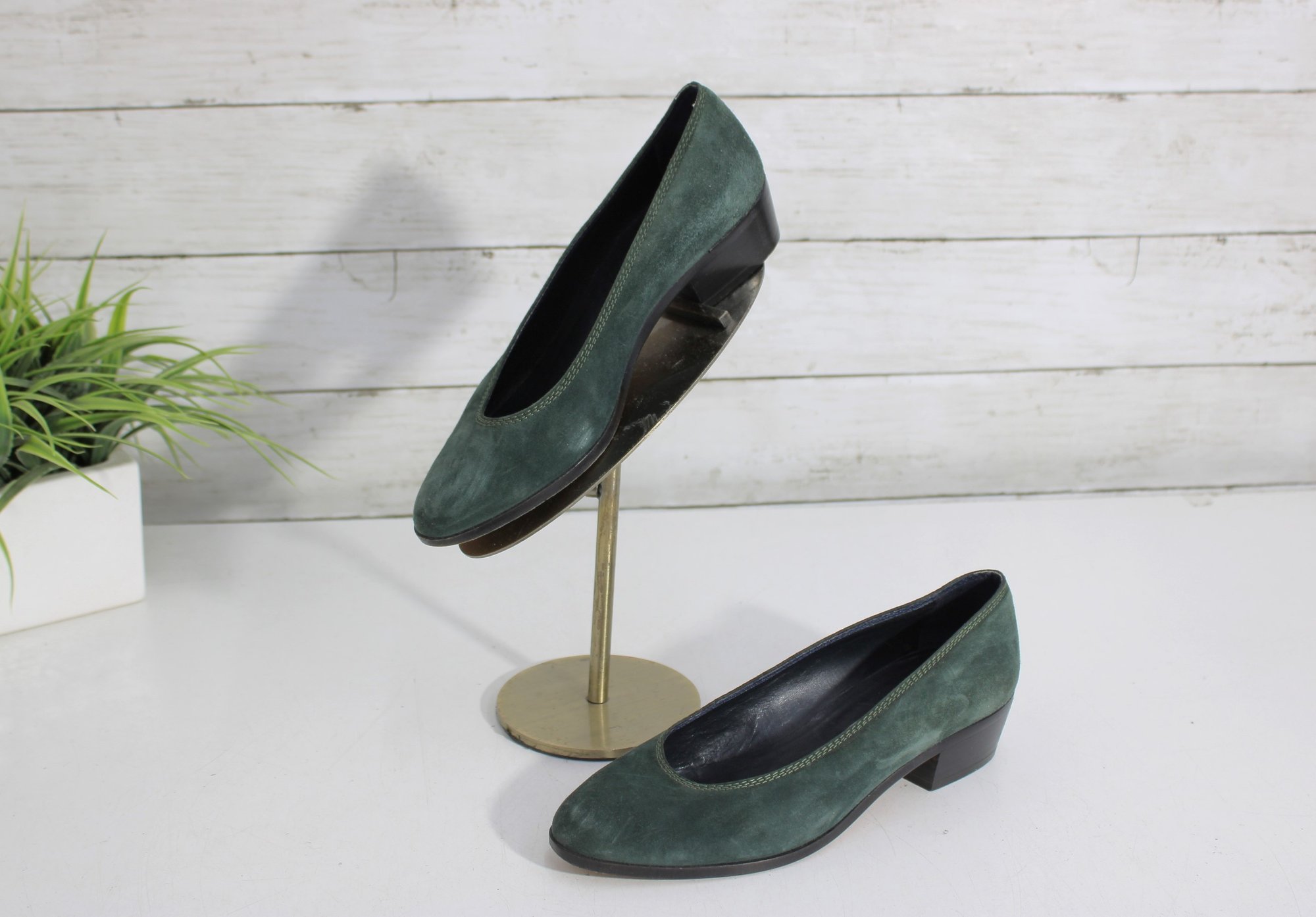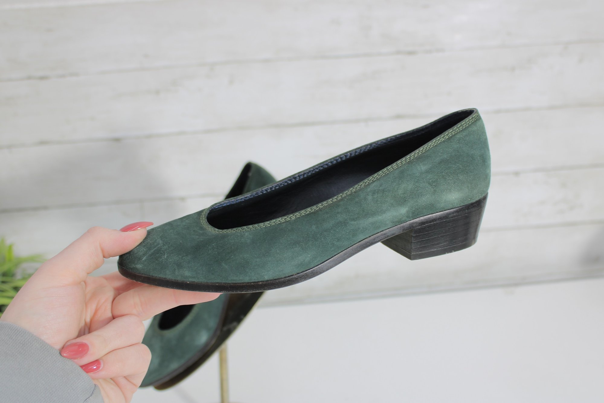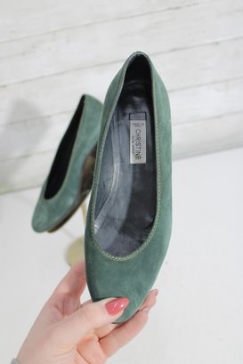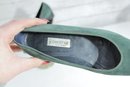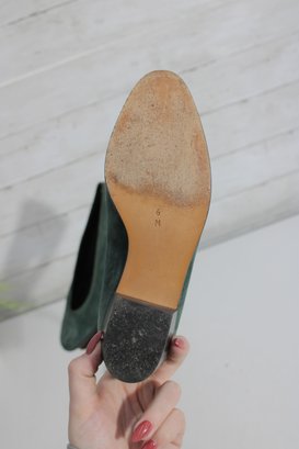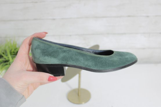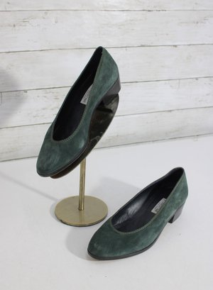 Classic and elegant Christine suede pumps in a rich green hue. These timeless shoes feature a clean, minimalist silhouette with a comfortable low block heel—perfect for all-day wear at the office or for dressing up casual looks.