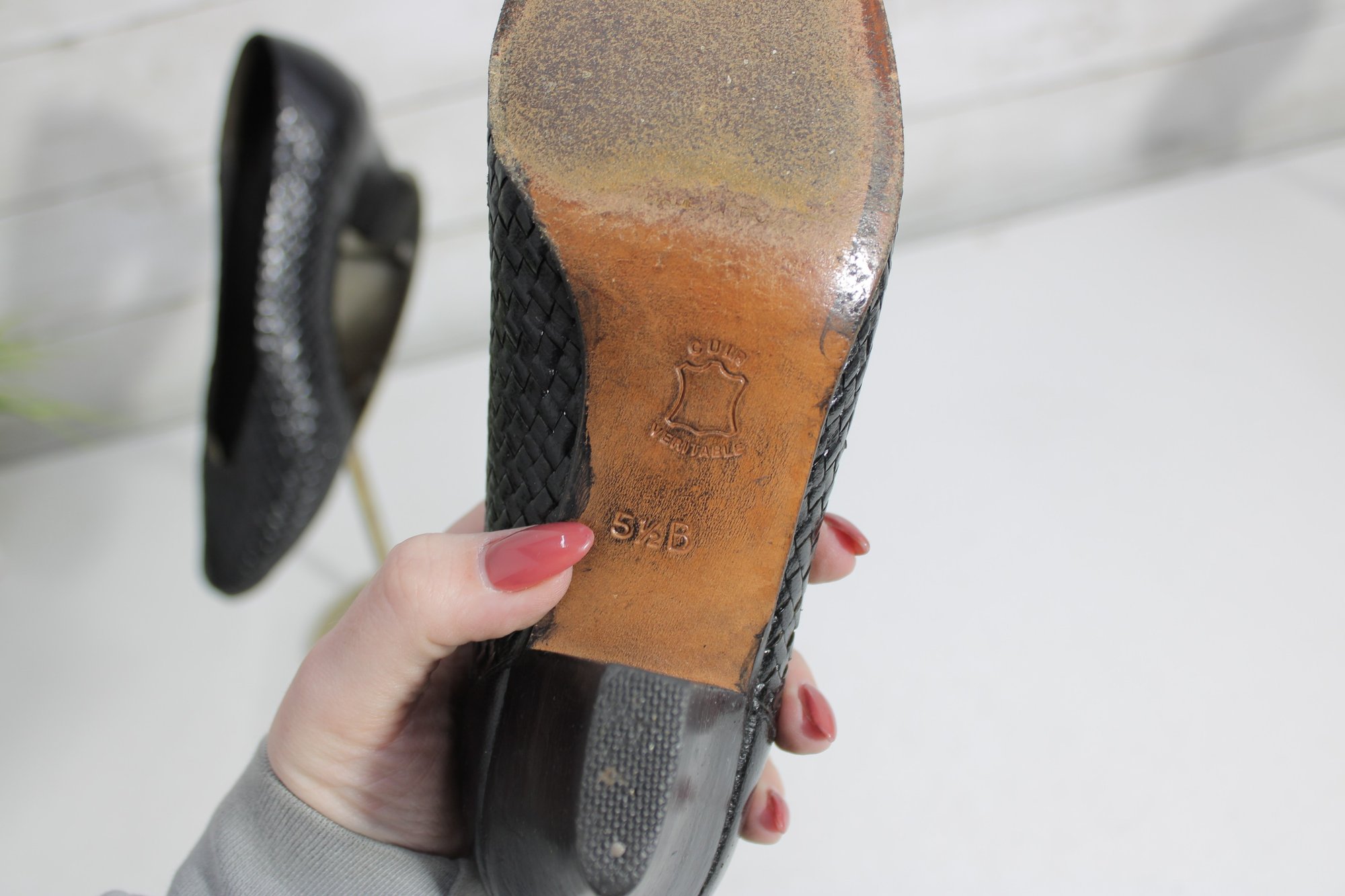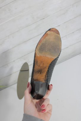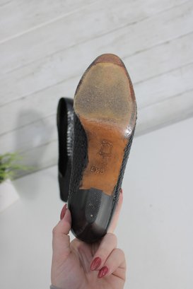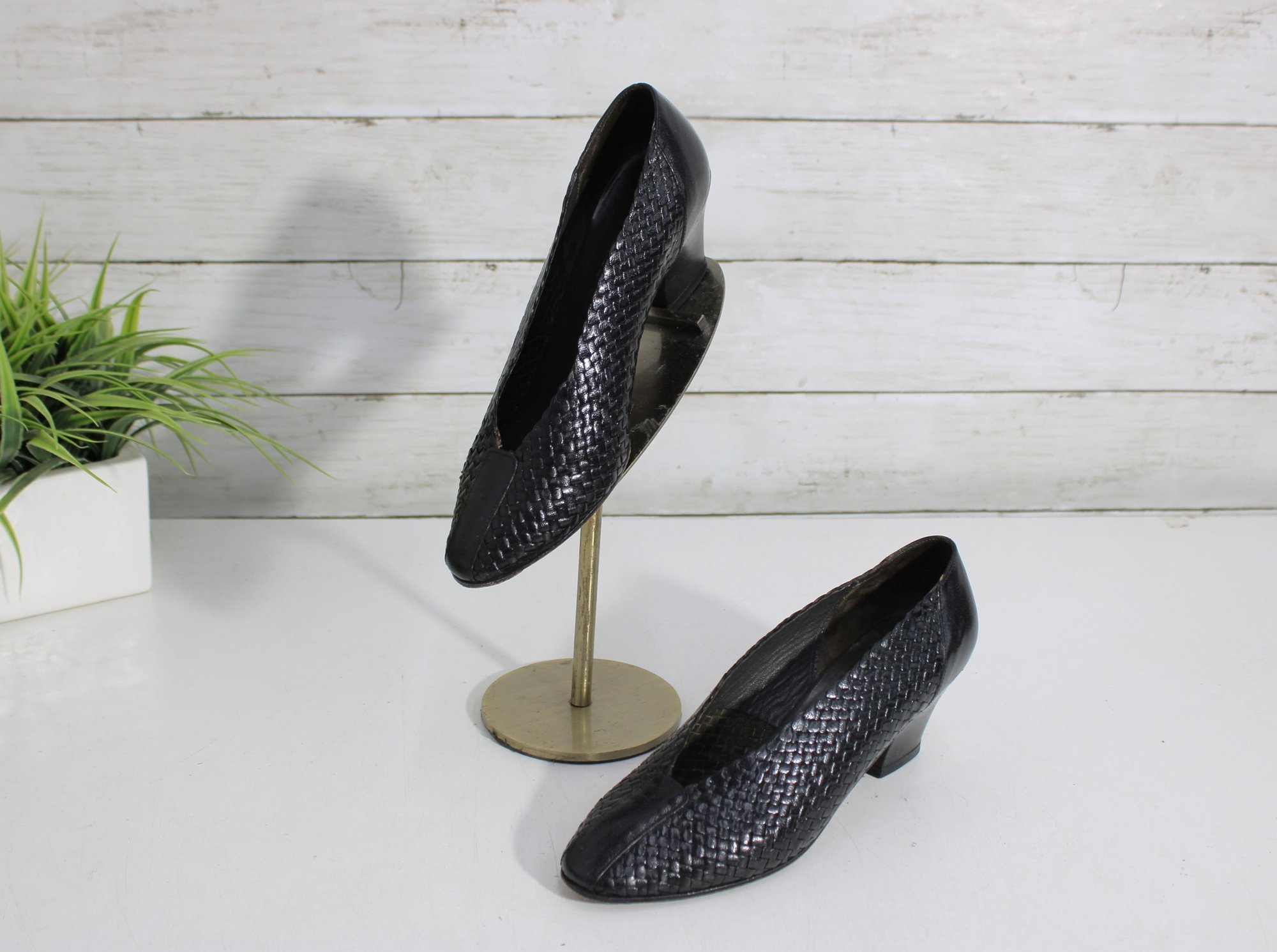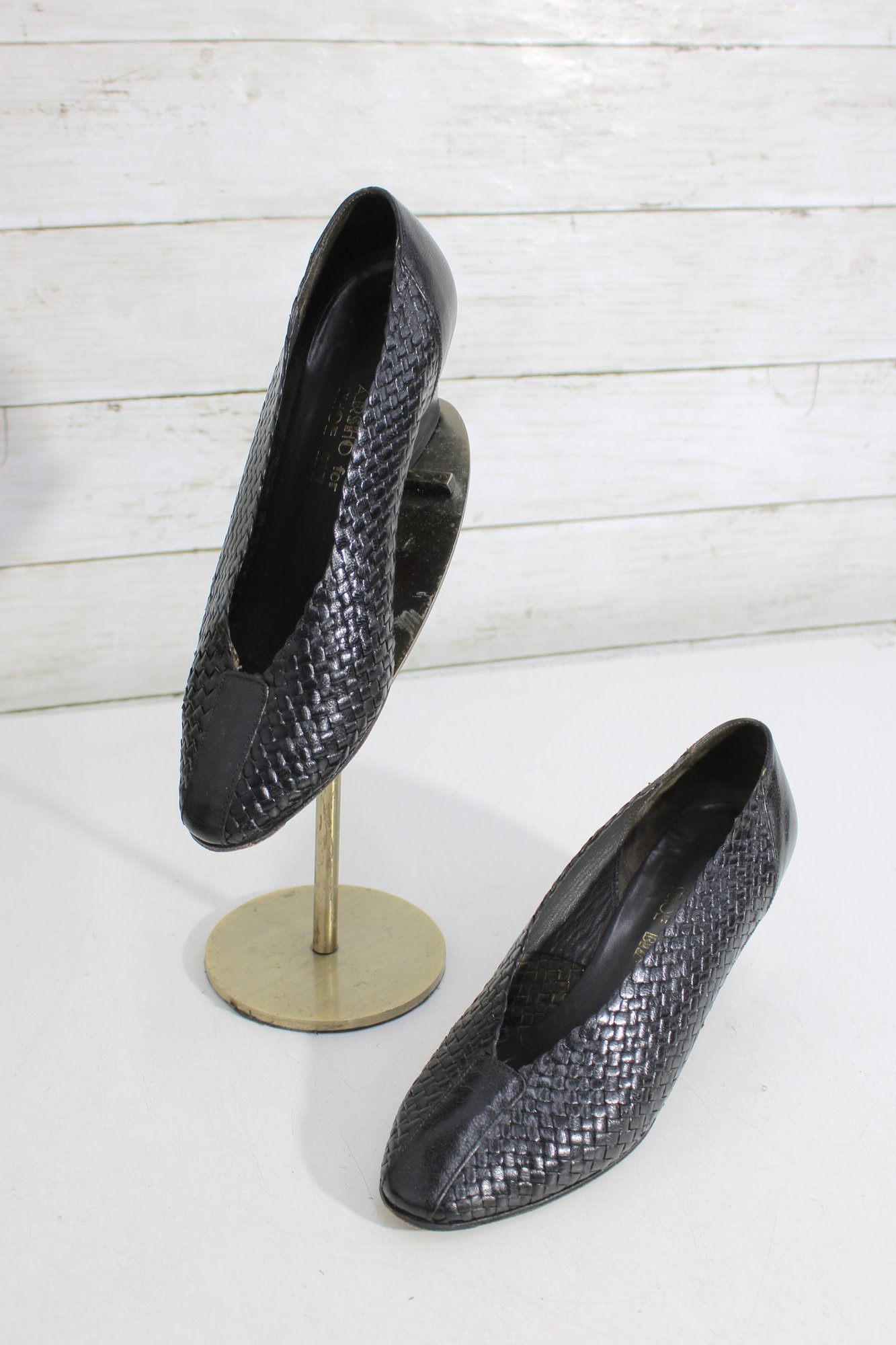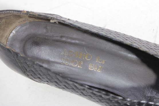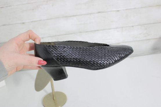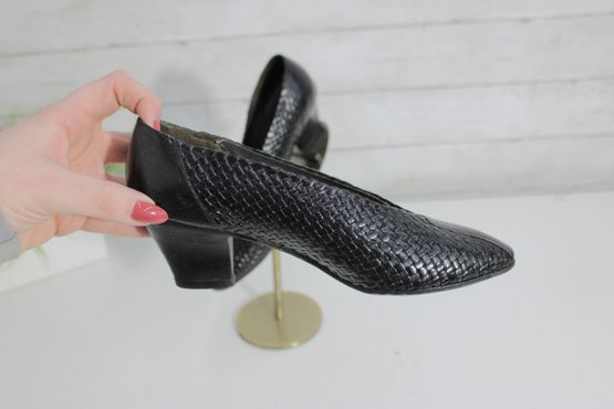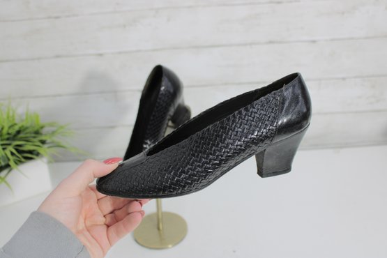 Arsho for Shoe Biz black leather pumps featuring a beautiful woven-texture upper and a classic low heel. These shoes offer a refined silhouette with comfortable height—perfect for office wear, special occasions, or everyday polished looks.