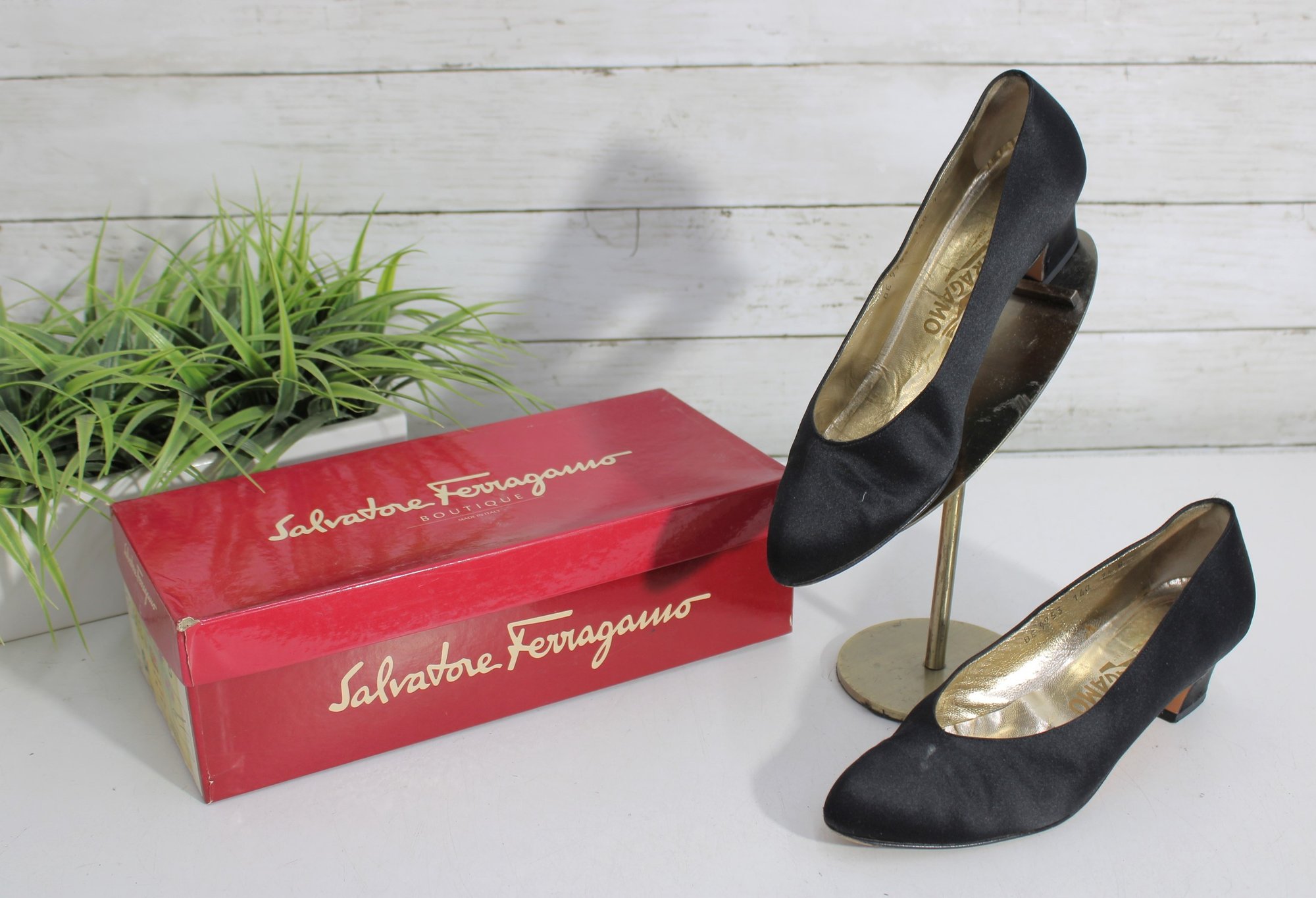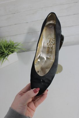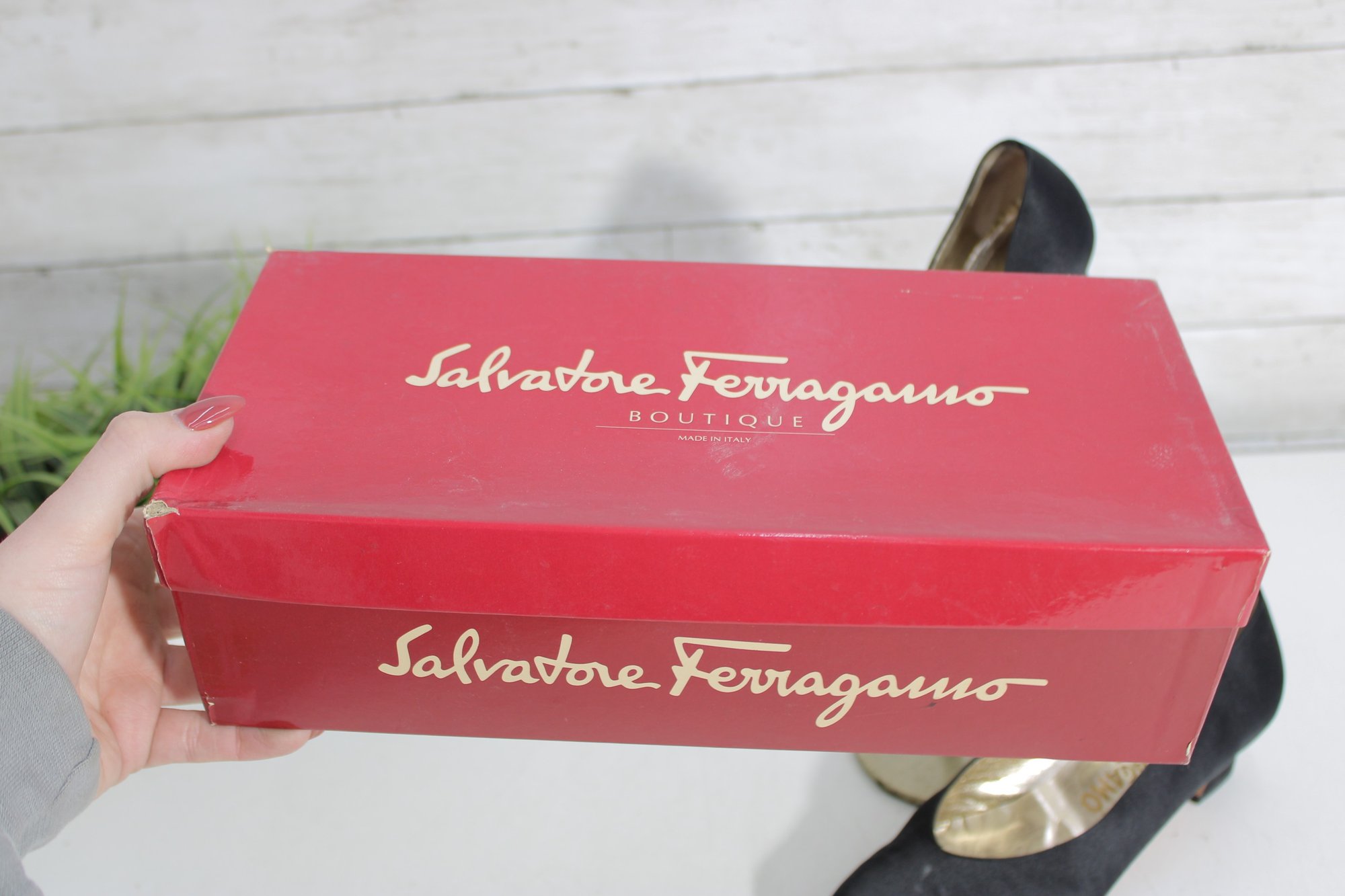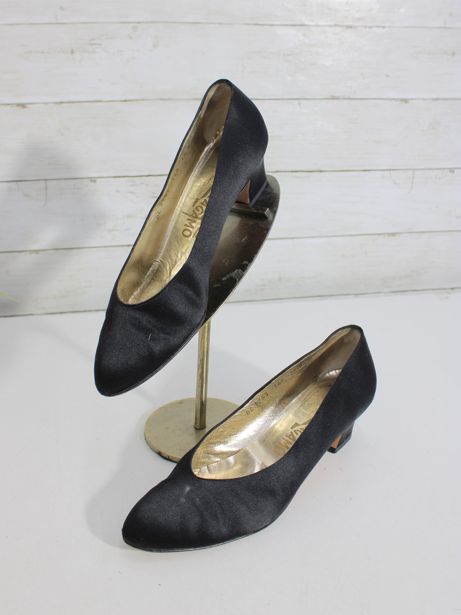 Timeless designer elegance from Salvatore Ferragamo. These classic black pumps feature a refined silhouette with a comfortable low block heel, making them perfect for professional wear, special occasions, or everyday sophistication.