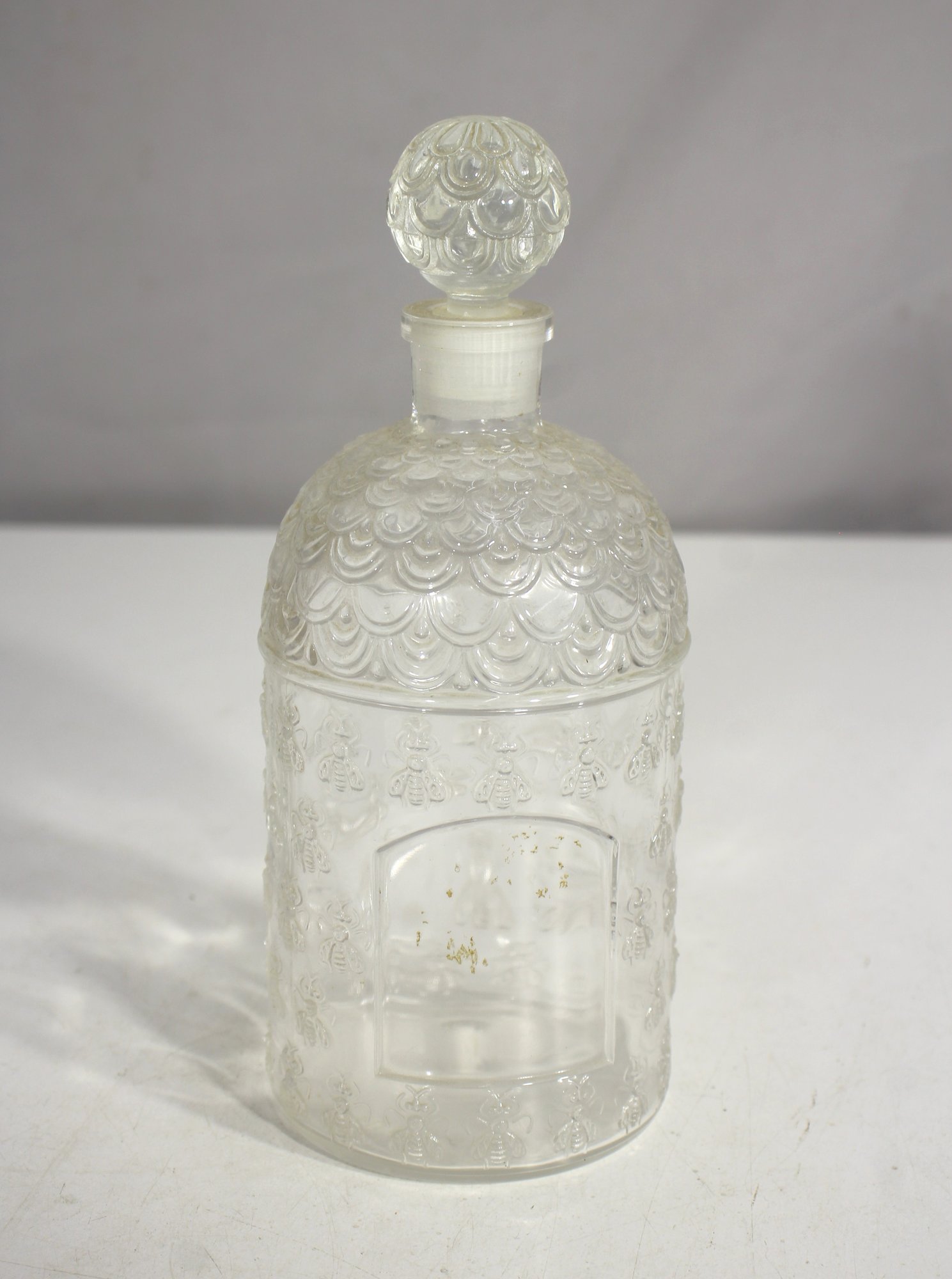Rare 8-inch vintage Guerlain Paris Bee Bottle, featuring an elegant embossed glass design with the iconic honeycomb and bee motif. This beautifully crafted perfume decanter includes its original faceted stopper, adorned with a matching decorative pattern.