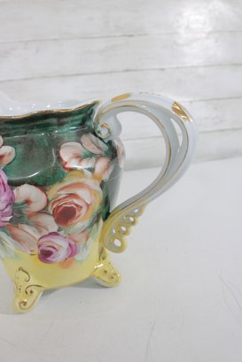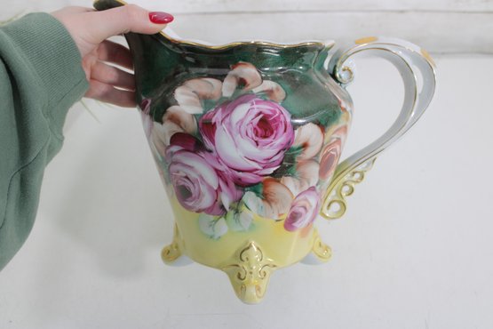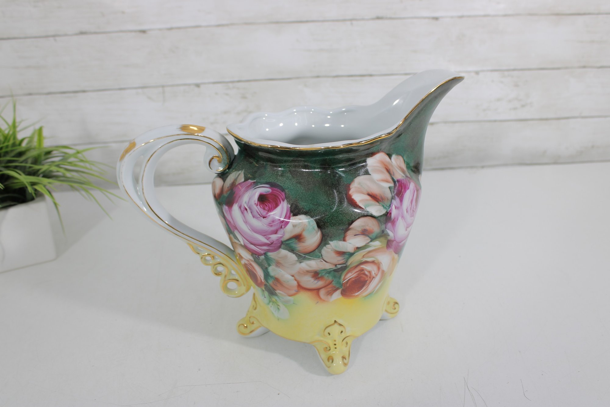 Stunning antique Limoges porcelain pitcher from France, featuring exquisite hand-painted roses and rich coloration. This elegant piece stands approximately 9.5 inches tall and showcases a beautifully sculpted form with a flared spout, ornate handle, and decorative footed base.