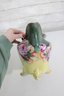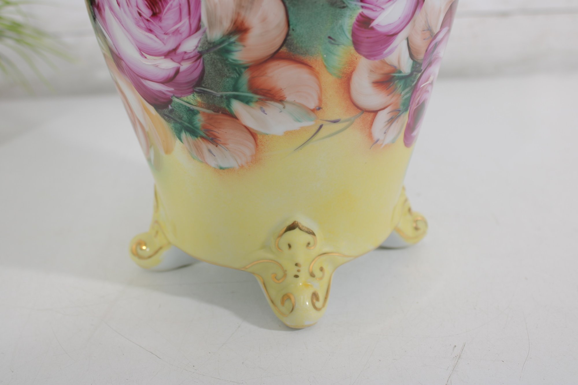 The body is adorned with lush pink roses and soft floral accents set against a deep green background that transitions into a warm yellow base. Fine gold detailing highlights the handle, rim, and decorative feet, adding a luxurious touch.