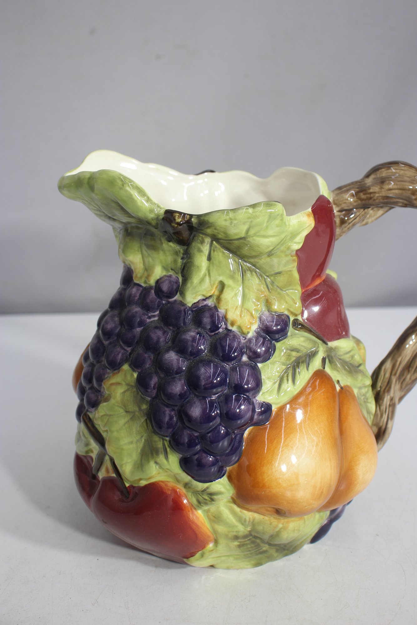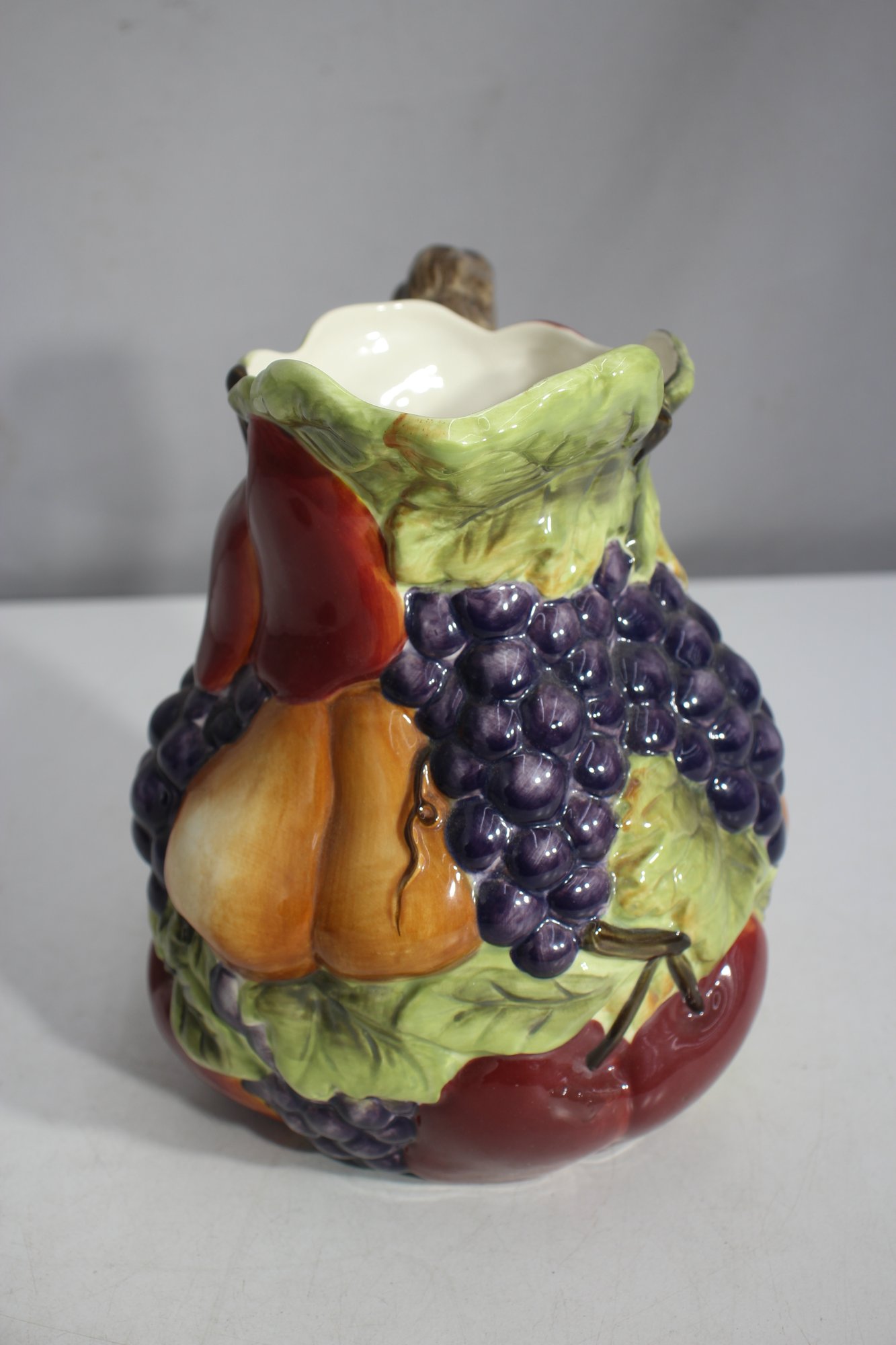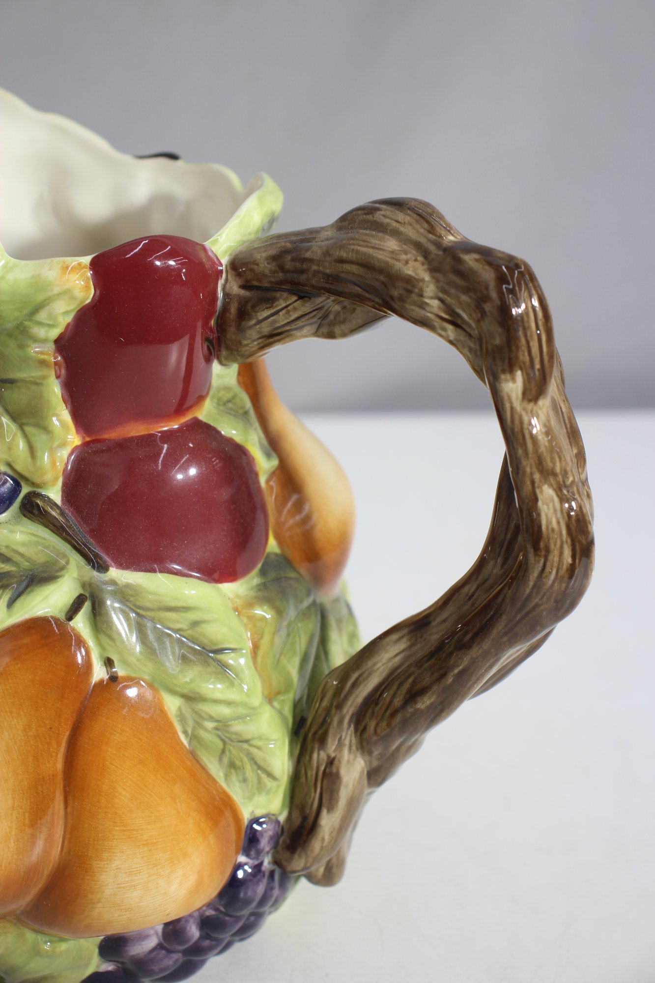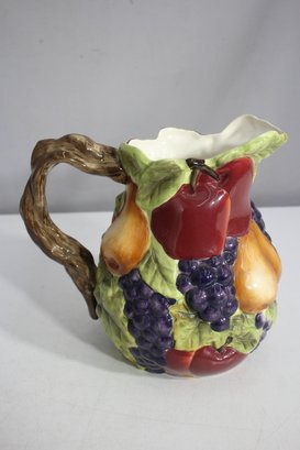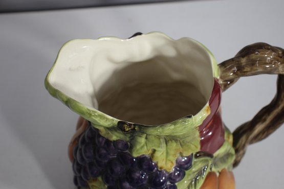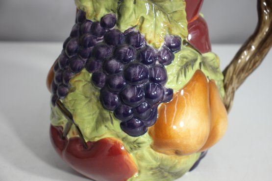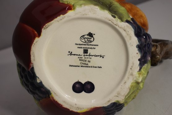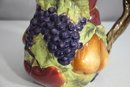 9-inch ceramic fruit pitcher by Home Interiors features a vibrant hand-painted fruit motif, including grapes, pears, apples, and leaves, with a unique sculpted vine handle for a charming rustic touch.
