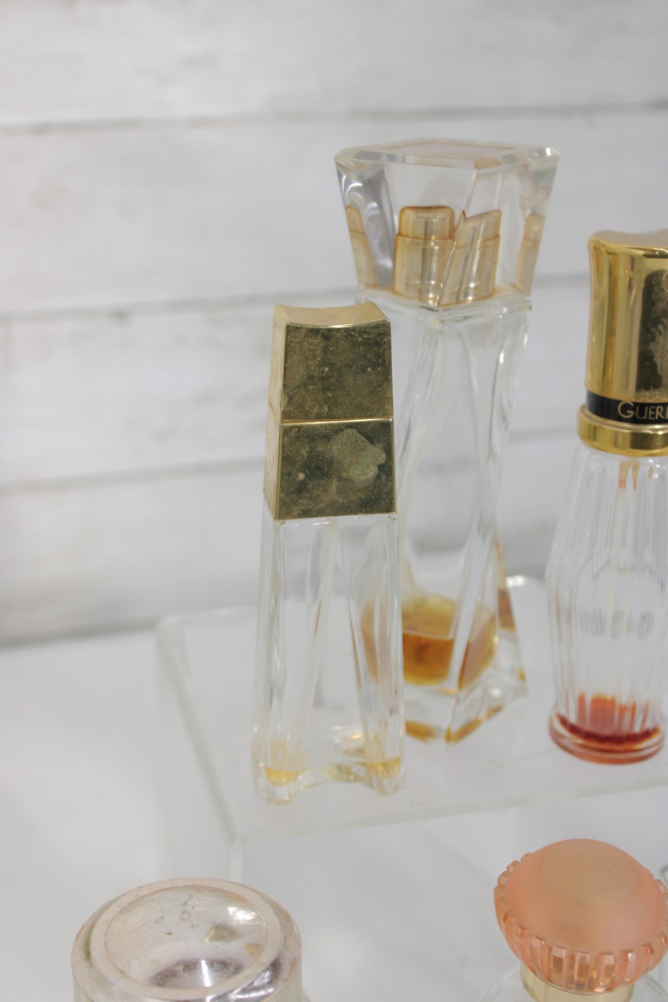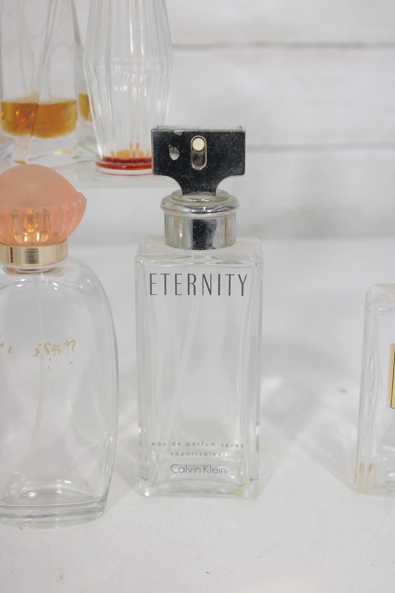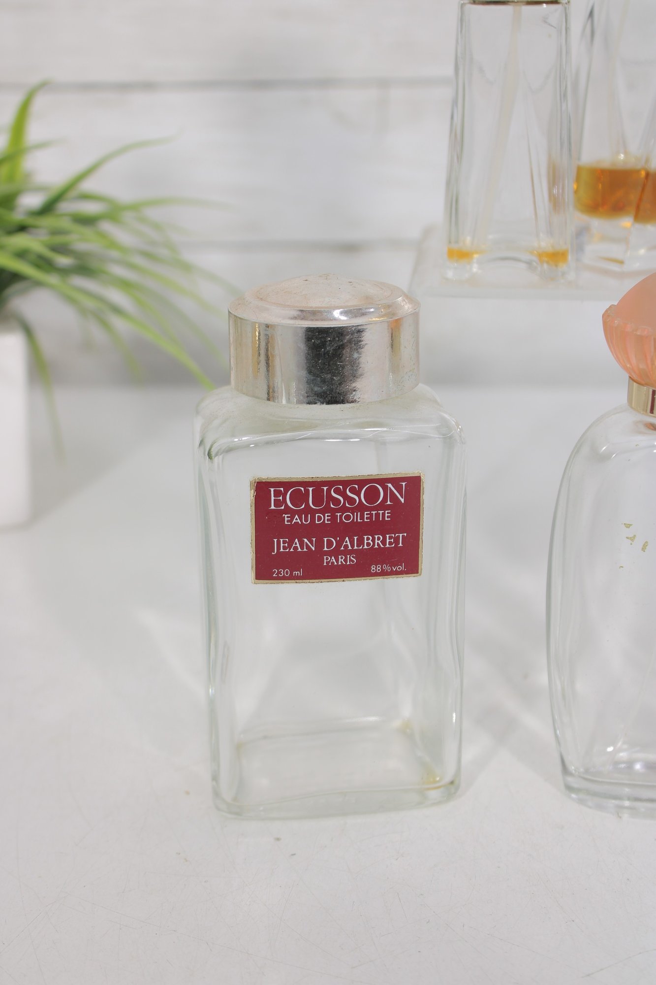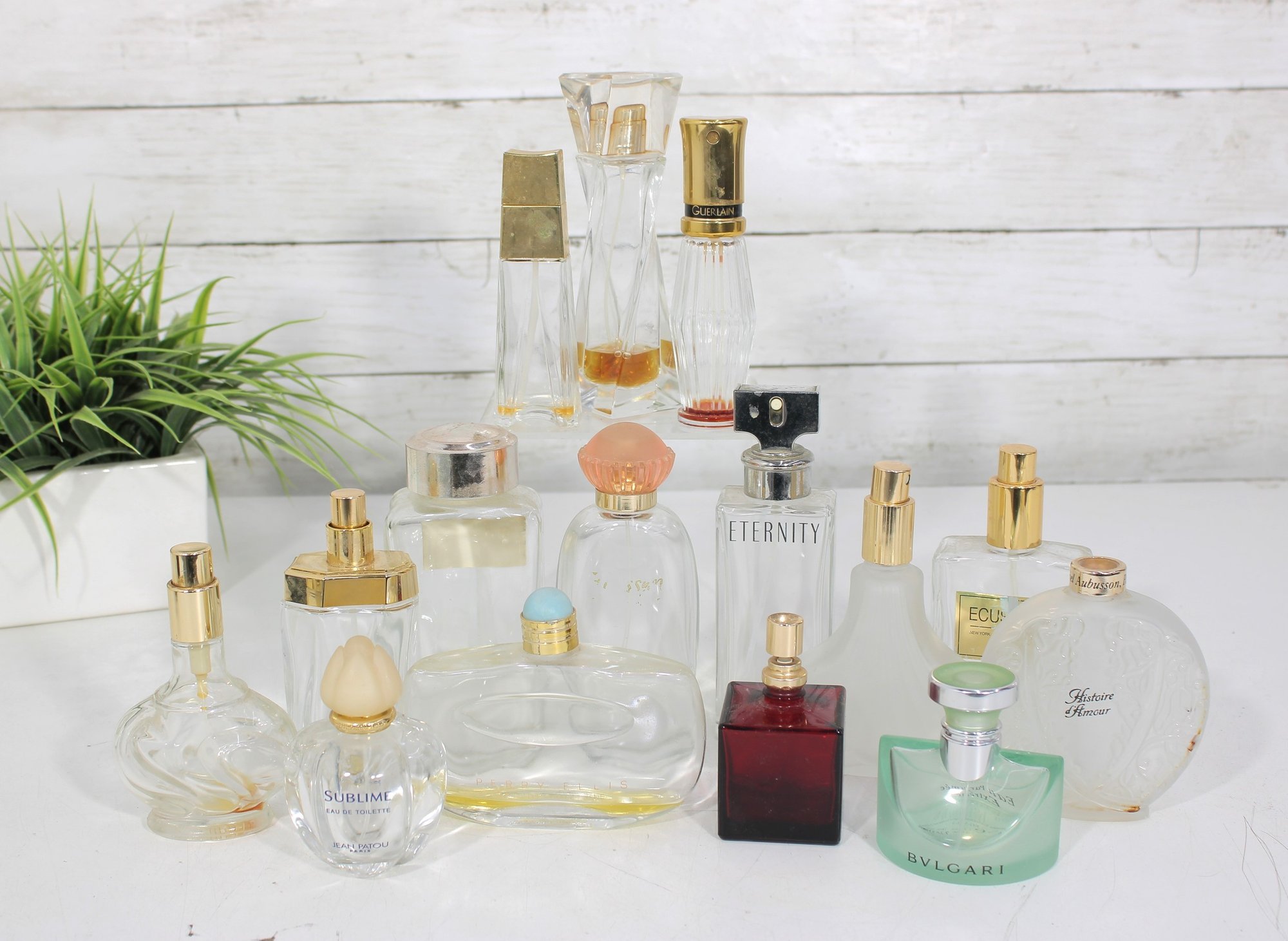 vintage designer perfume bottle group lot, featuring a variety of recognizable fragrance brands — all pre-owned and previously used.