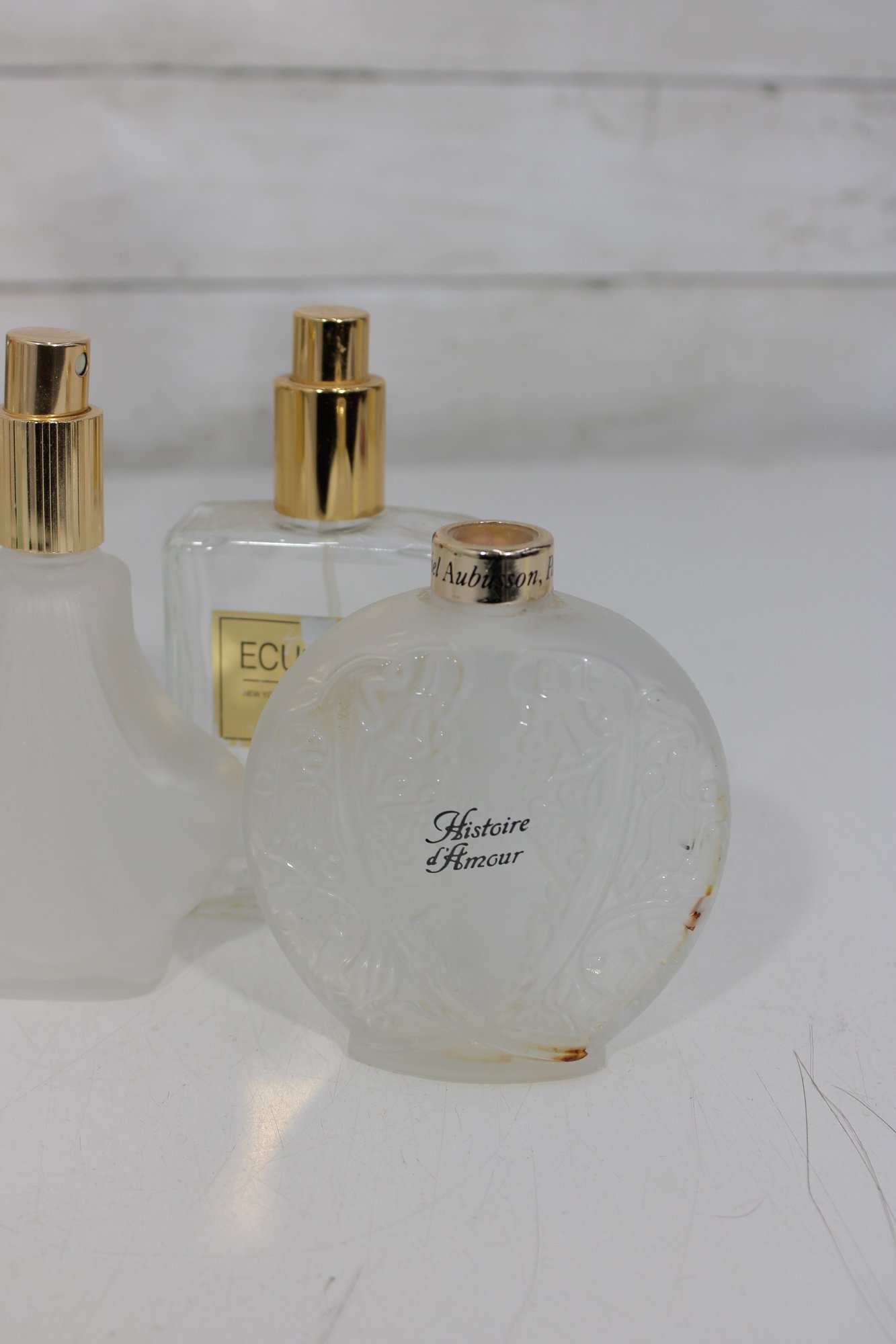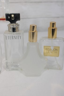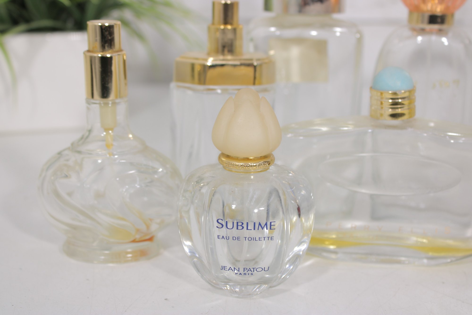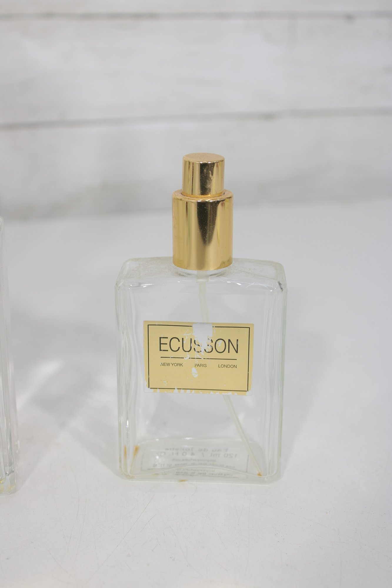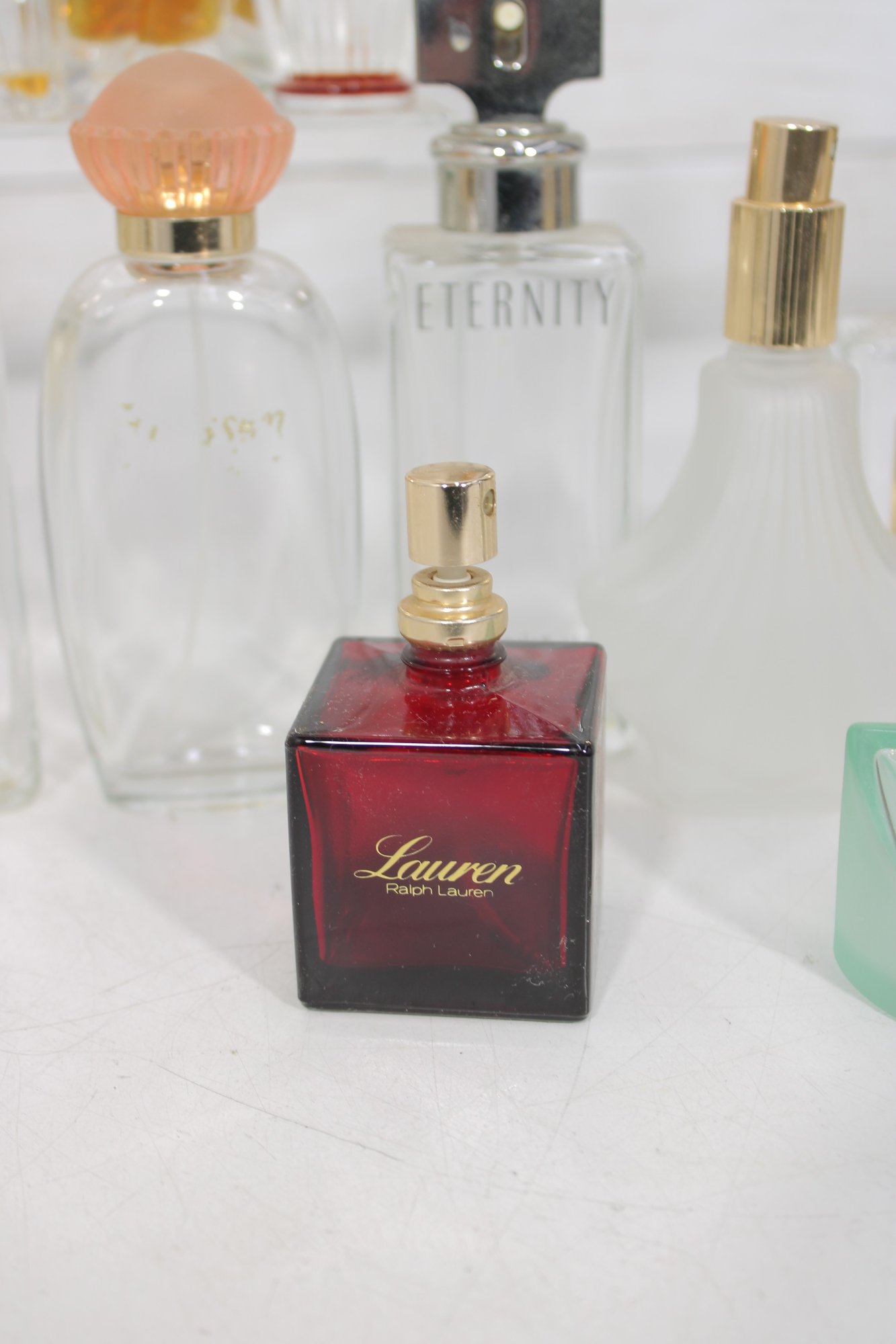 vintage designer perfume bottle group lot, featuring a variety of recognizable fragrance brands — all pre-owned and previously used.