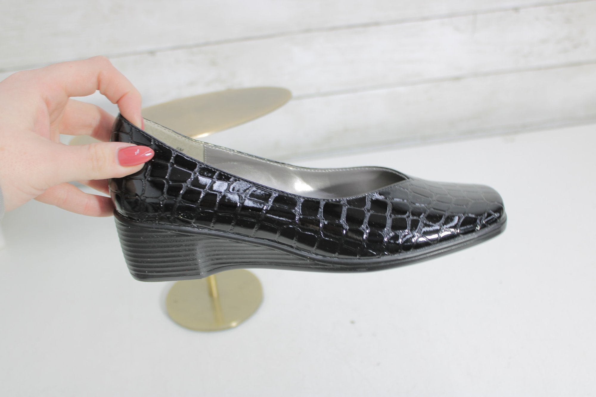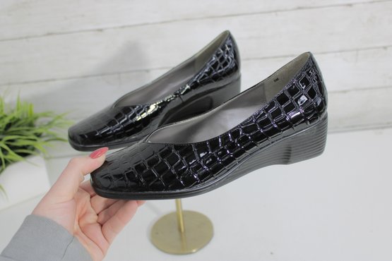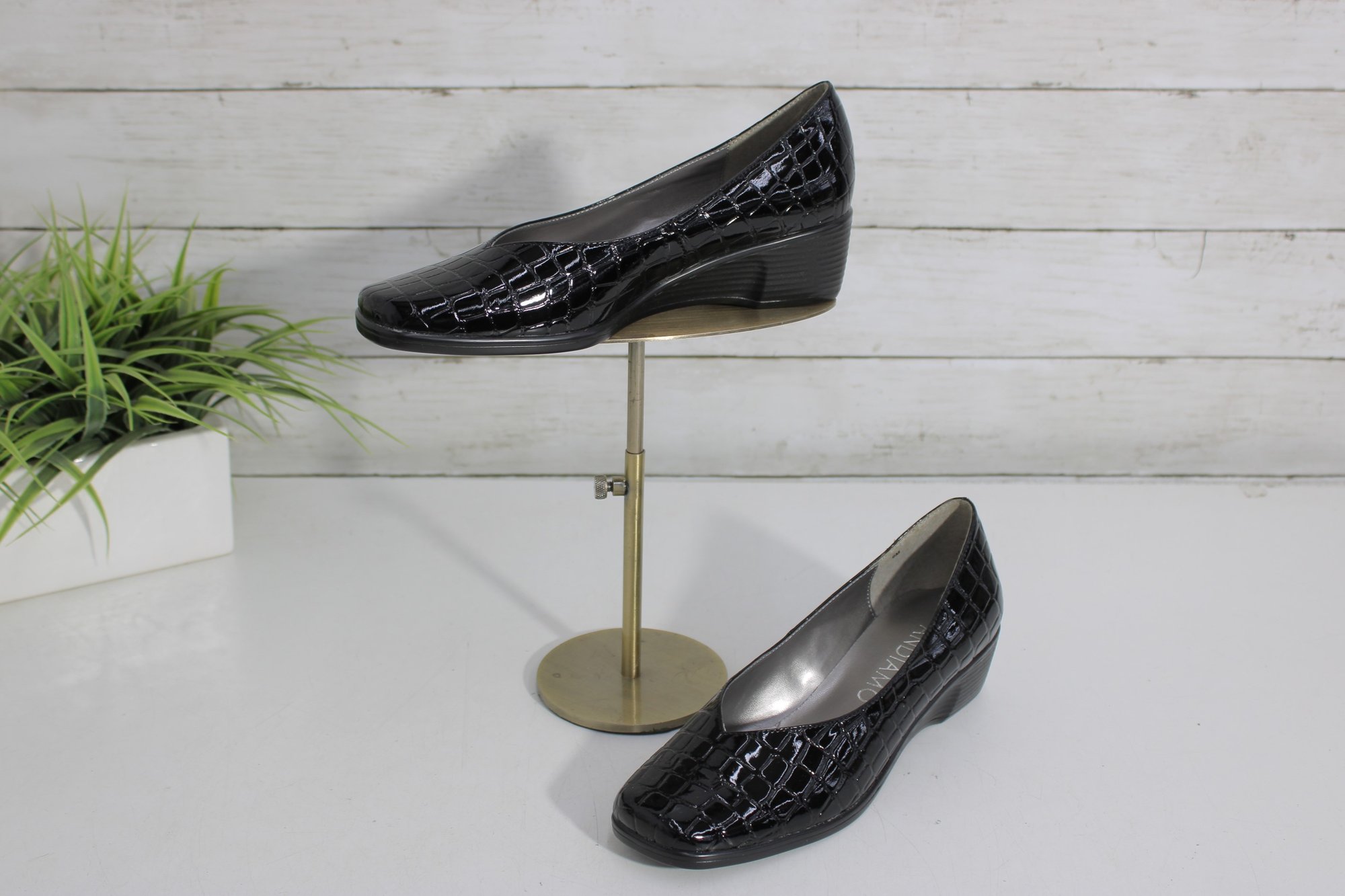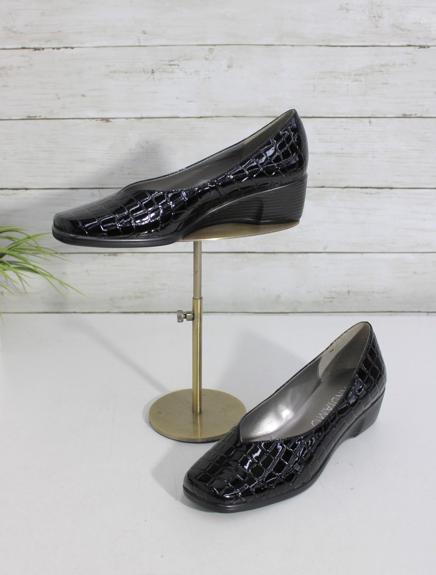Sleek, comfortable pumps by Andiamo, designed for everyday elegance and all-day wear. These black leather shoes feature a glossy croc-embossed finish and a supportive wedge heel that offers both style and stability.