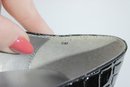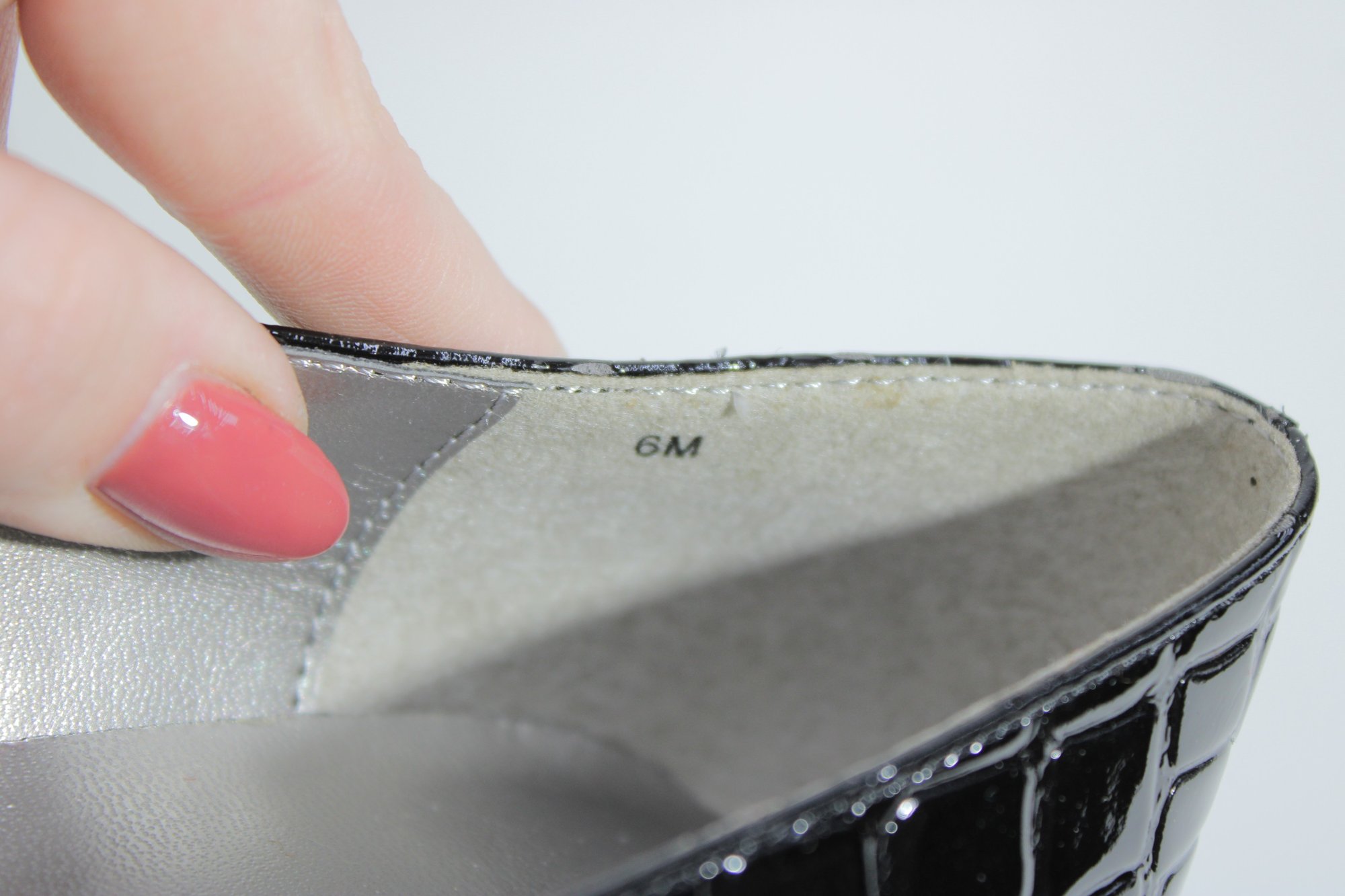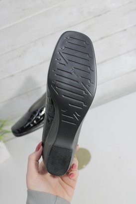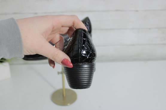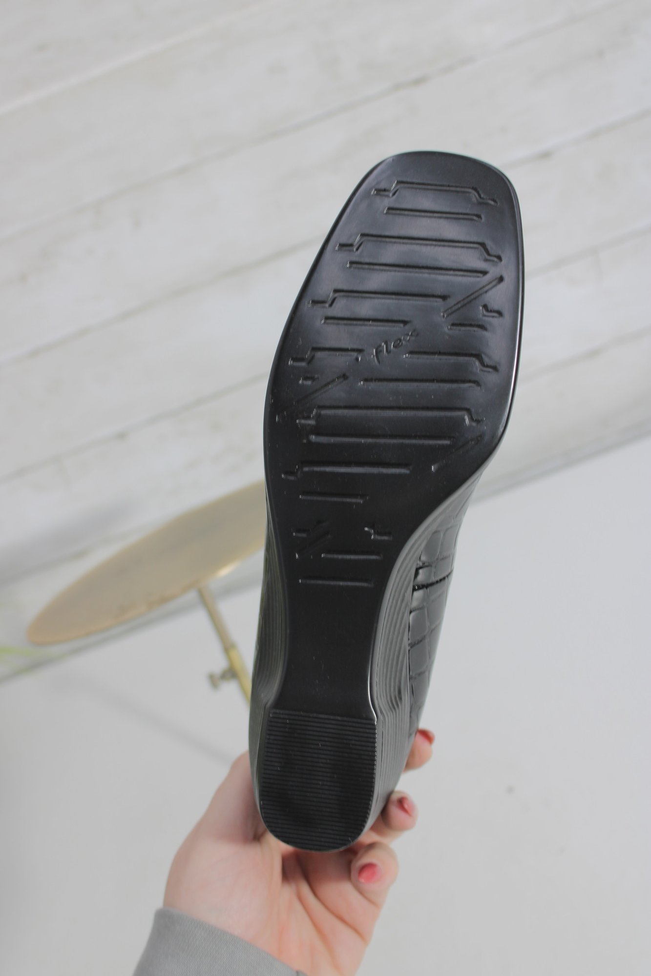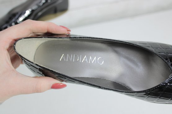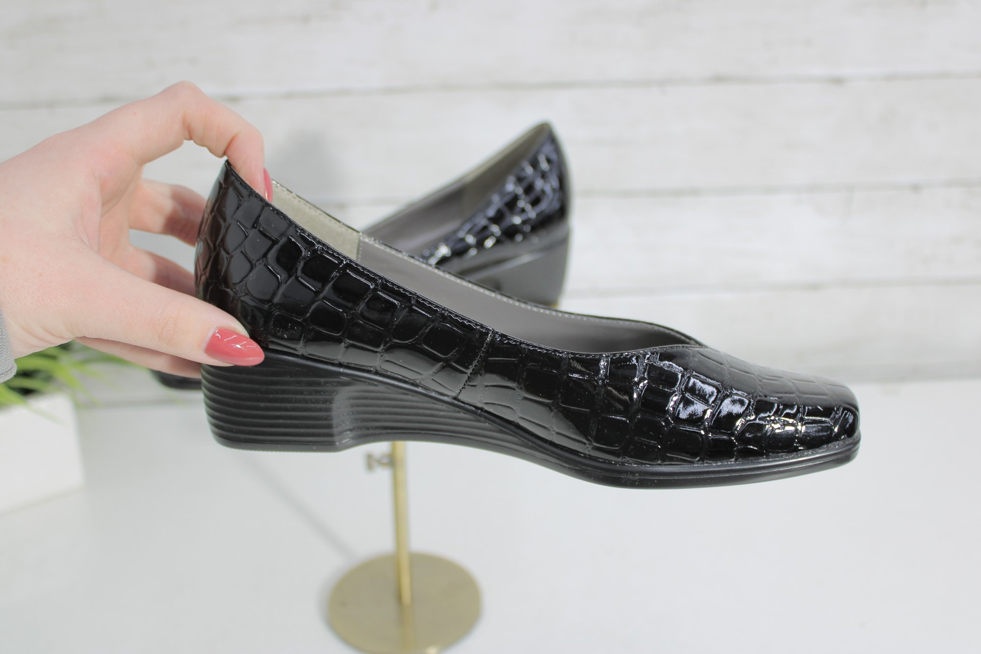 Sleek, comfortable pumps by Andiamo, designed for everyday elegance and all-day wear. These black leather shoes feature a glossy croc-embossed finish and a supportive wedge heel that offers both style and stability.