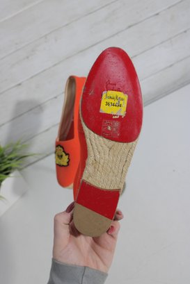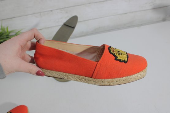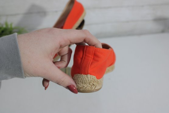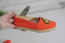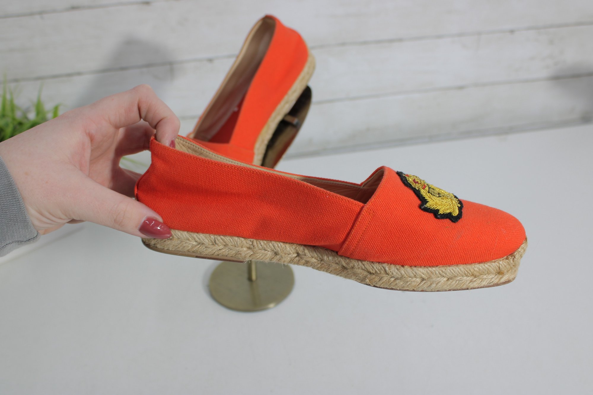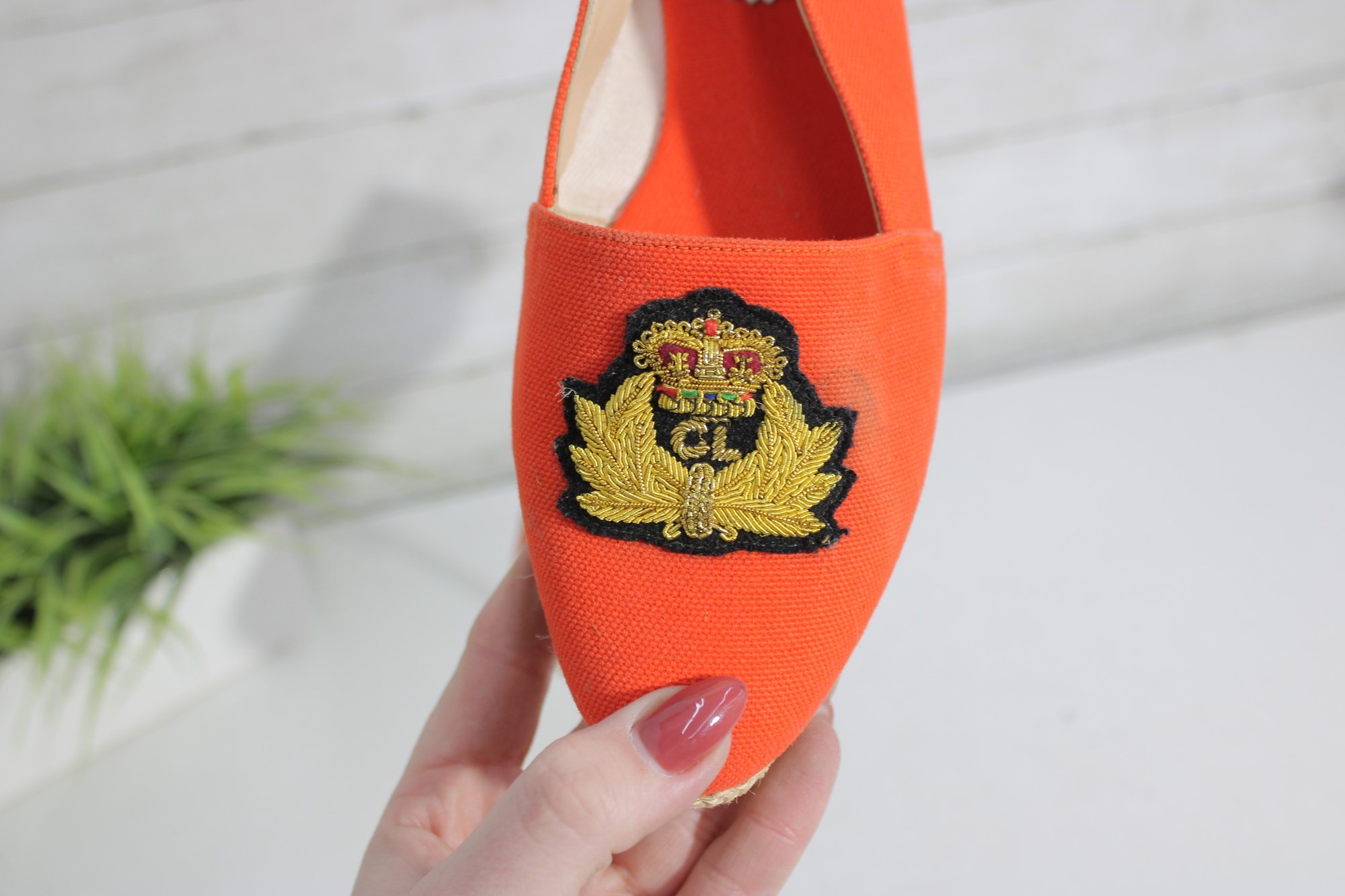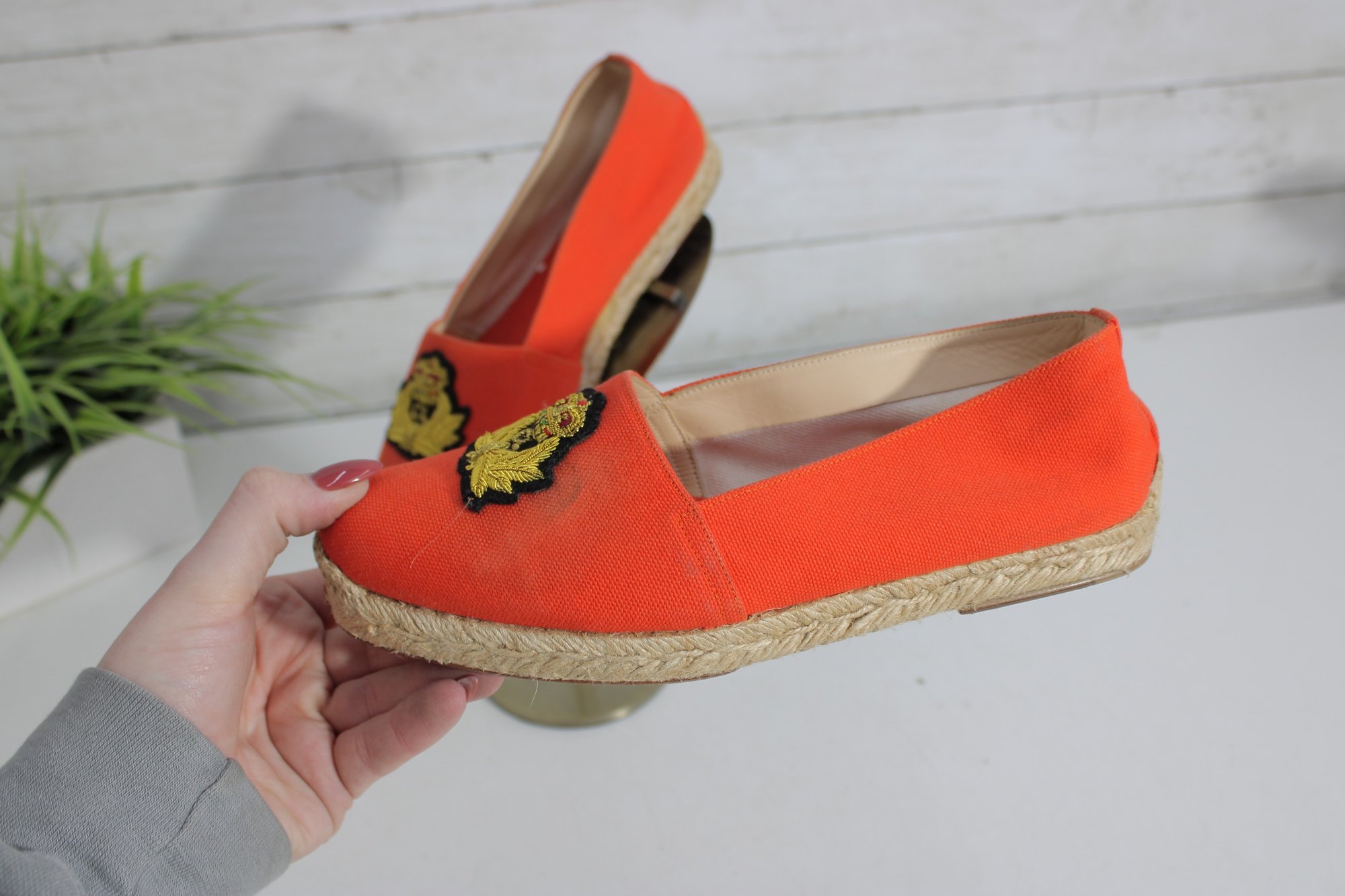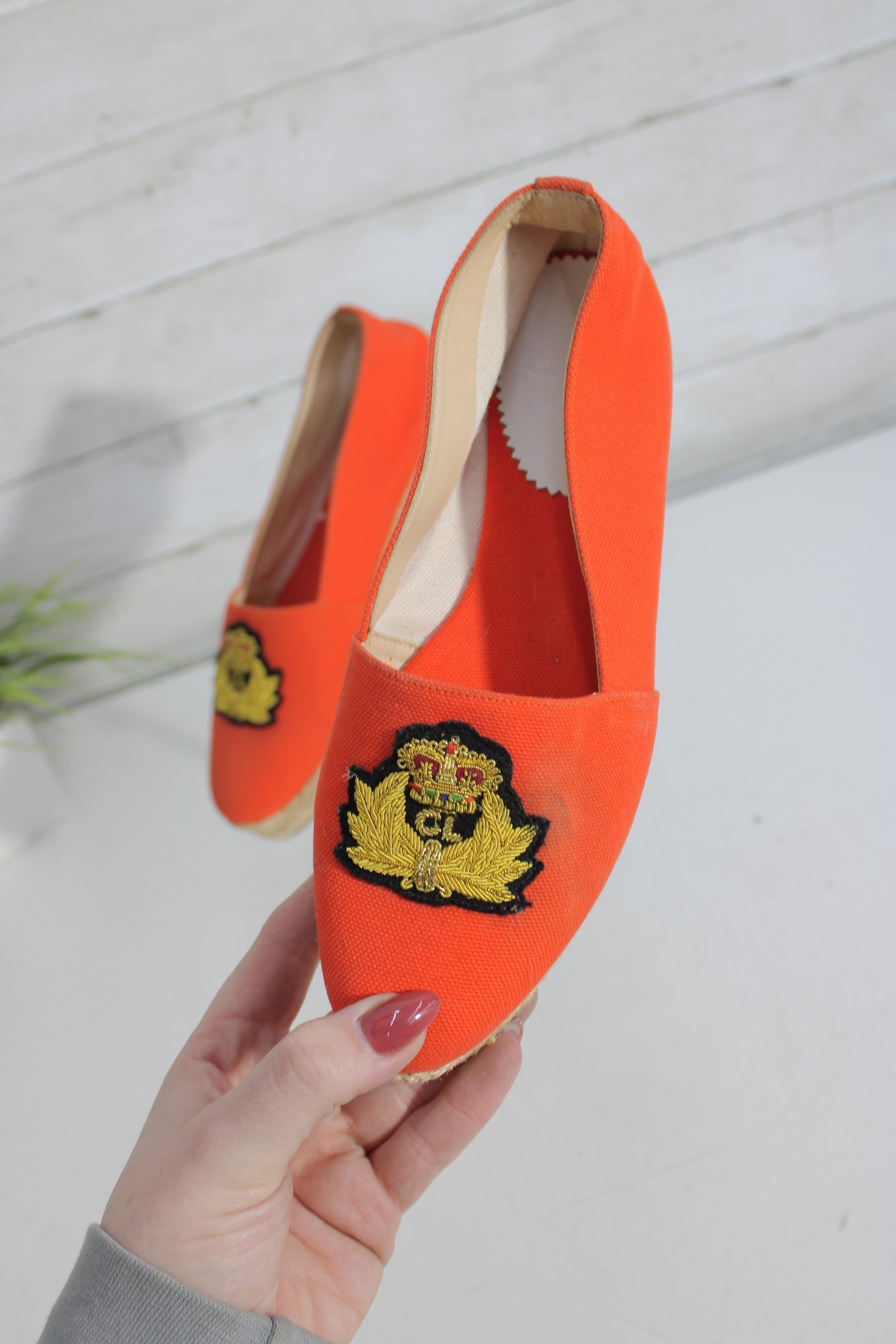 Bright, bold, and effortlessly stylish, these orange canvas espadrille flats feature a classic slip-on design with a decorative crest emblem on the vamp. Perfect for warm-weather wear, travel, or adding a pop of color to casual outfits.