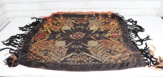 a 32" x 35" vintage silk-style tapestry textile featuring an intricate Middle Eastern-inspired design with mosques, crescent moons, stars, and floral motifs. The piece is richly colored in gold, red, and tan against a deep black background, creating a striking decorative look.