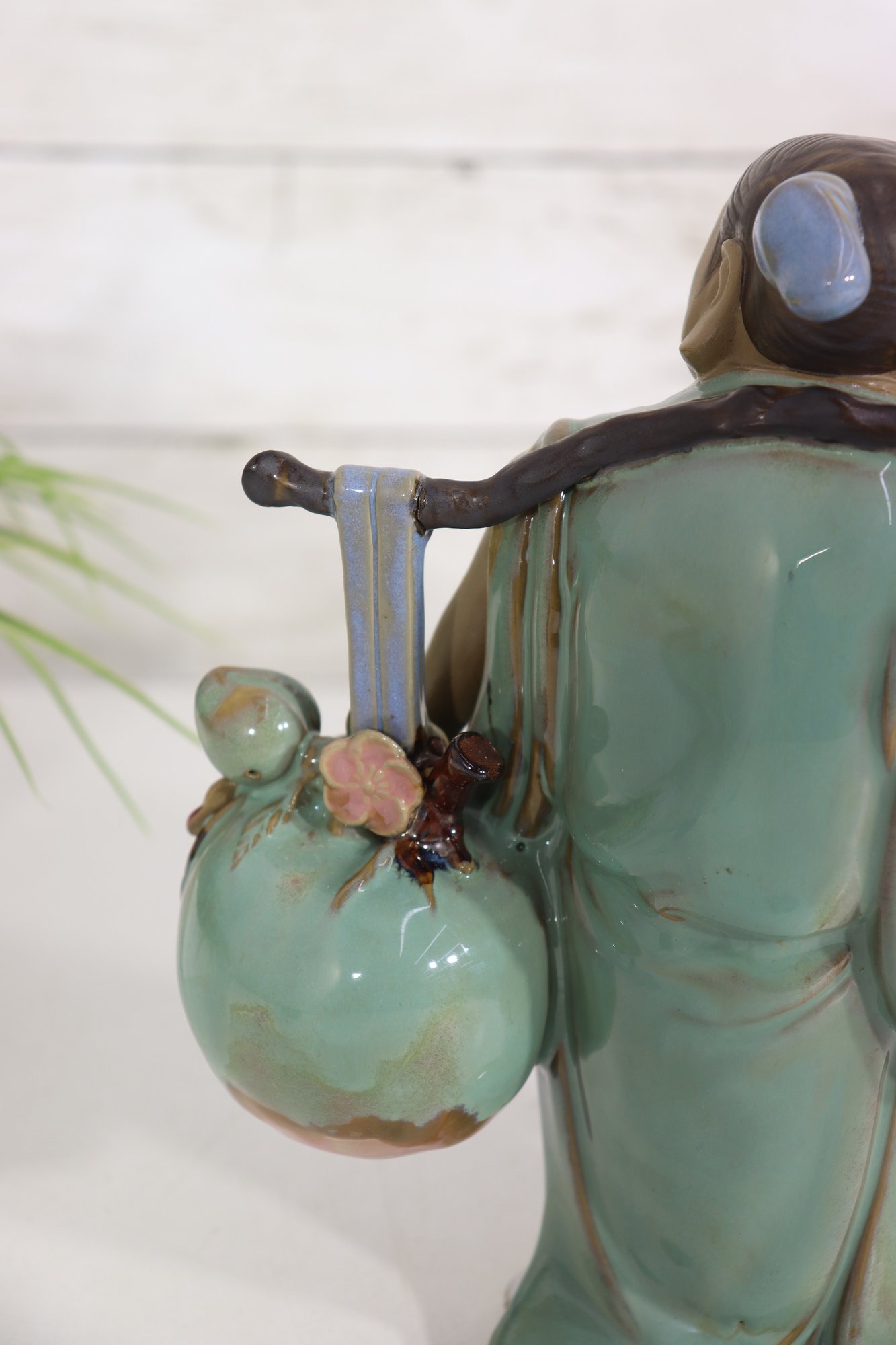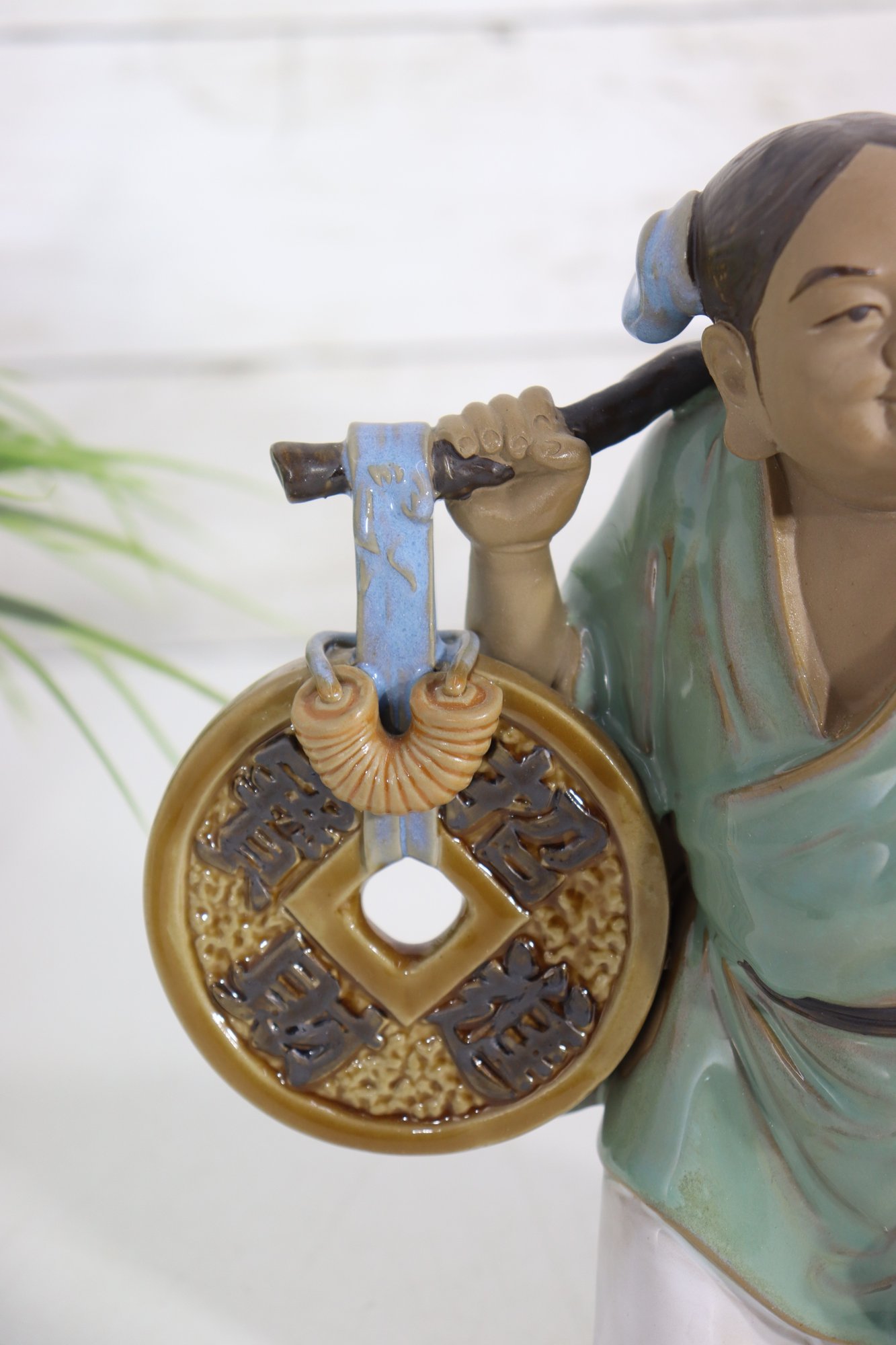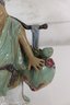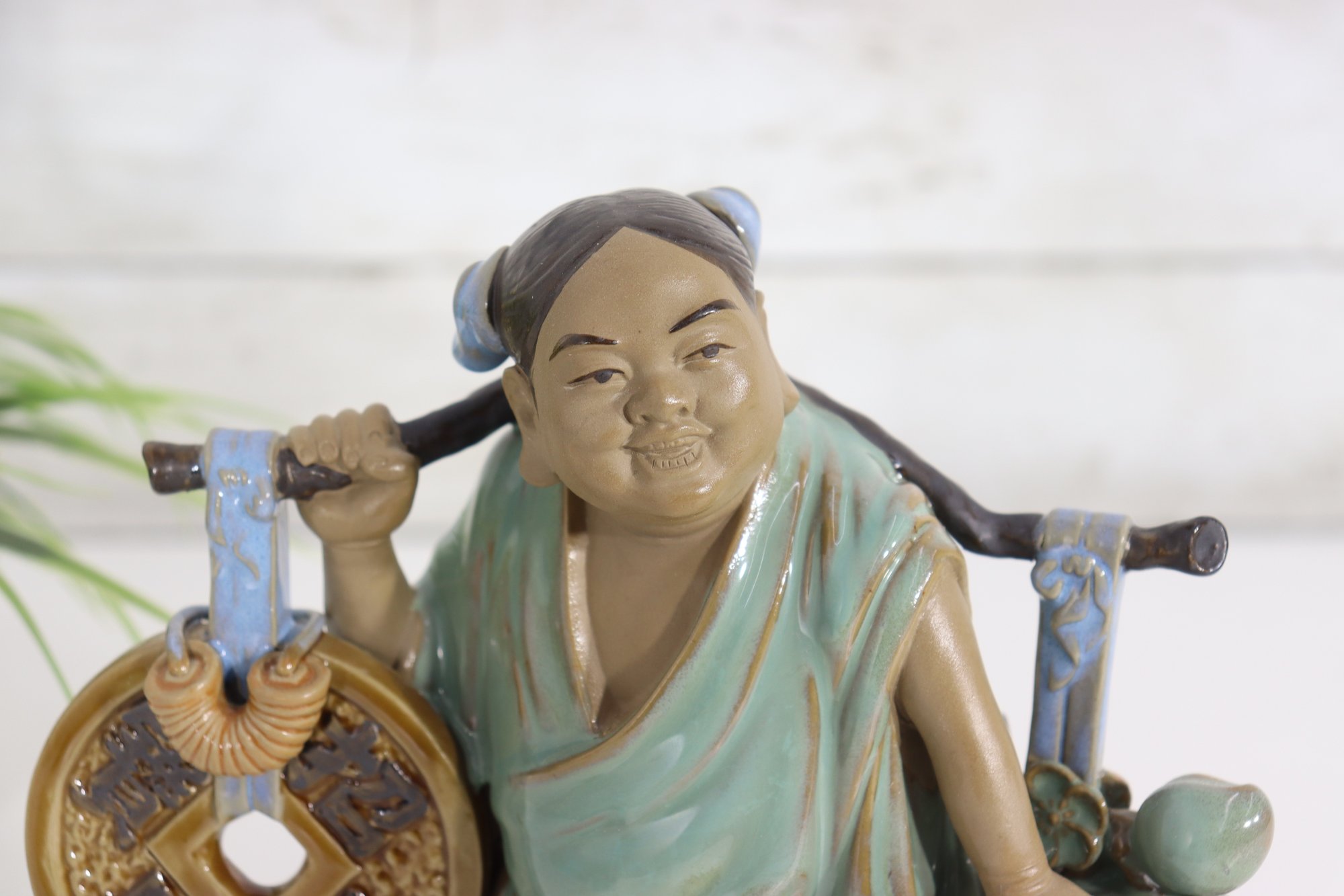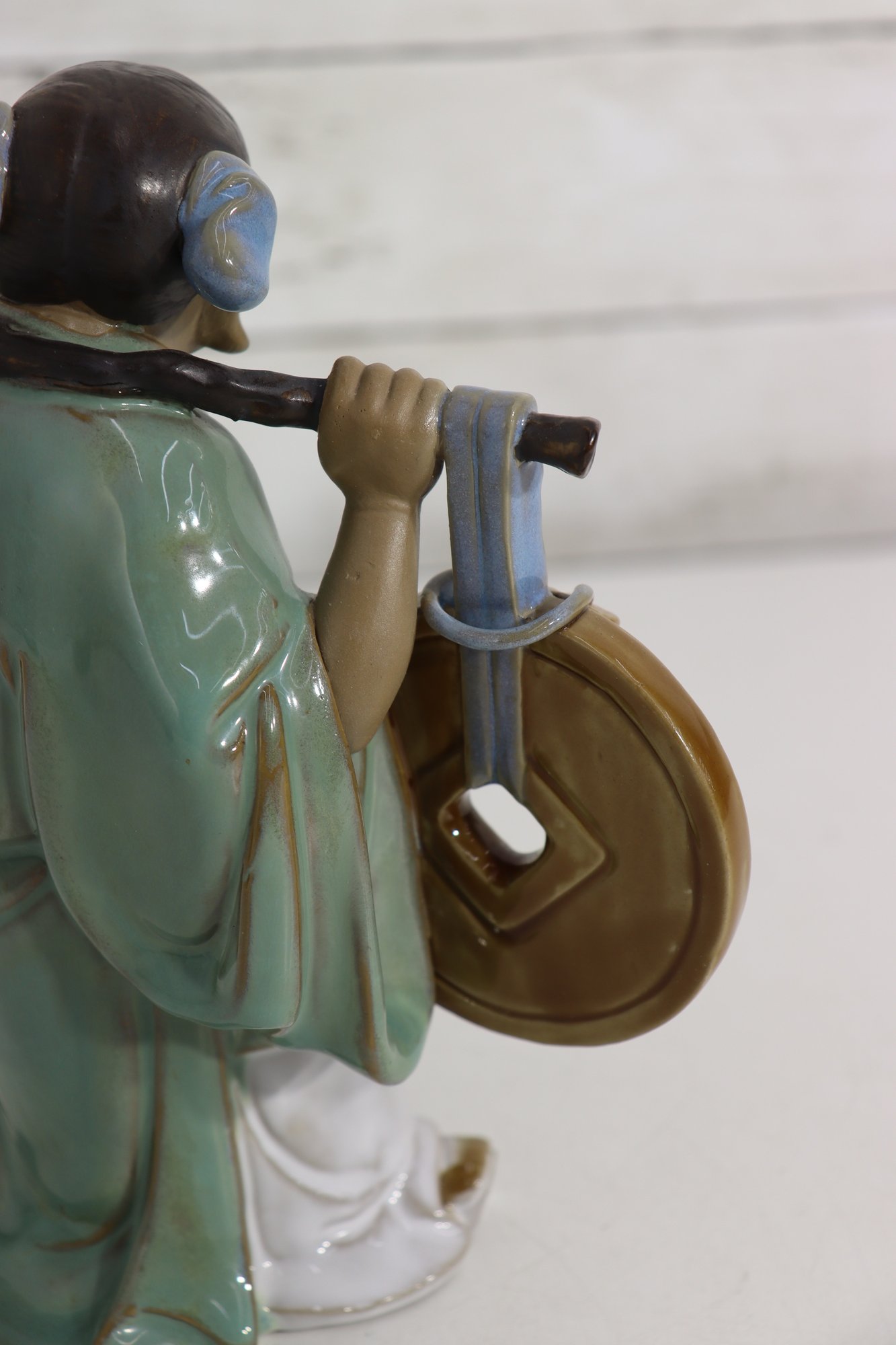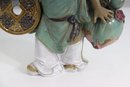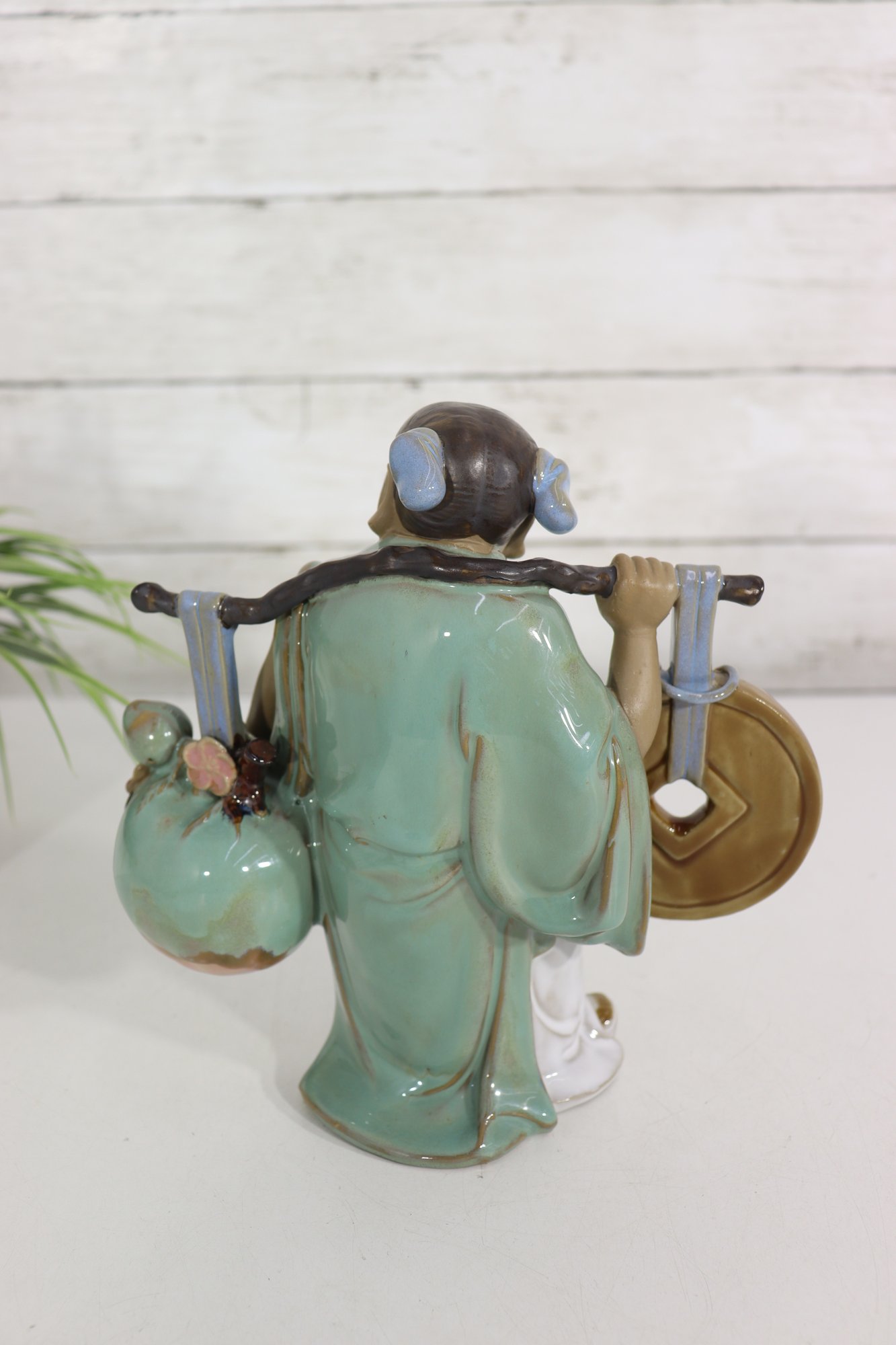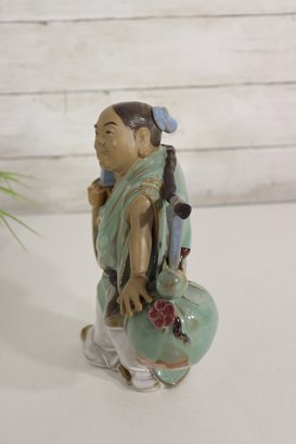 Charming vintage Asian porcelain figure depicting a smiling traveler carrying a large coin on one side and a basket of goods on the other. The figurine is richly glazed in soft greens, blues, browns, and whites, with detailed facial features and finely modeled clothing.