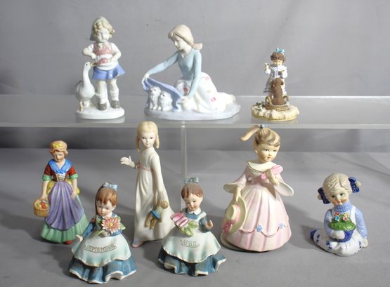 This collection includes a delightful array of characters, from youthful maidens in flowing dresses to a serene young woman with her loyal canines, each meticulously crafted with attention to detail. Two figurines, representing the months of April and September, add a personal touch to the set, making it an ideal gift for those special celebratory months. The soft pastel palette and glossy finish bring these dainty figures to life