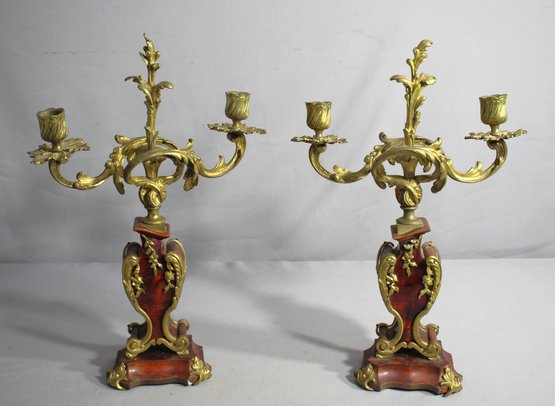 An unusual pair of late 19th century, French, Louis XV style tortoiseshell and ormolu mounted candelabra. The rococo scrolling acanthus cast twin sconces with central finial, supported by an urn and standing on a shaped platform base