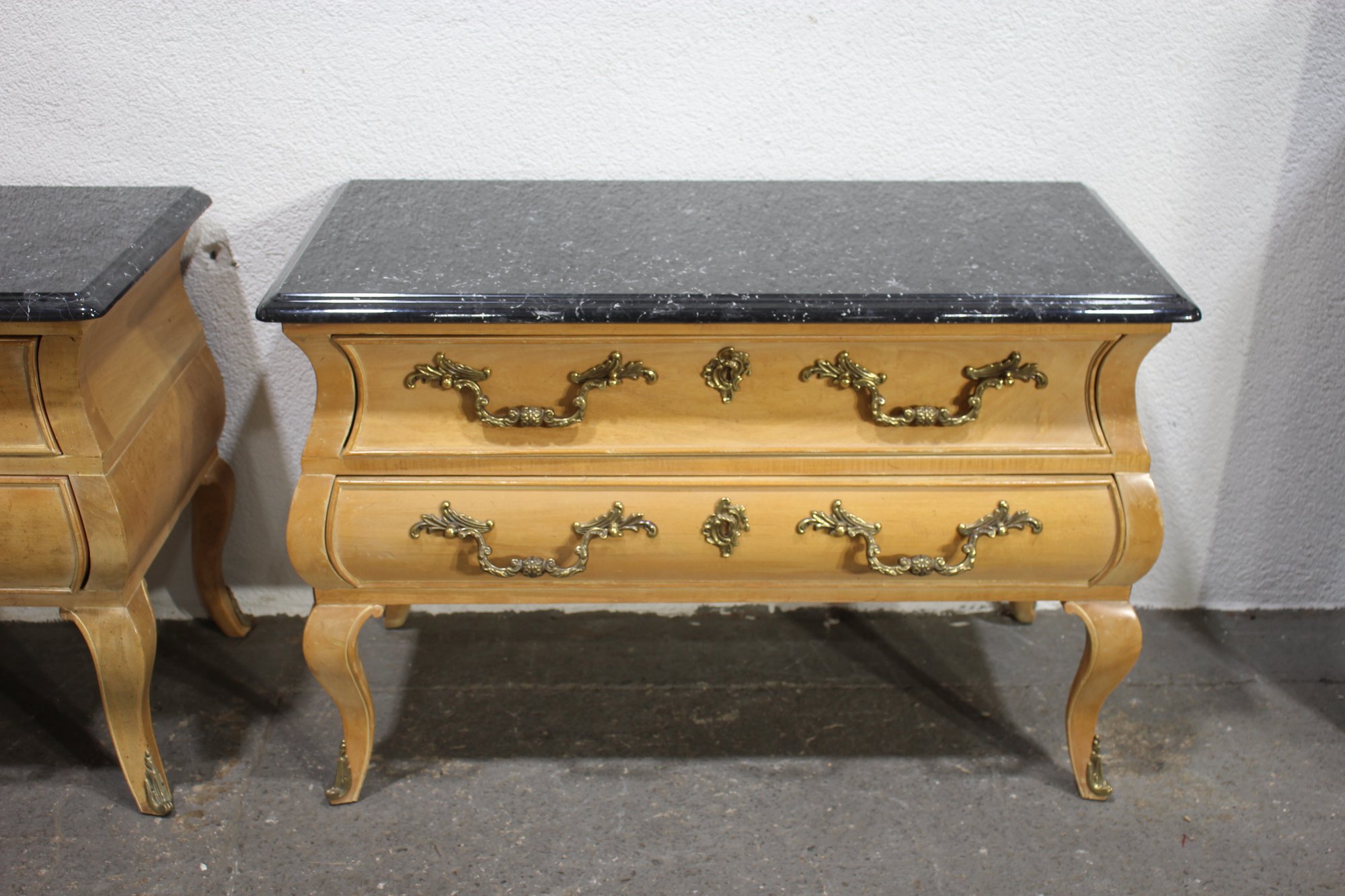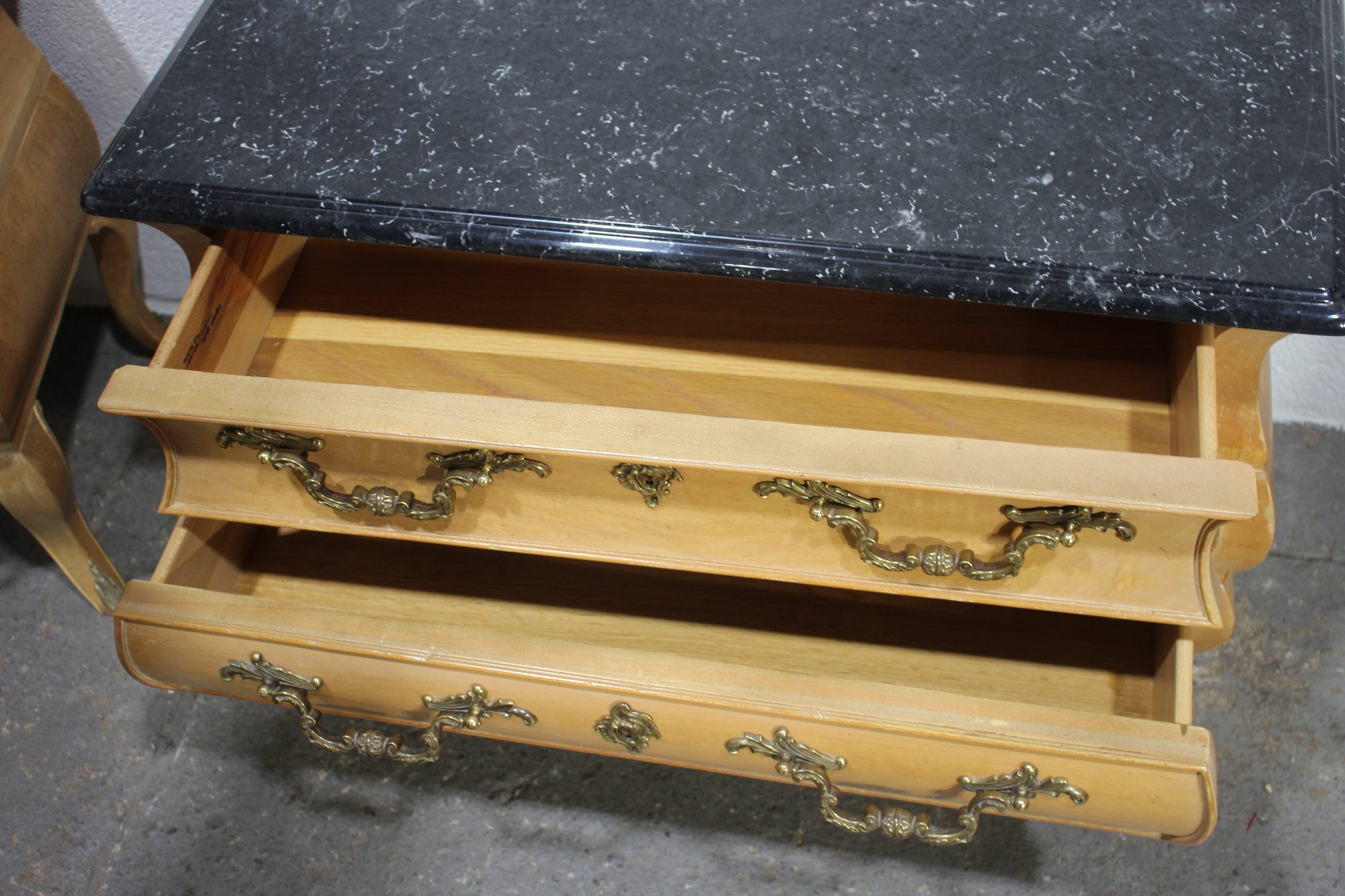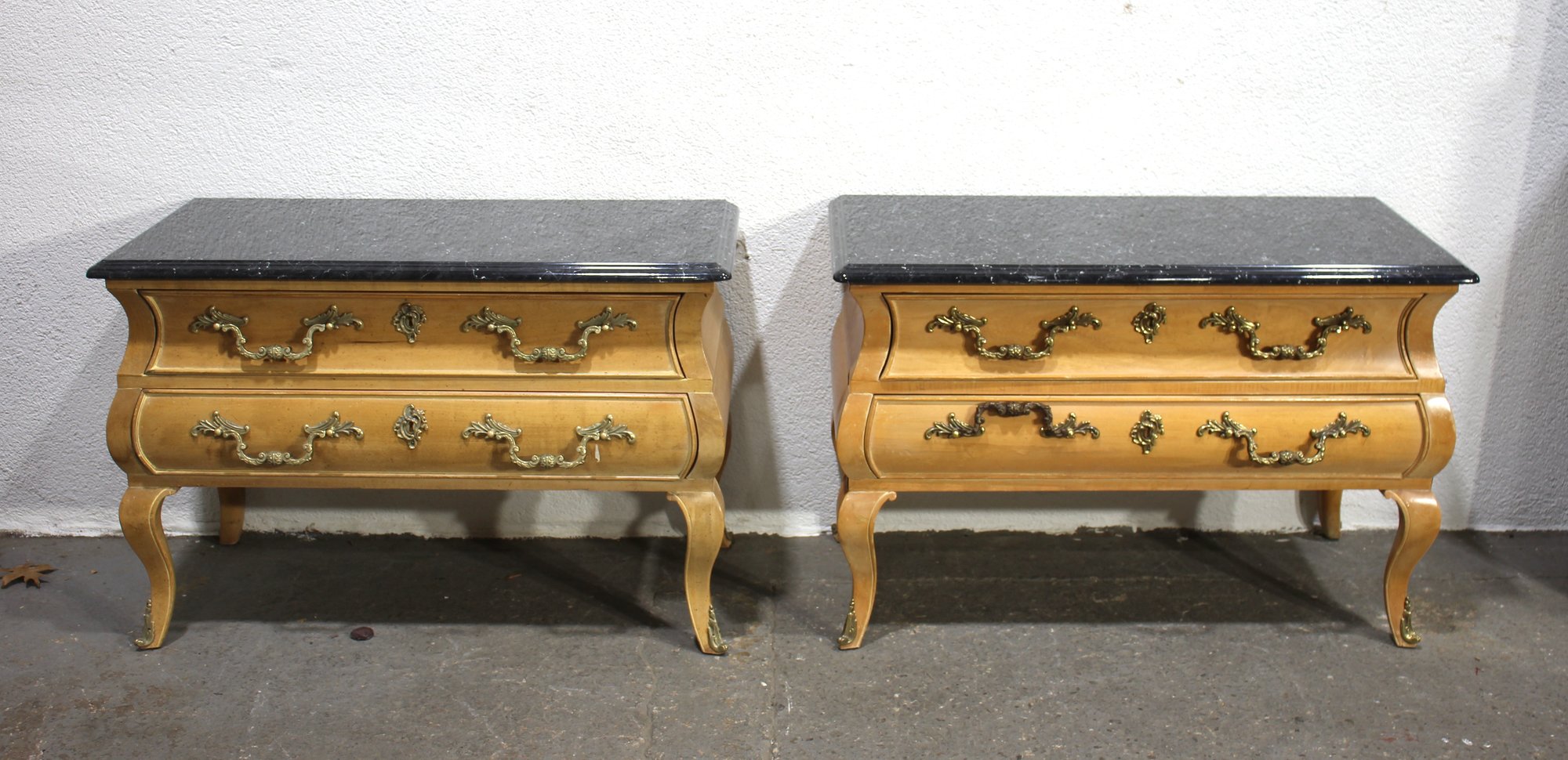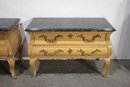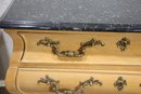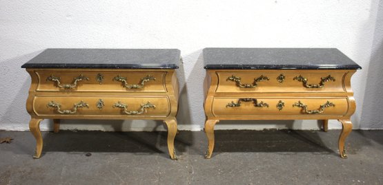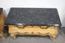 A Pair of Vintage, Antique Mount Airy French Accent Nightstands. Featuring gorgeous marble tops, brass accent pulls and details. In good used condition for age, showing normal signs of wear and tear.