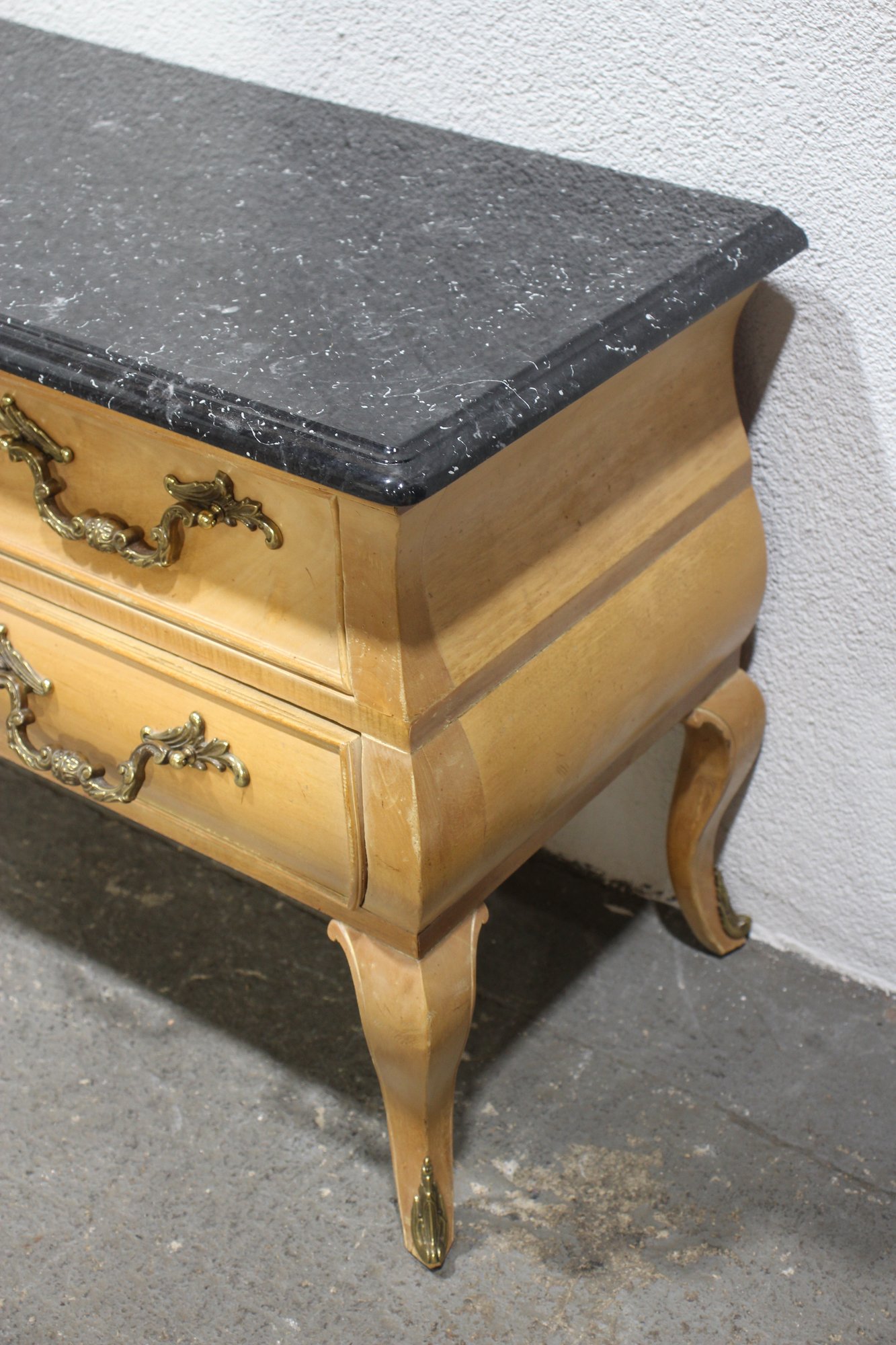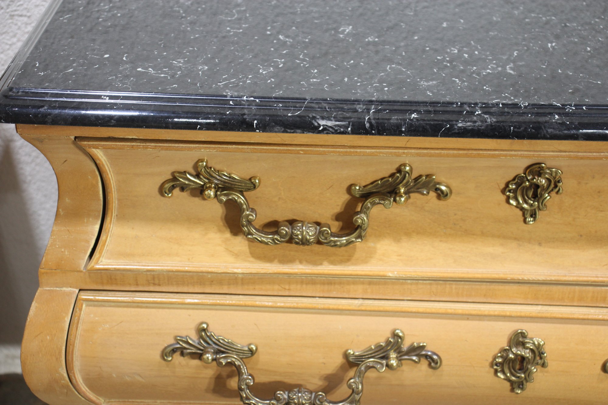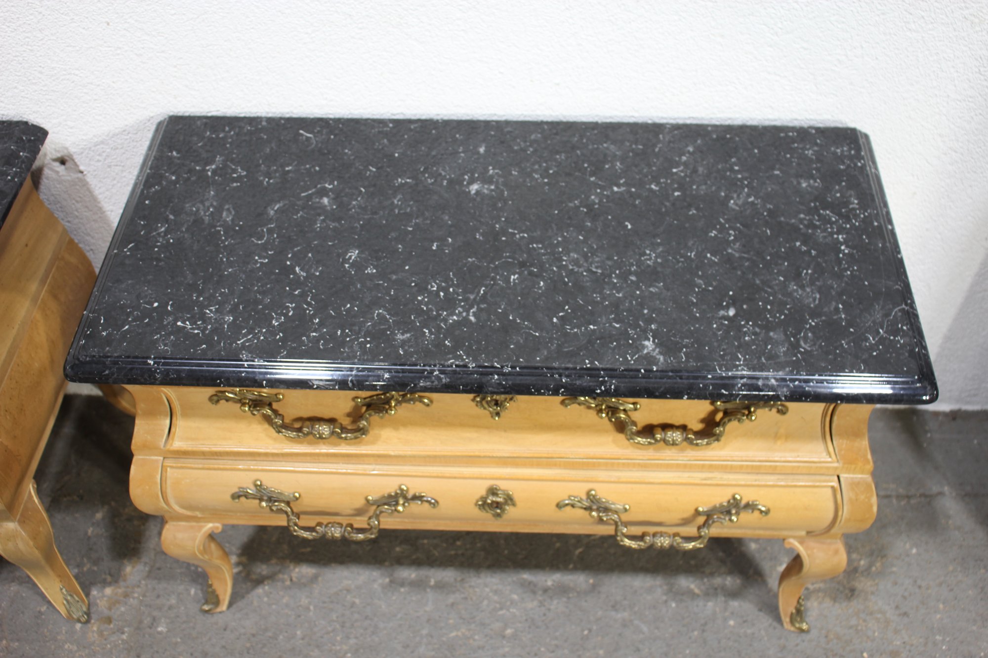 A Pair of Vintage, Antique Mount Airy French Accent Nightstands. Featuring gorgeous marble tops, brass accent pulls and details. In good used condition for age, showing normal signs of wear and tear.