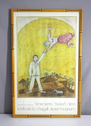 The print is encased in a bamboo-style wooden frame, enhancing its vintage aesthetic. The exhibition text in both English and Hebrew provides historical context, making this piece an excellent collector’s item for lovers of Chagall’s work, modern art, or museum exhibition memorabilia.