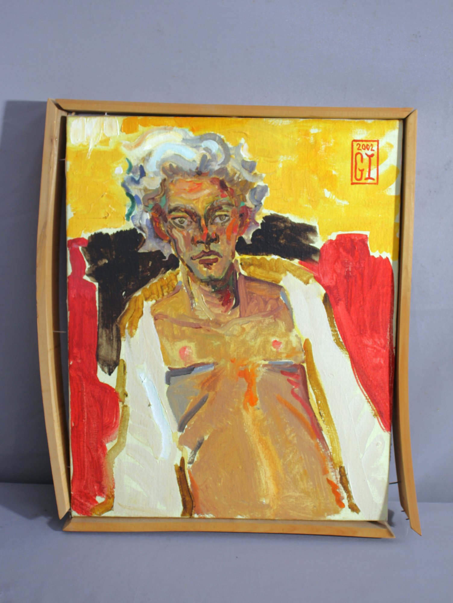 "A Wrecked from the Port" is a vibrant and expressive oil painting by Gilabaca from Valparaiso, created in 2002. This artwork features a compelling portrait of a figure set against a backdrop of bold, sweeping strokes in yellow and red, suggesting a dynamic yet somewhat tumultuous atmosphere.