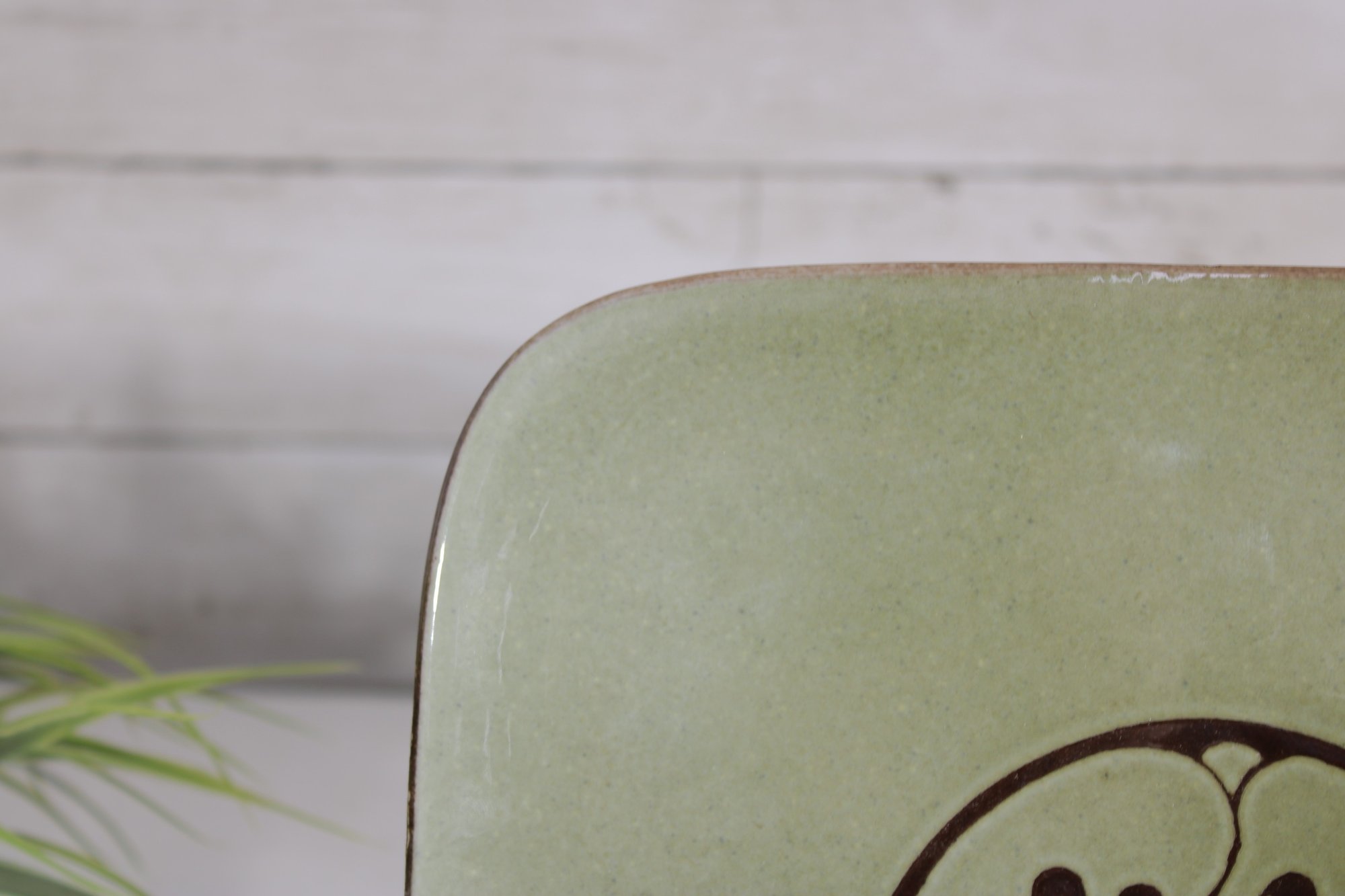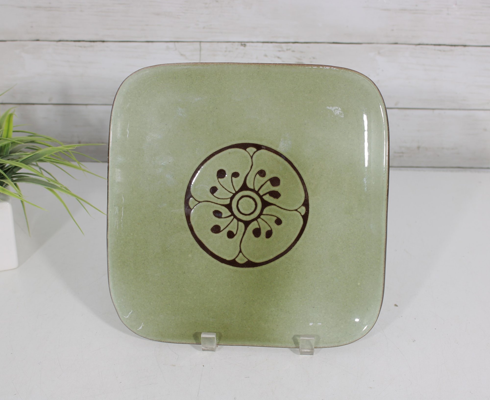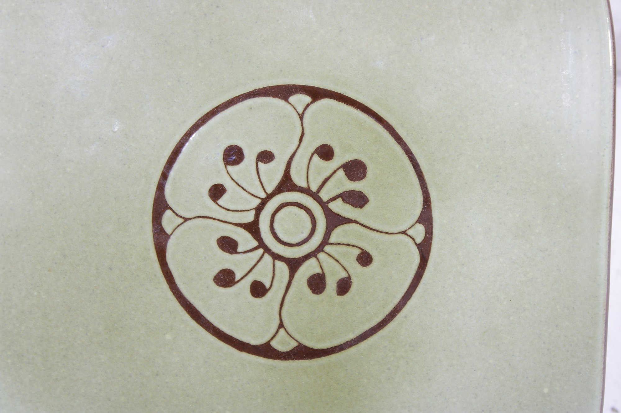 Beautiful handmade ceramic plate from Abbaye Notre-Dame du Bec, featuring a soft celadon green glaze accented by a simple yet elegant brown floral motif at the center.