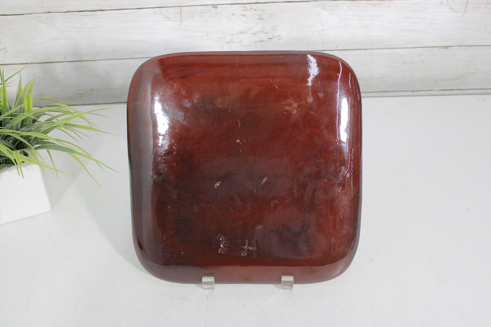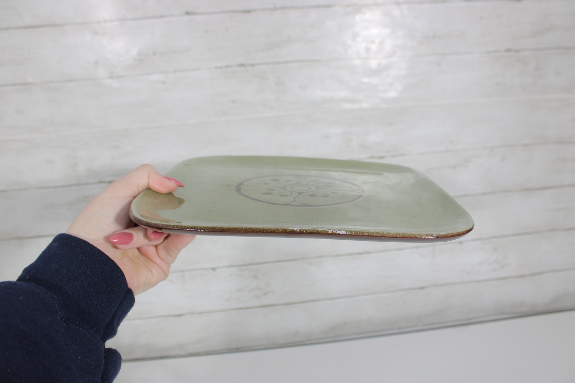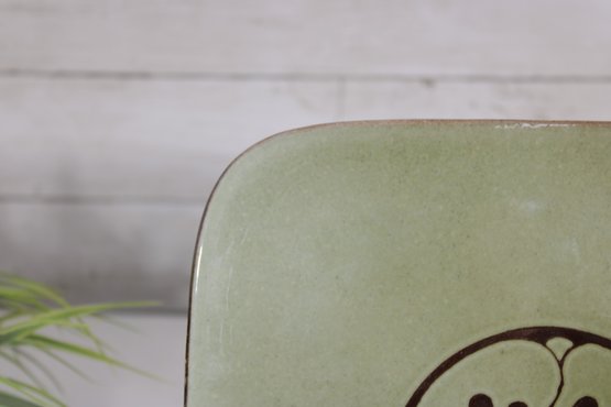 This square plate has gently rounded corners and a slightly raised rim, giving it a clean, modern silhouette while maintaining a handcrafted, artisanal feel. The underside shows impressed marks consistent with handmade monastery pottery.