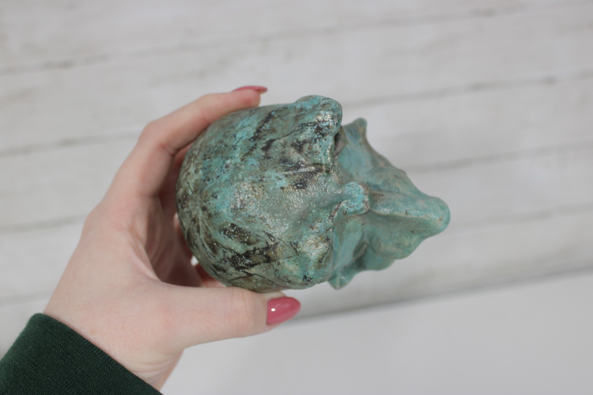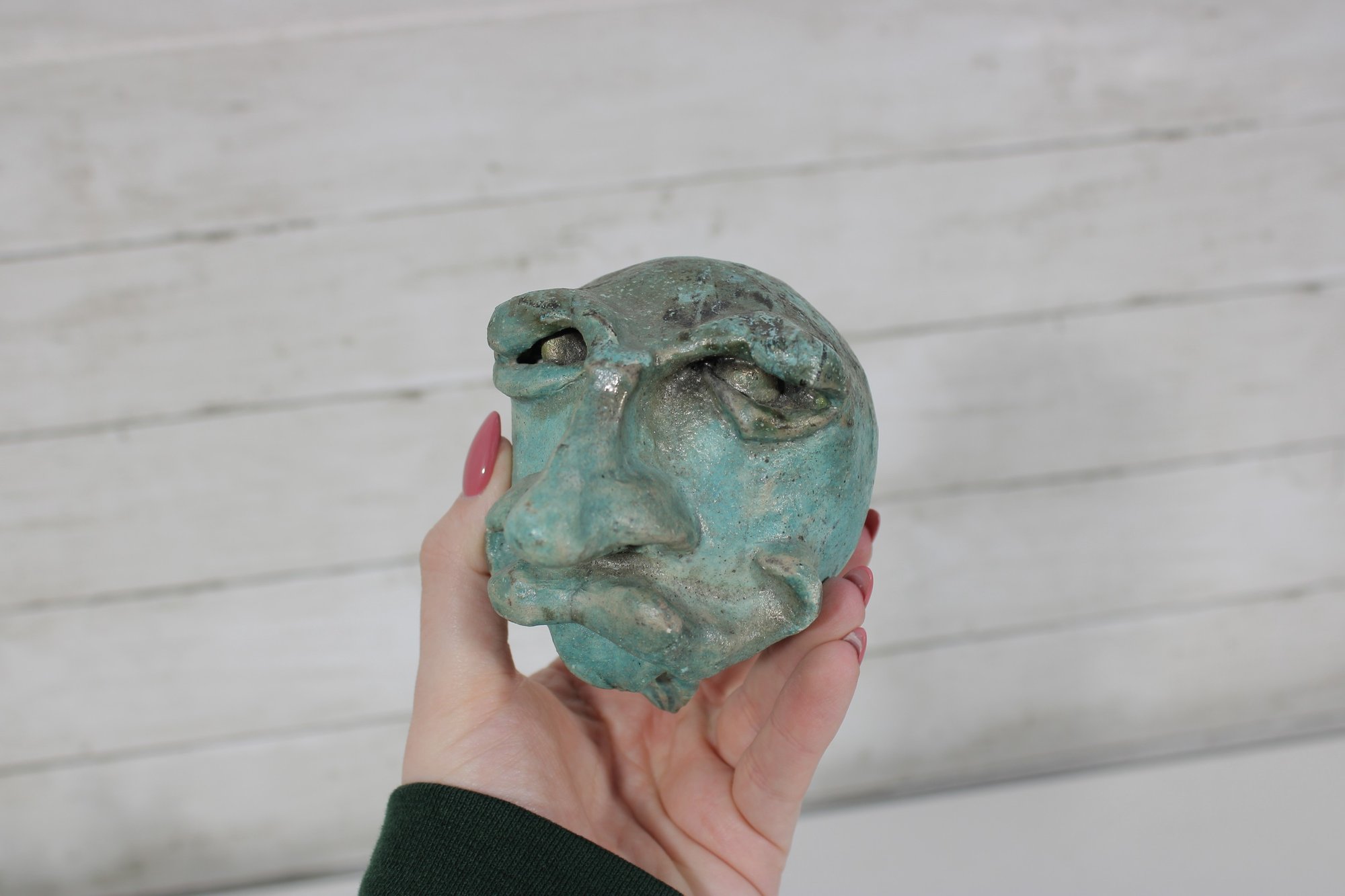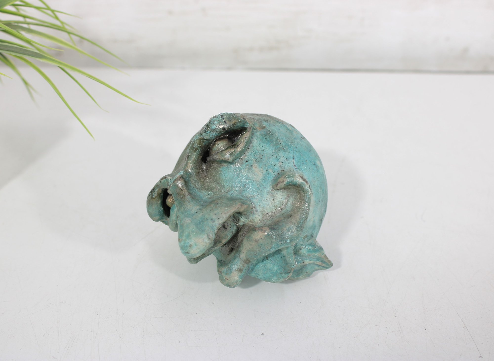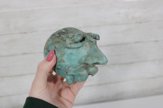 a small abstract face sculpture featuring a stylized human head with exaggerated facial features and an expressive form. The piece has a textured surface with a verdigris-style green patina, giving it the appearance of aged bronze or oxidized metal.
