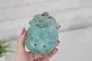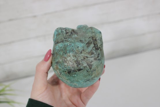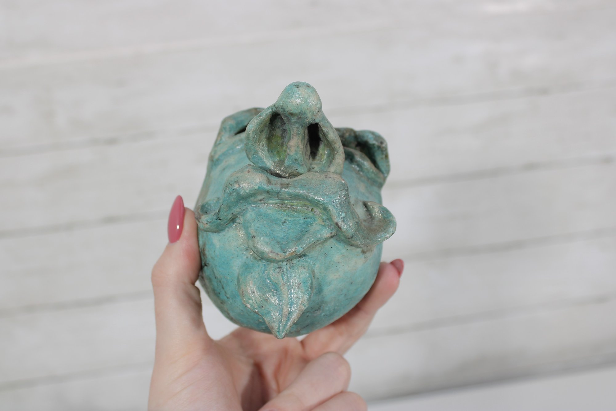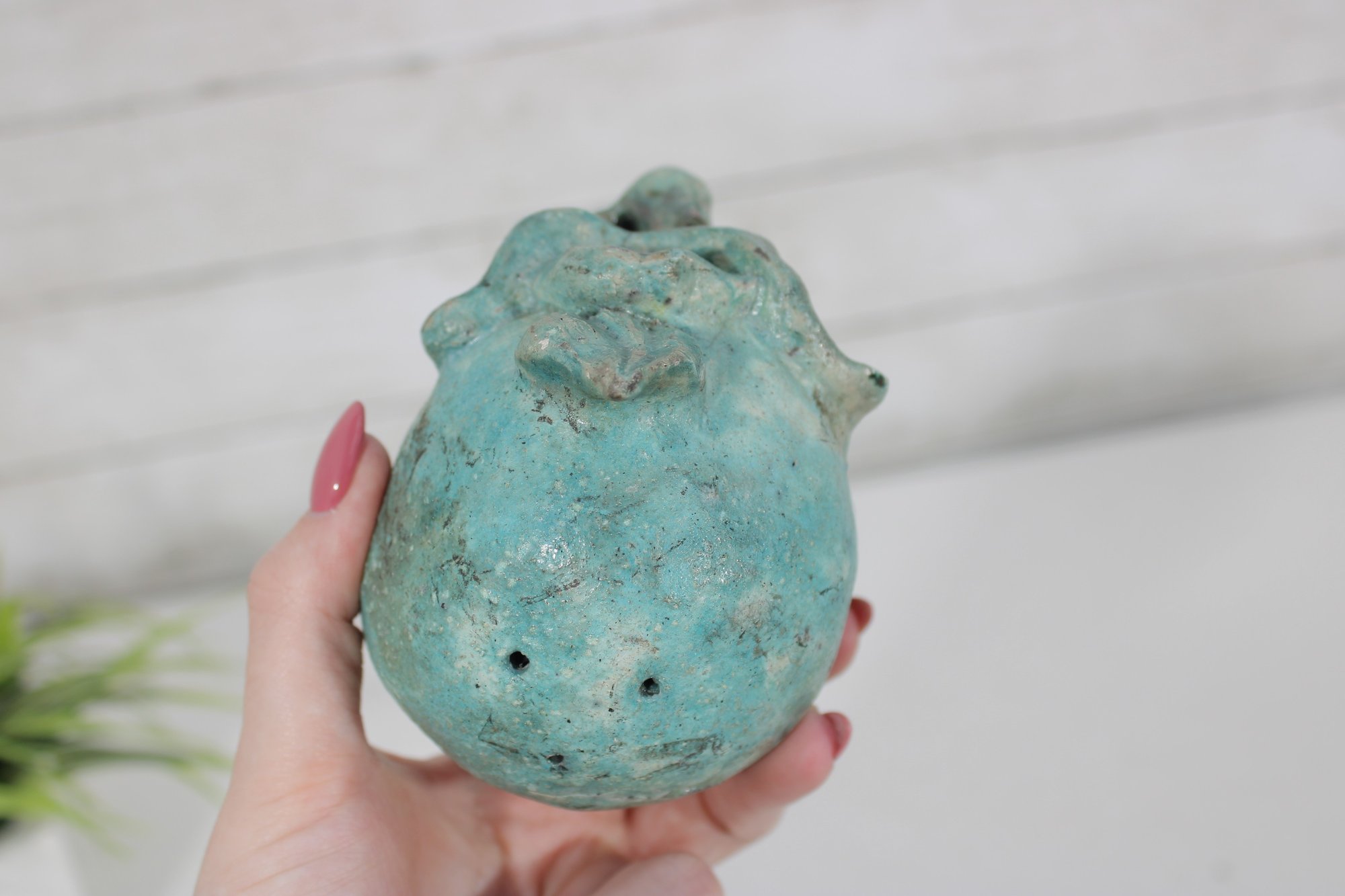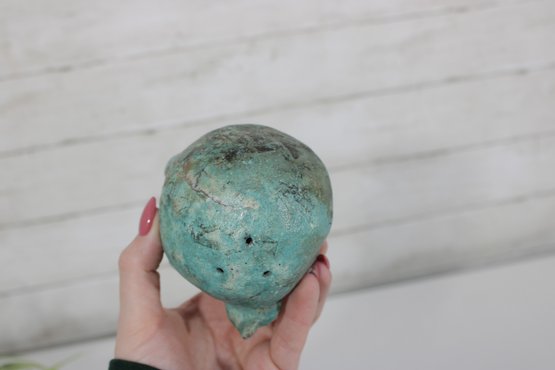 a small abstract face sculpture featuring a stylized human head with exaggerated facial features and an expressive form. The piece has a textured surface with a verdigris-style green patina, giving it the appearance of aged bronze or oxidized metal.