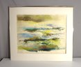 This striking piece is an original abstract watercolor painting depicting a serene landscape with vibrant green, blue, and earthy tones. The soft yet dynamic brushstrokes evoke a sense of tranquility, reminiscent of natural wetlands or open fields. The painting is signed by the artist in the lower section, adding authenticity and character to the artwork.