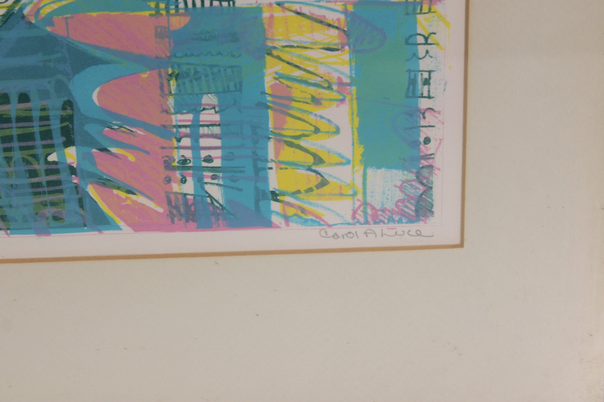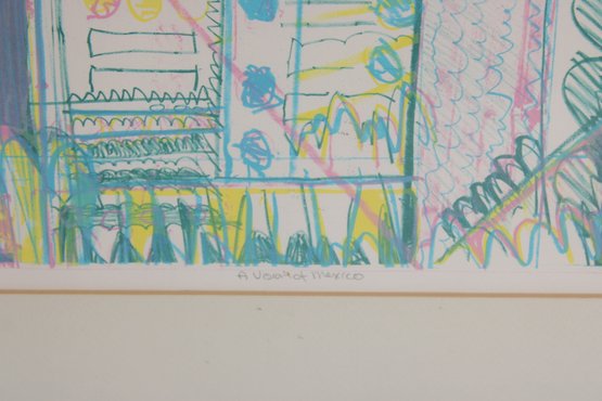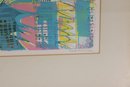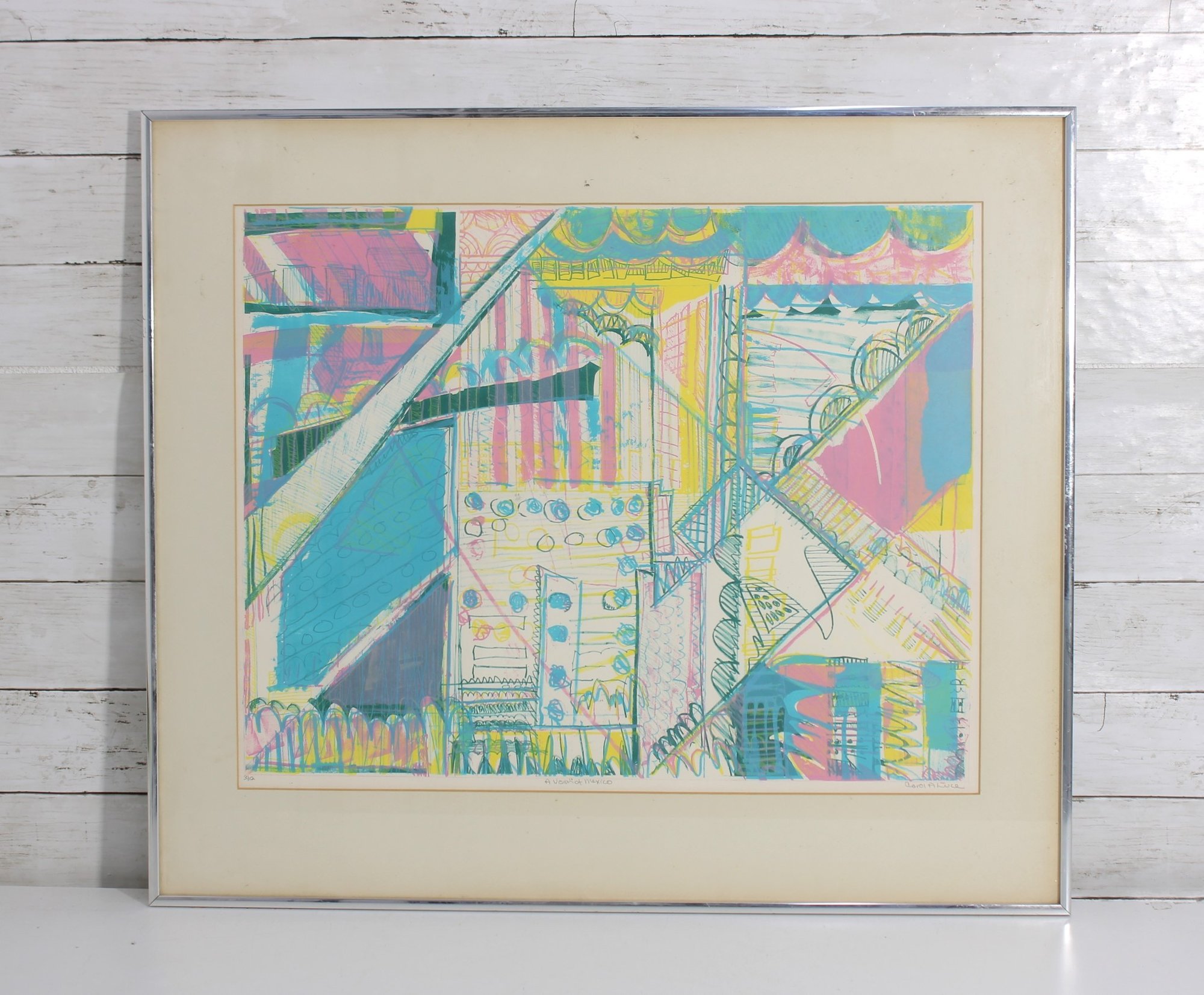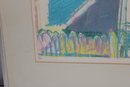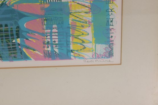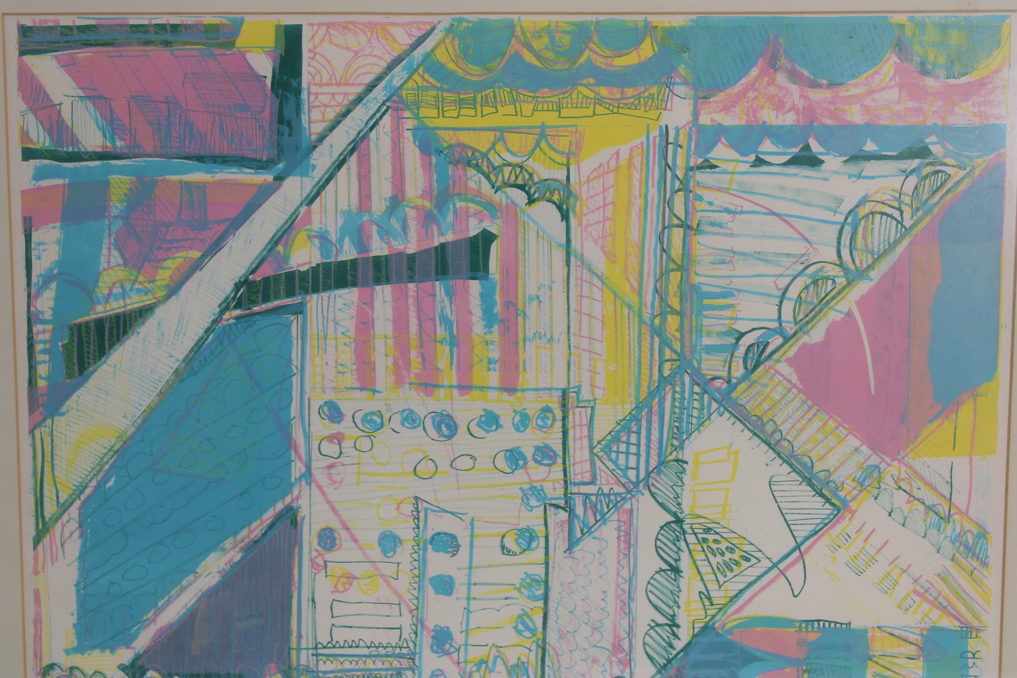 Vibrant and visually engaging abstract modernist print, pencil signed and numbered 3/12, indicating a scarce limited edition. This colorful composition features a dynamic architectural-inspired design with bold geometric forms, layered linework, and energetic use of pastel tones including teal, pink, yellow, and lavender.