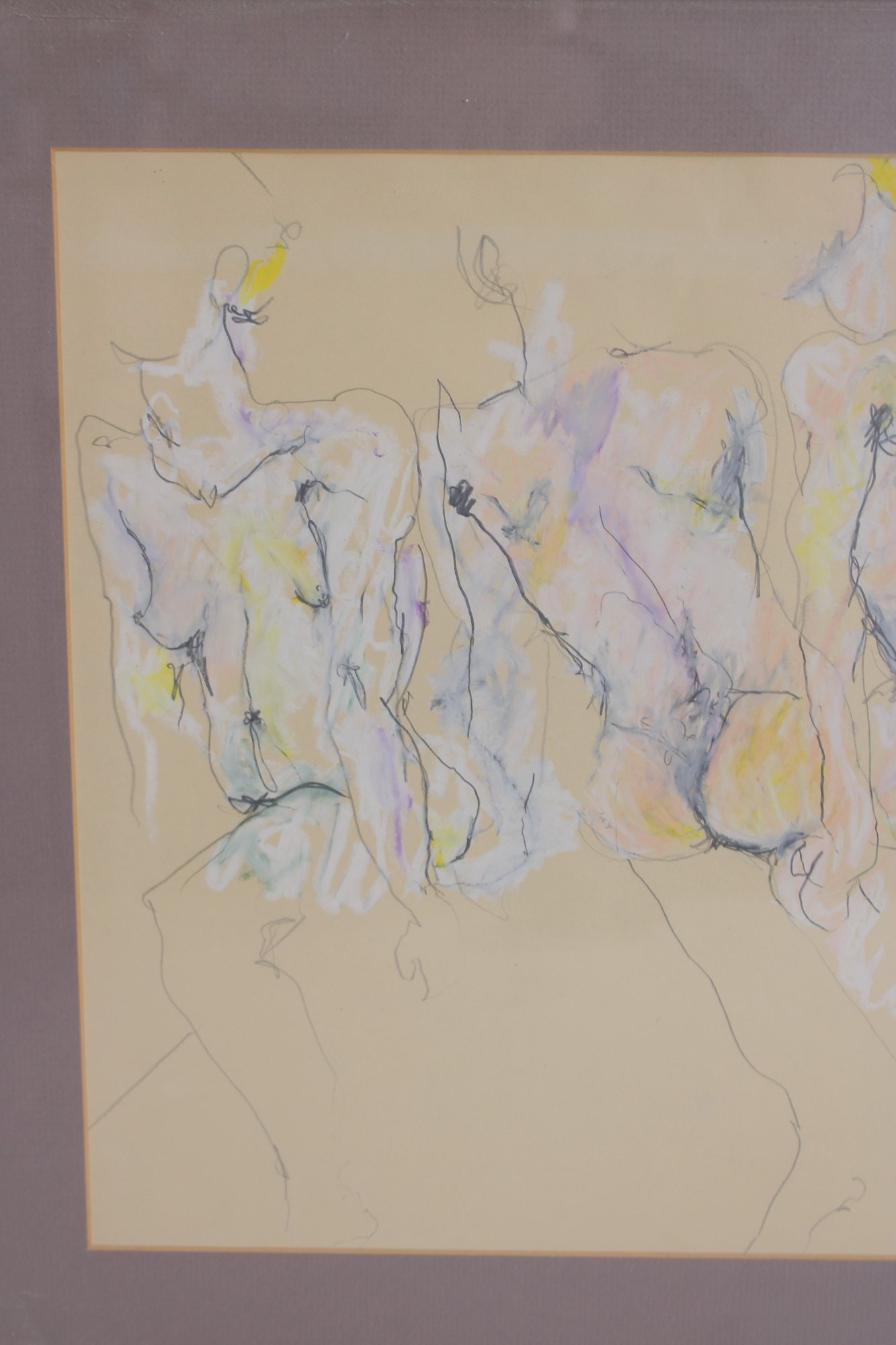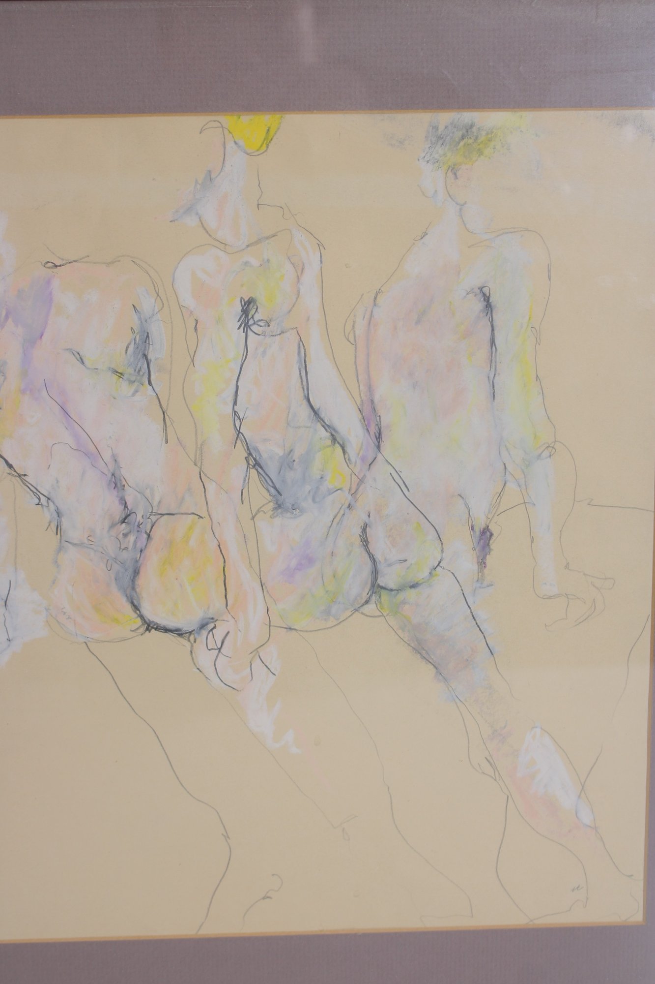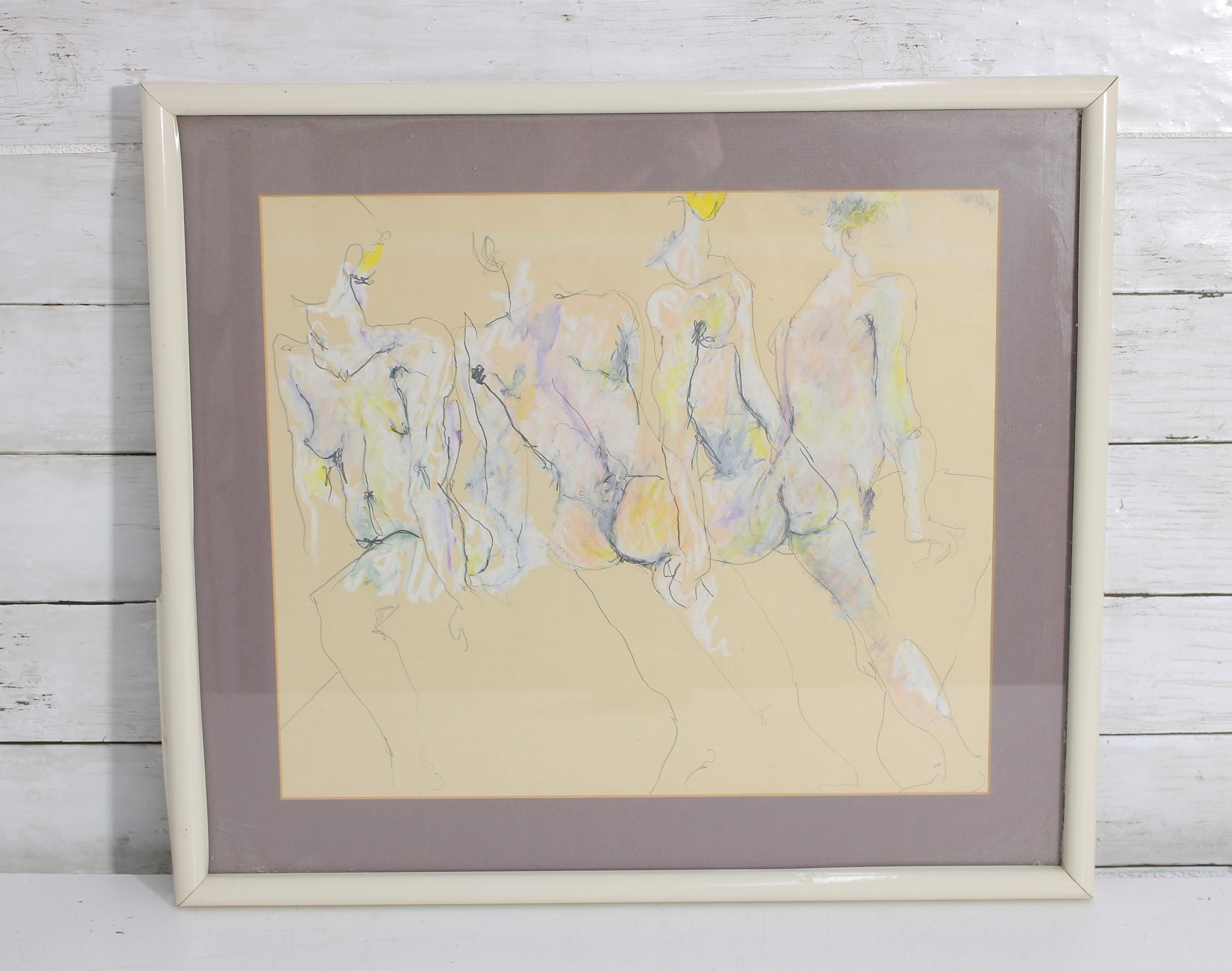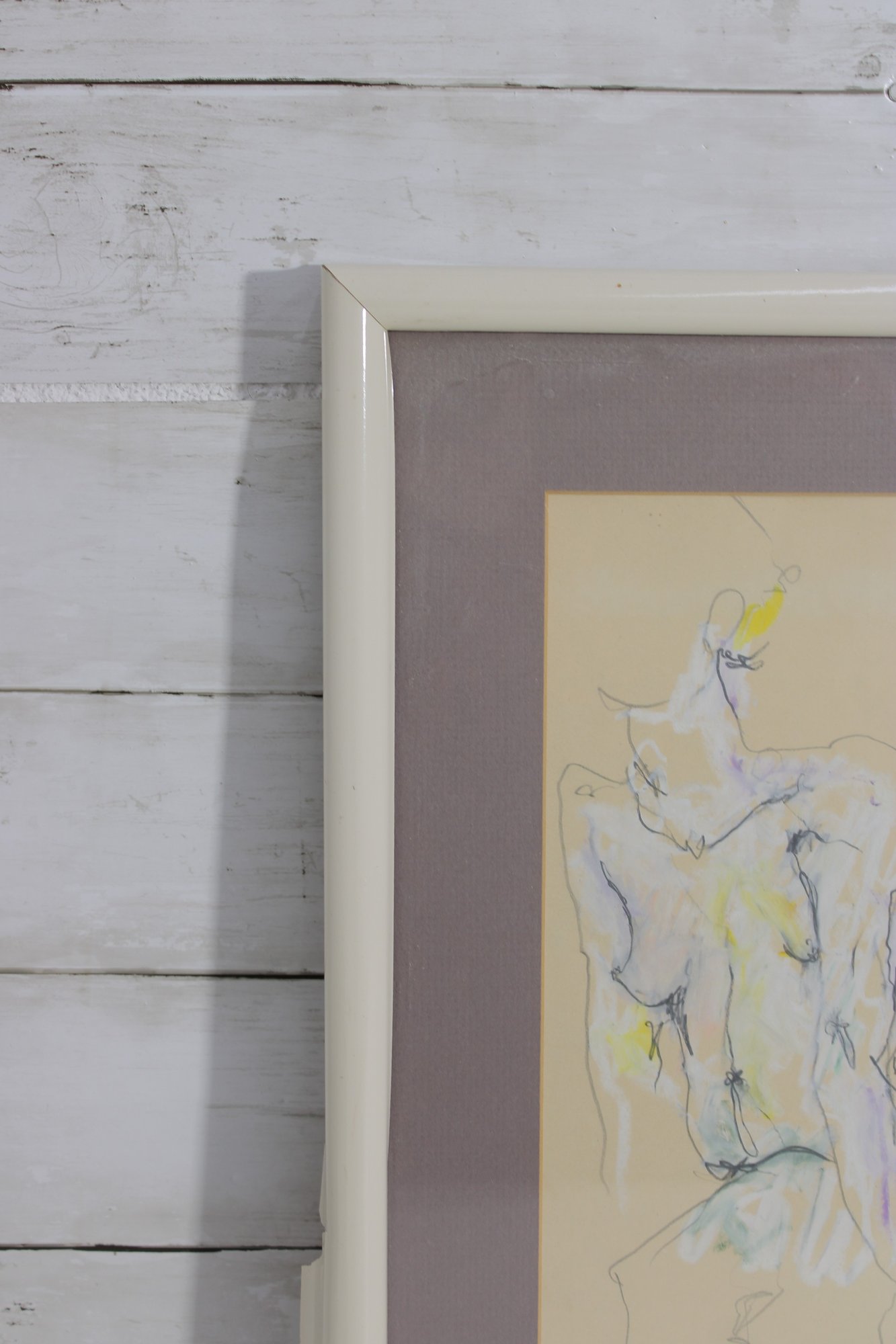 a soft and expressive abstract figure drawing featuring a group of loosely rendered nude forms. The composition uses delicate pastel tones—light blues, yellows, and subtle earth hues—creating a gentle, flowing sense of movement and form.
