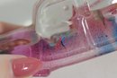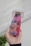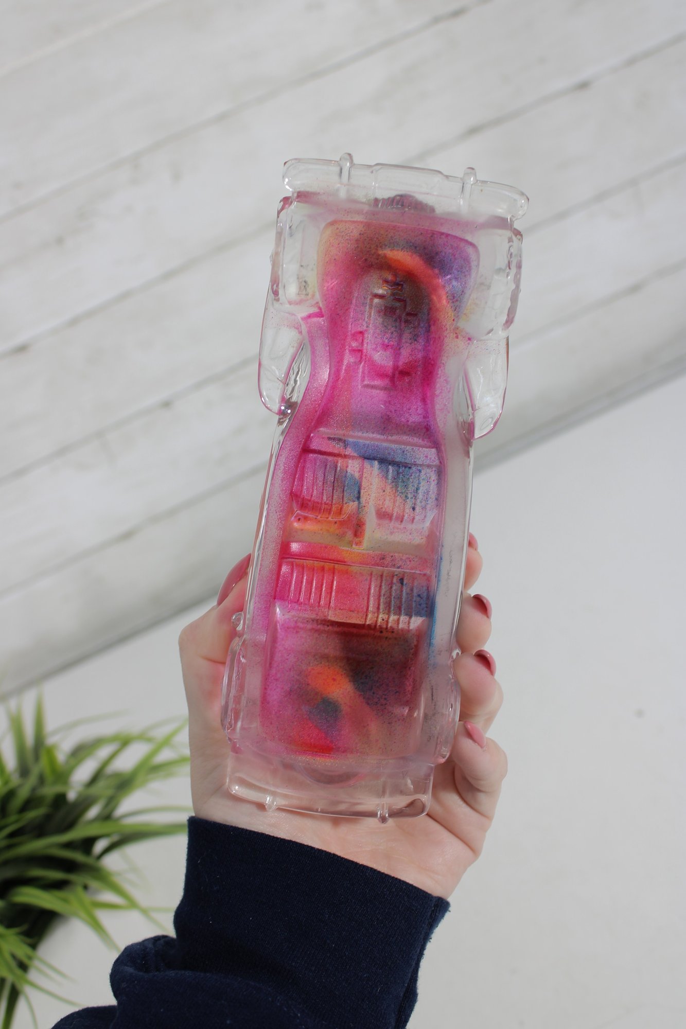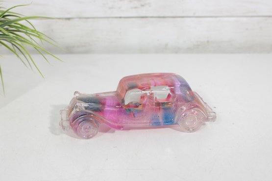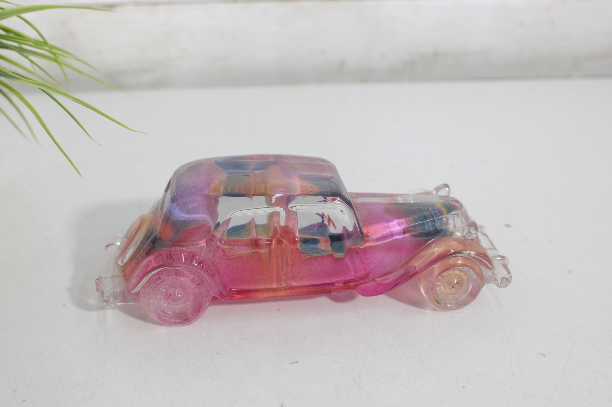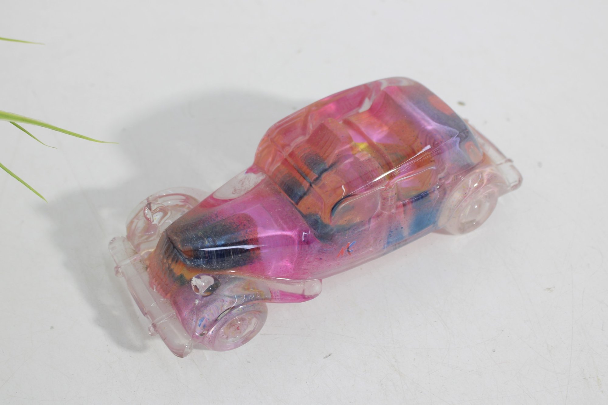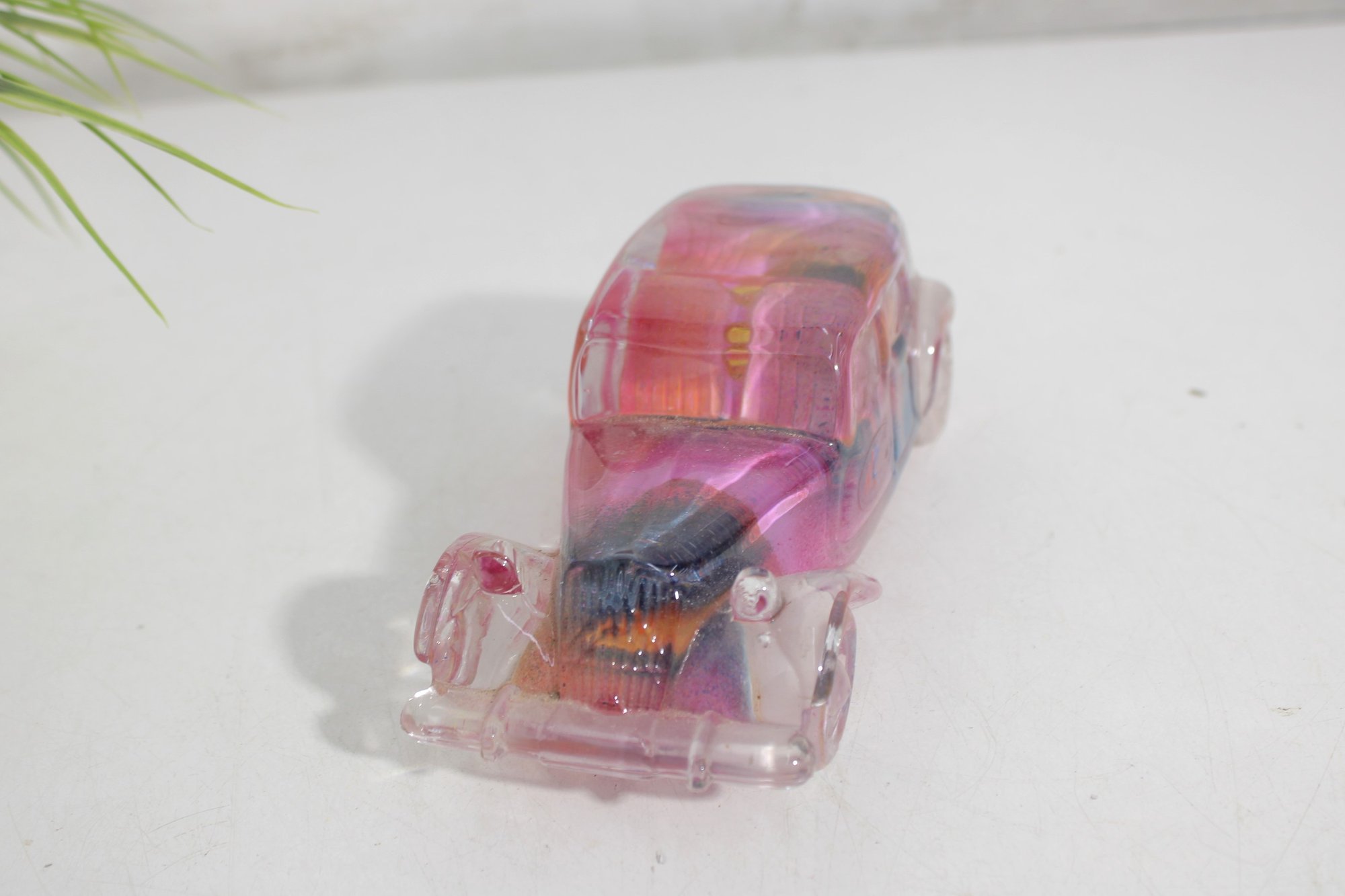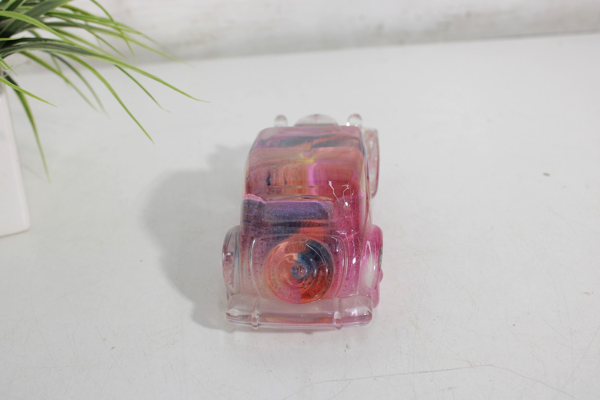 The translucent body reveals the interior contours and stylized engine detailing, while the shimmering coloration creates a striking, almost oil-slick effect that changes with the light. The wheels and body are smoothly formed, giving the piece a sleek, modern yet nostalgic aesthetic.