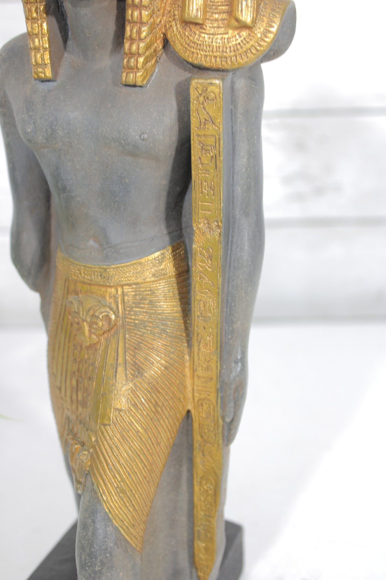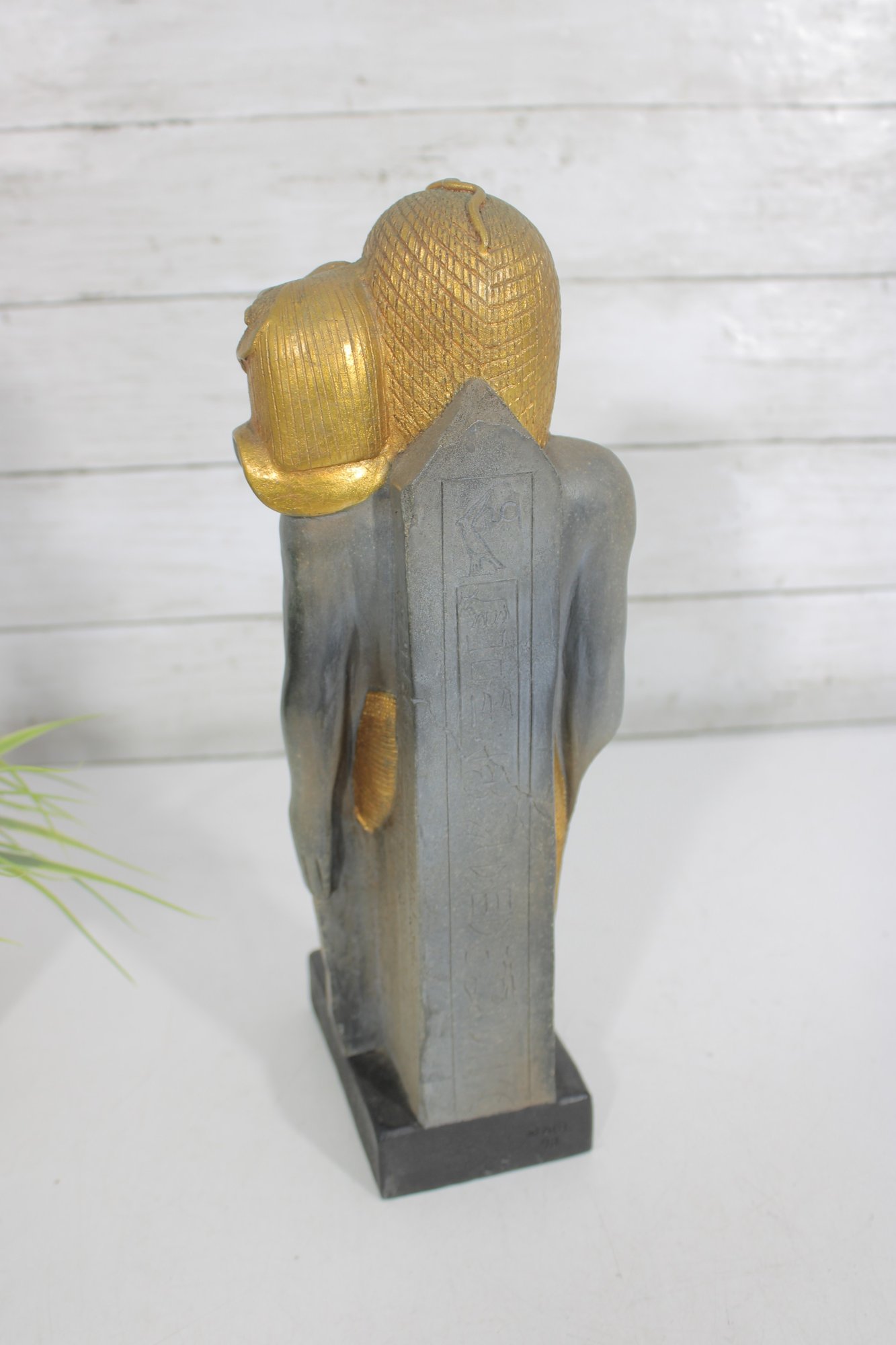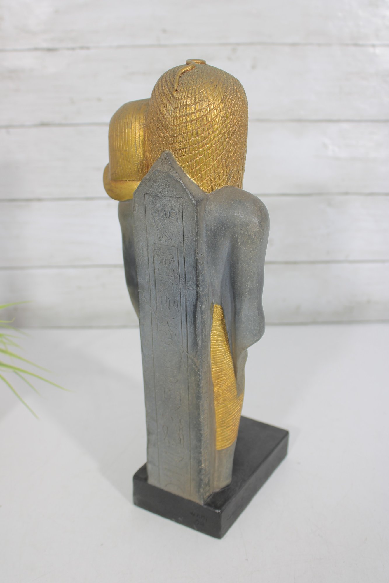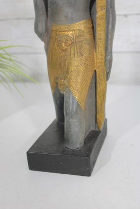 The figure is shown in traditional Egyptian stance with stylized features and carved hieroglyphic details along the back pillar. A symbolic staff or ceremonial element rises behind the figure, enhancing its historical and artistic presence. The gold accents contrast beautifully with the darker body, giving the piece a timeless, museum-inspired aesthetic.