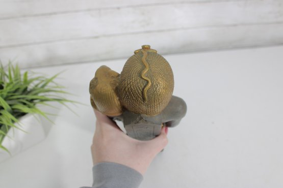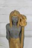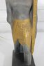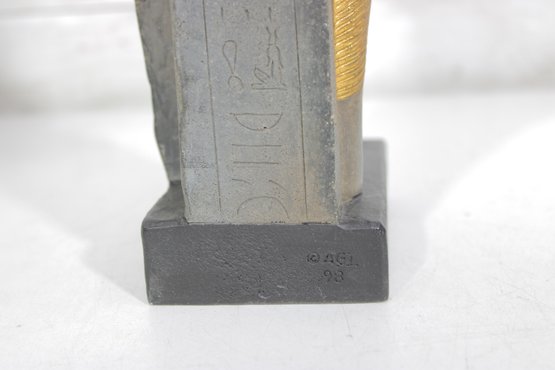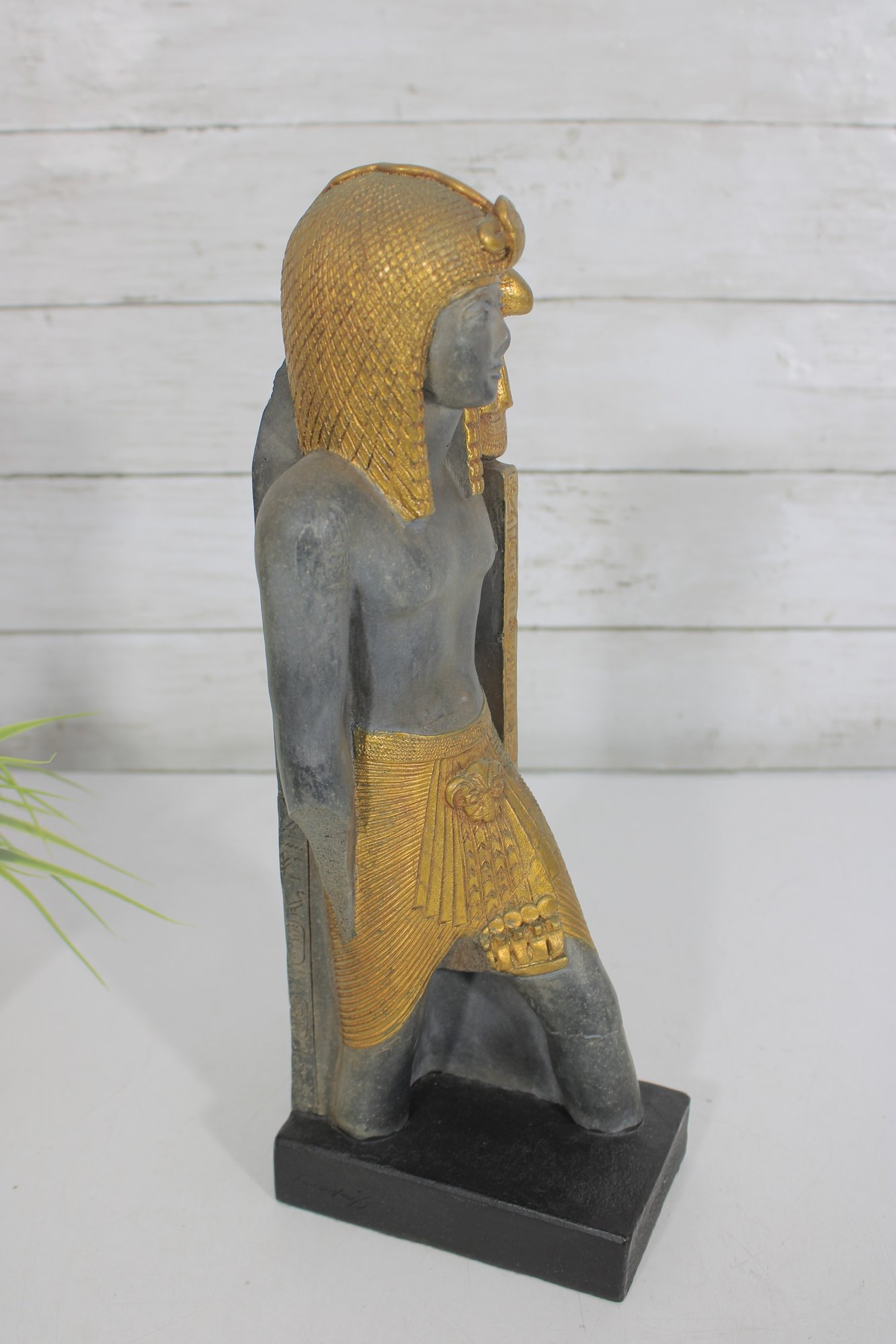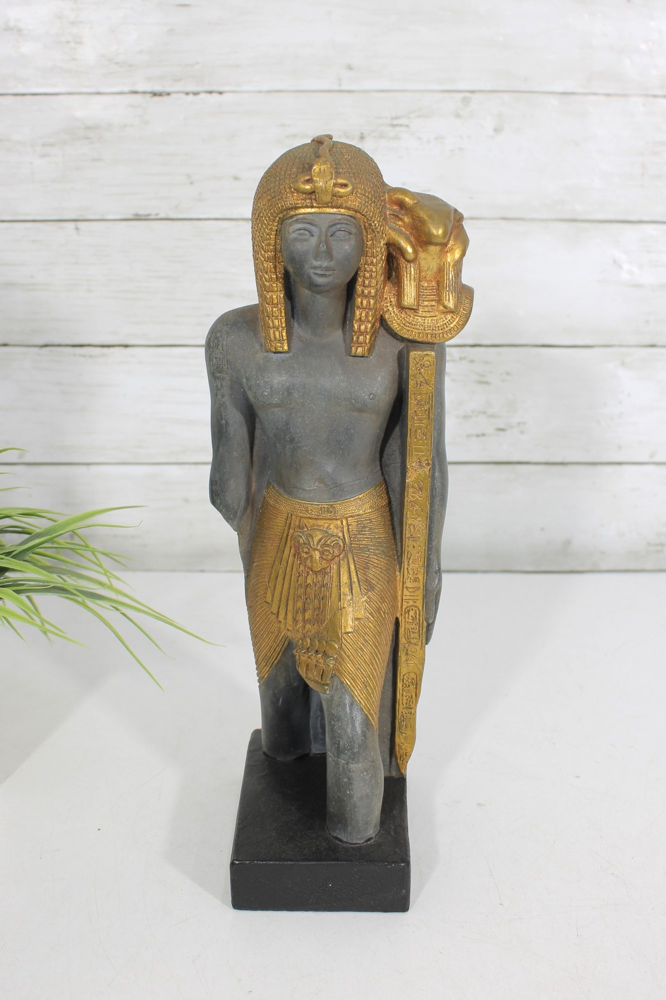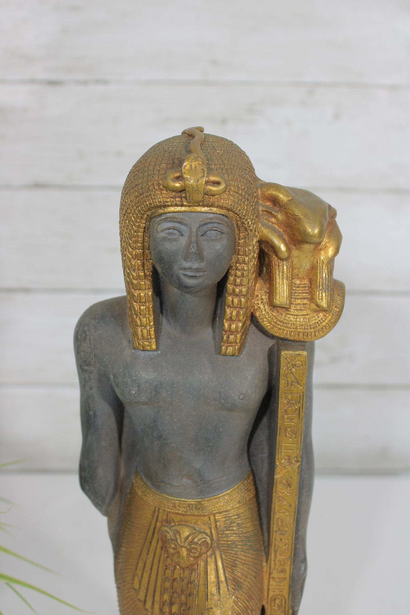 The figure is shown in traditional Egyptian stance with stylized features and carved hieroglyphic details along the back pillar. A symbolic staff or ceremonial element rises behind the figure, enhancing its historical and artistic presence. The gold accents contrast beautifully with the darker body, giving the piece a timeless, museum-inspired aesthetic.