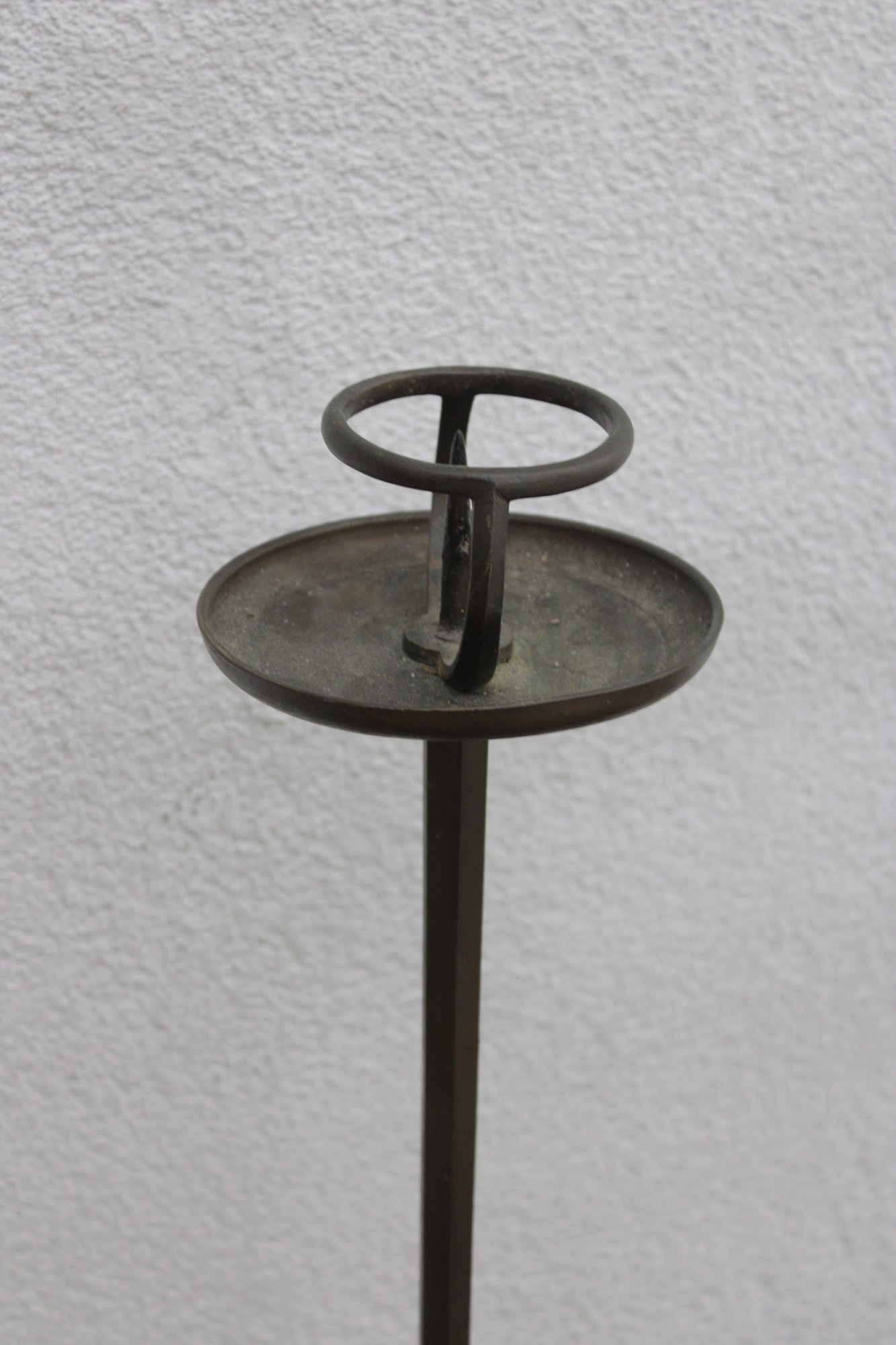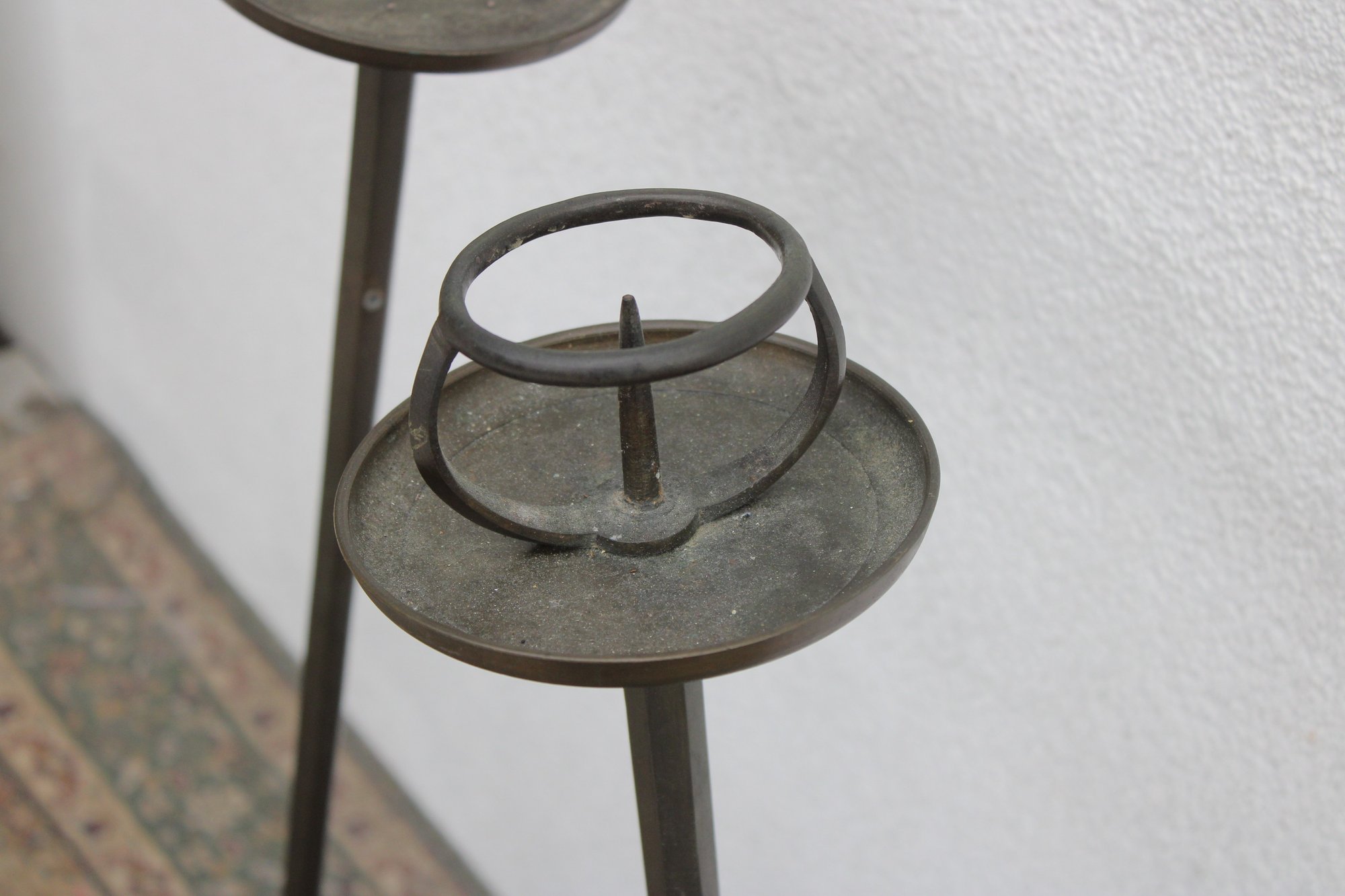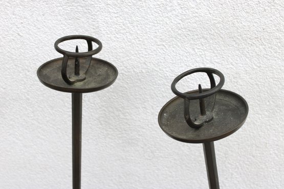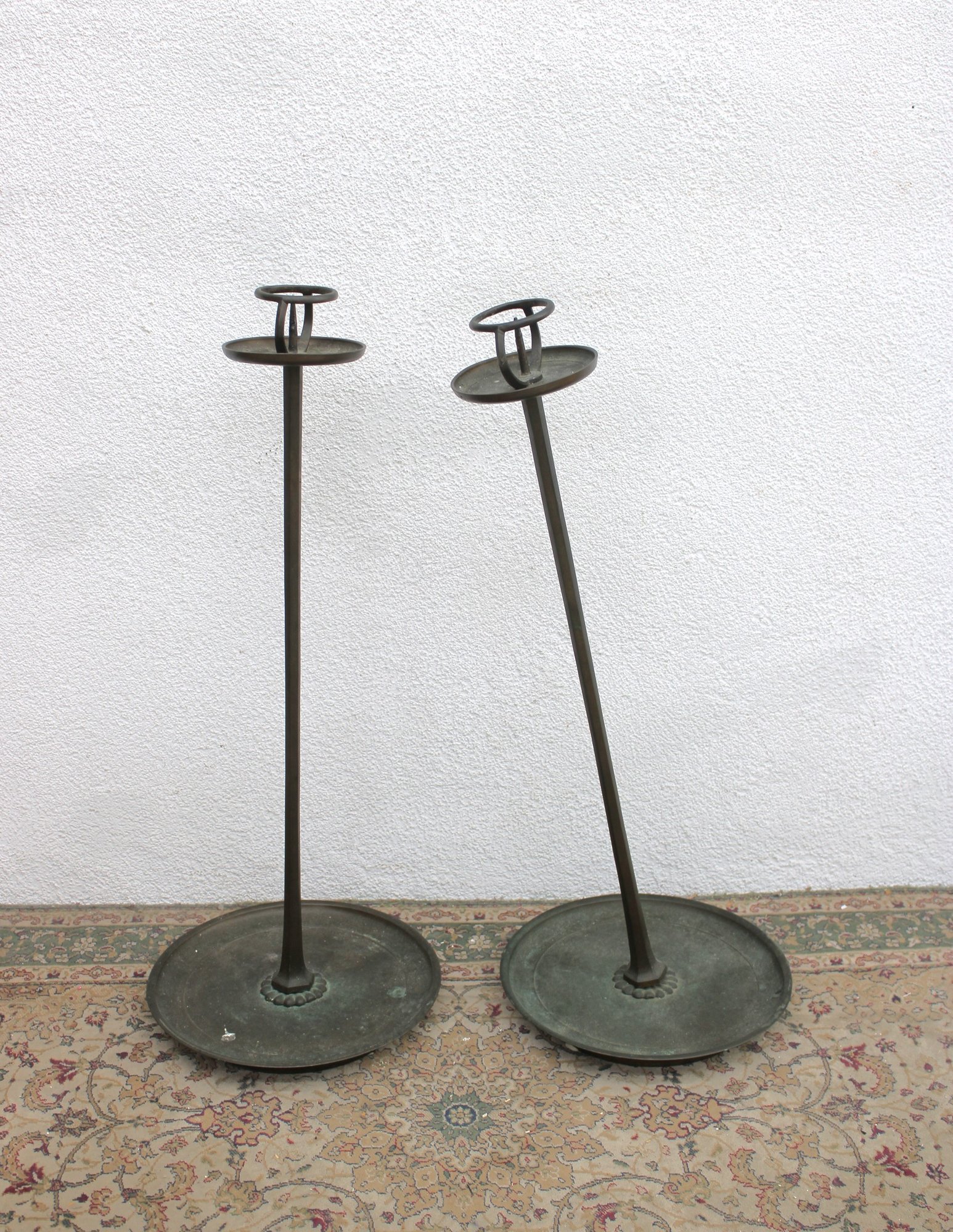 Each stand features a broad round base for stability, a slender upright shaft, and a raised candle platform with ring holder designed to support large candles. The bronze has developed a natural aged patina, giving the pieces a beautiful antique character.