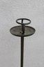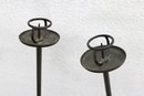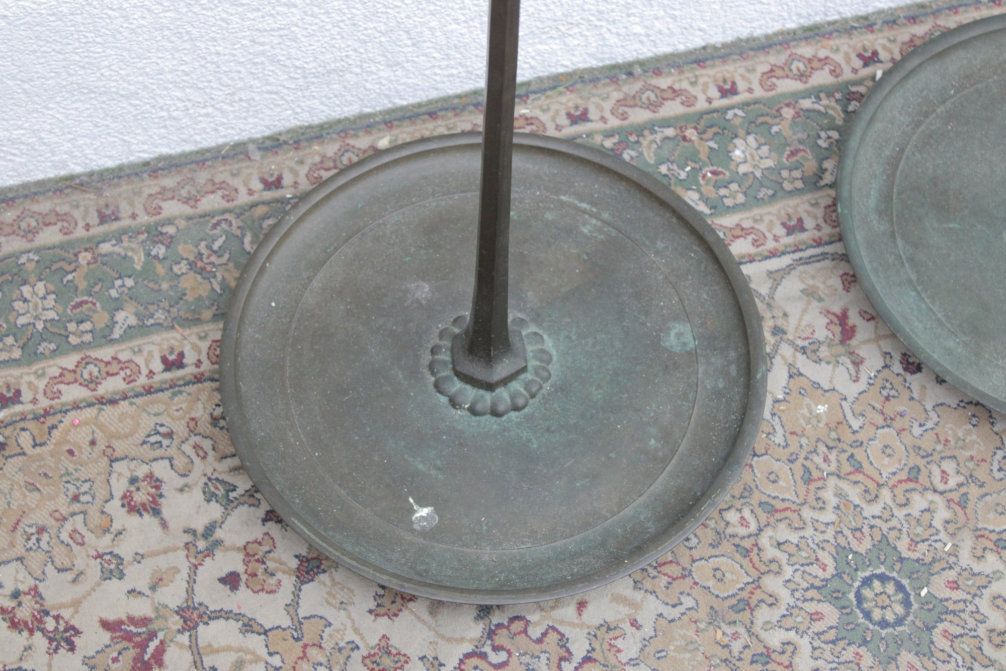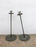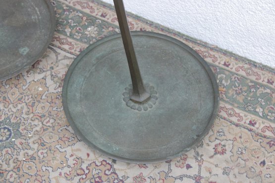 Pair of antique Japanese style bronze Shokudai candle stands, featuring elegant tall stems with wide circular bases and traditional candle holders at the top. These floor candle stands reflect the classic Japanese temple or ceremonial Shokudai design, known for their minimalist form and balanced proportions.